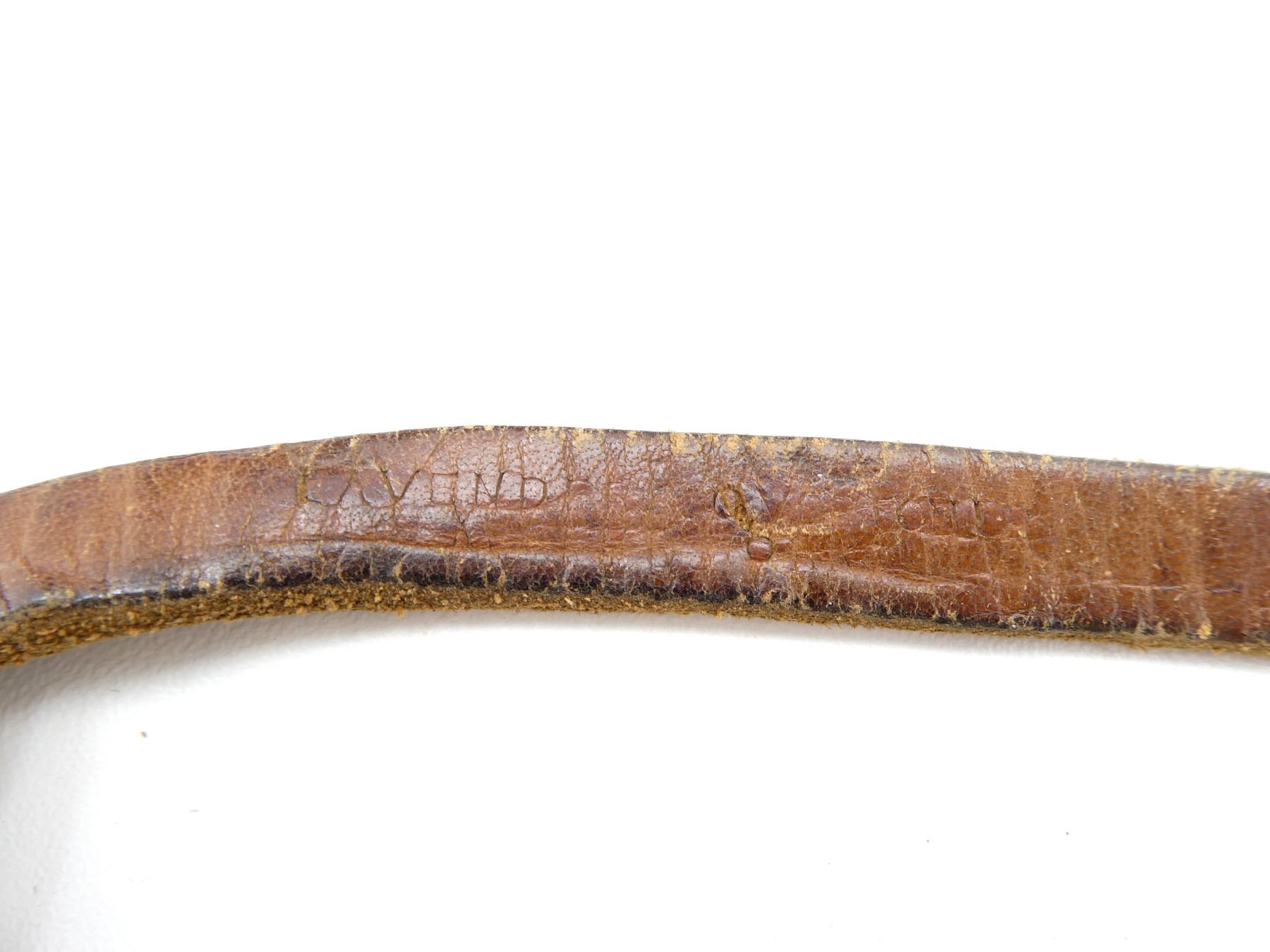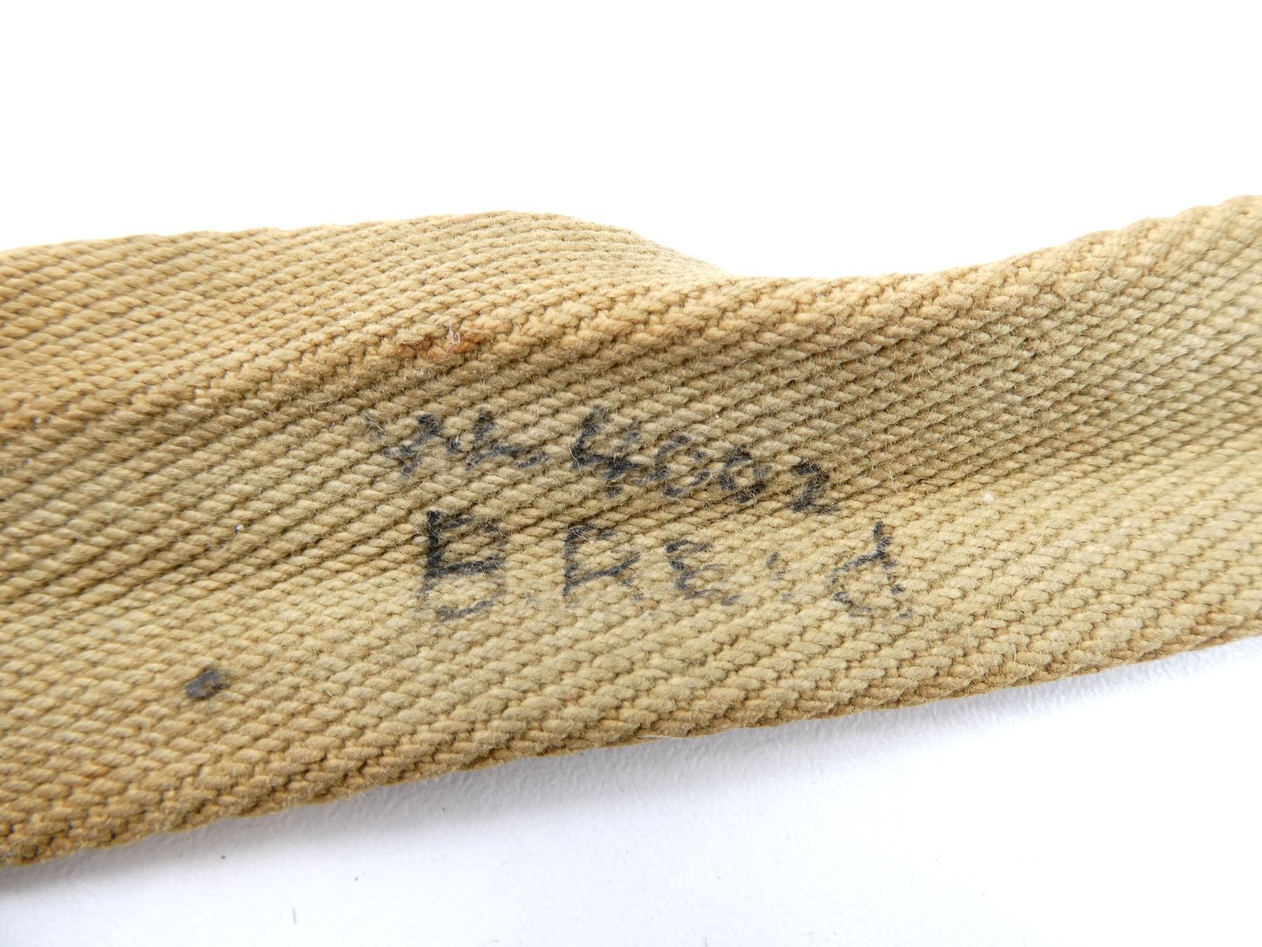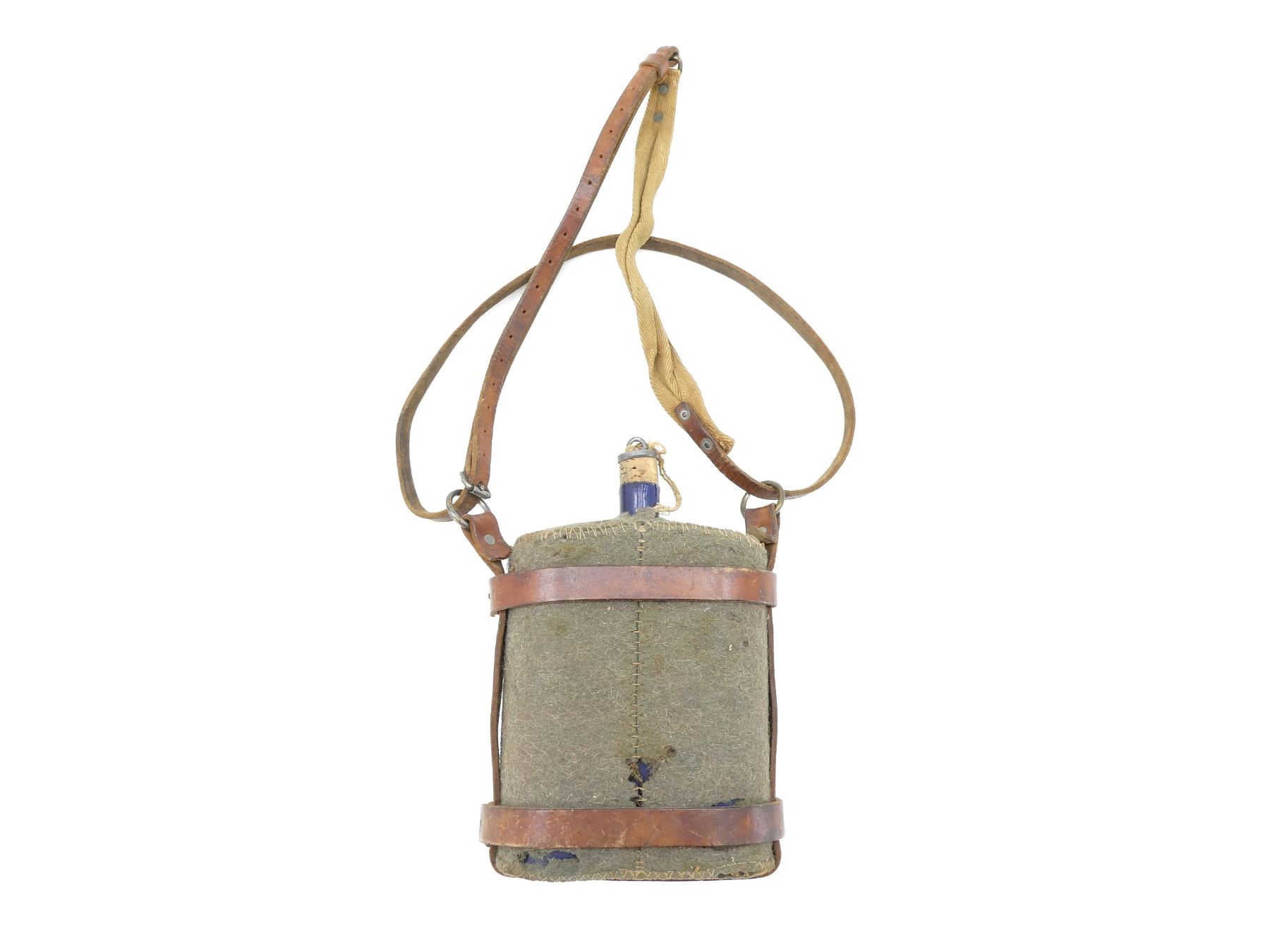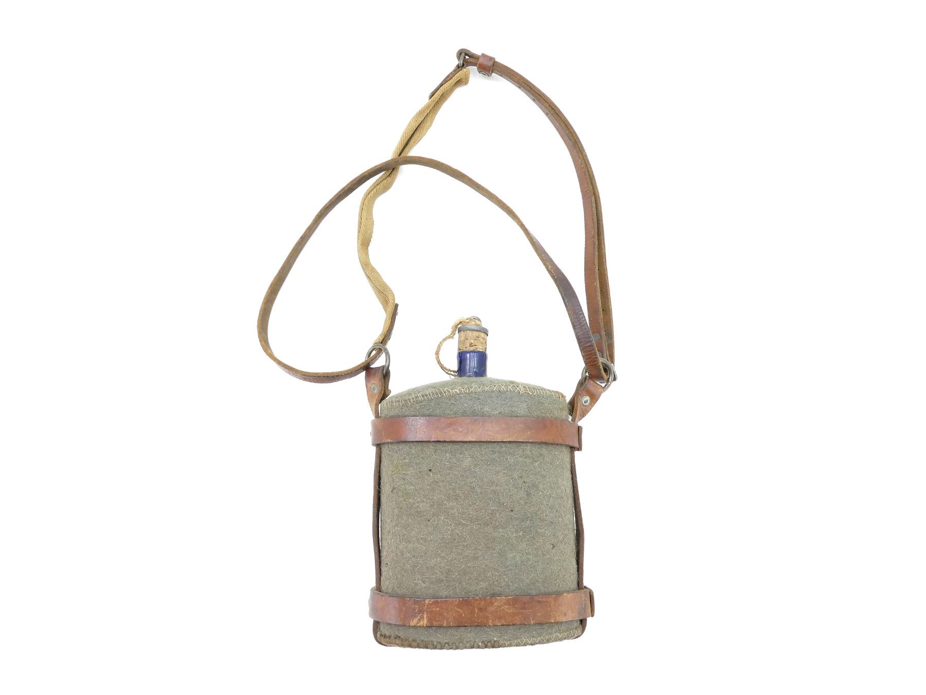 (1) WOOL / FELT COVERED BLUE ENAMELED METAL CANTEEN WITH CORK / METAL STOPPER, BROWN LEATHER CANTEEN HARNESS WITH LEATHER / CANVAS SHOULDER STRAP, STRAP MARKED: "LAVENDER OVERTON, ???? ?????", CANVAS PIECE HAND-WRITTEN MARKED: "W-4002, BREID", SHOWS AGE / WEAR (MOTH HOLES). SEE PHOTOS.