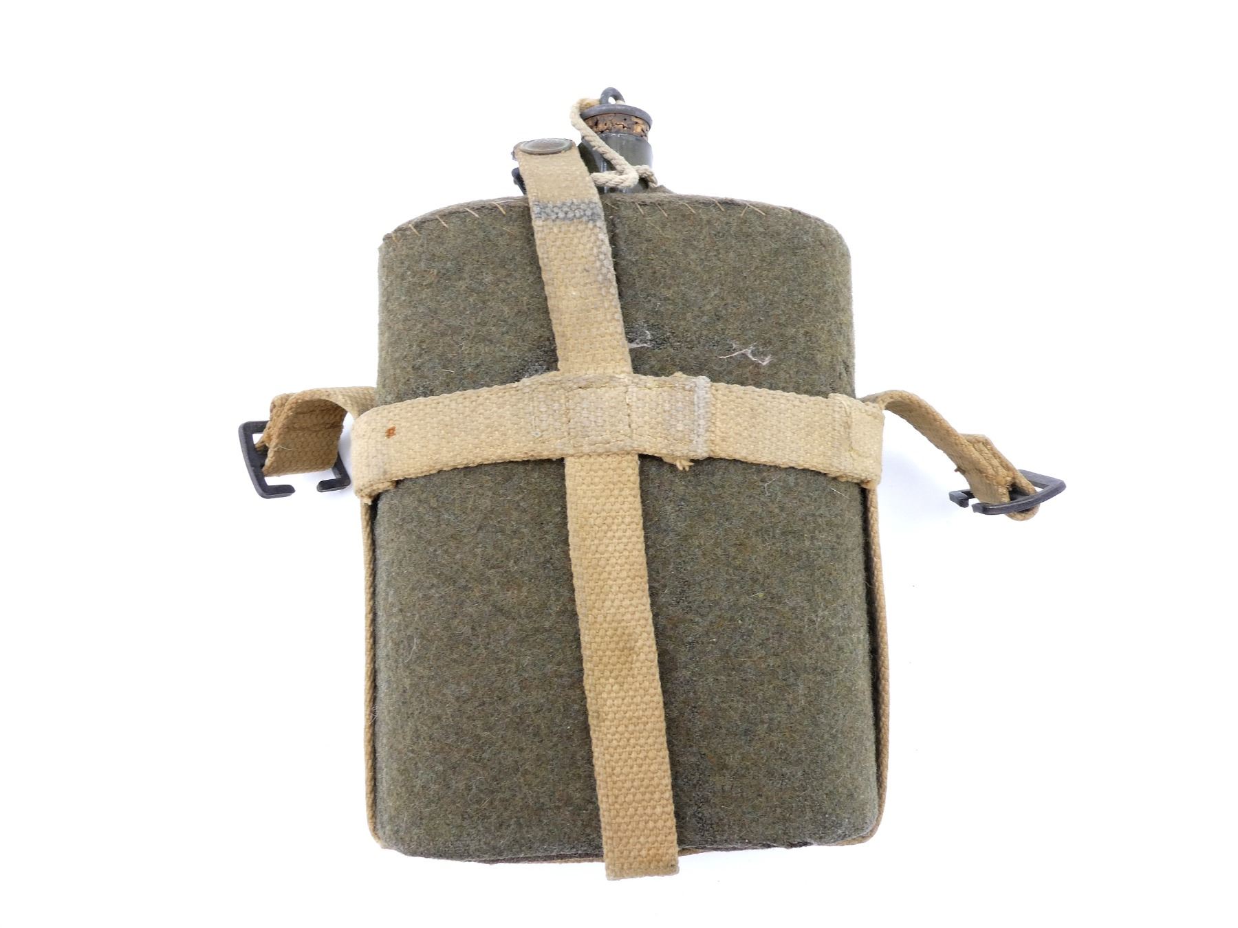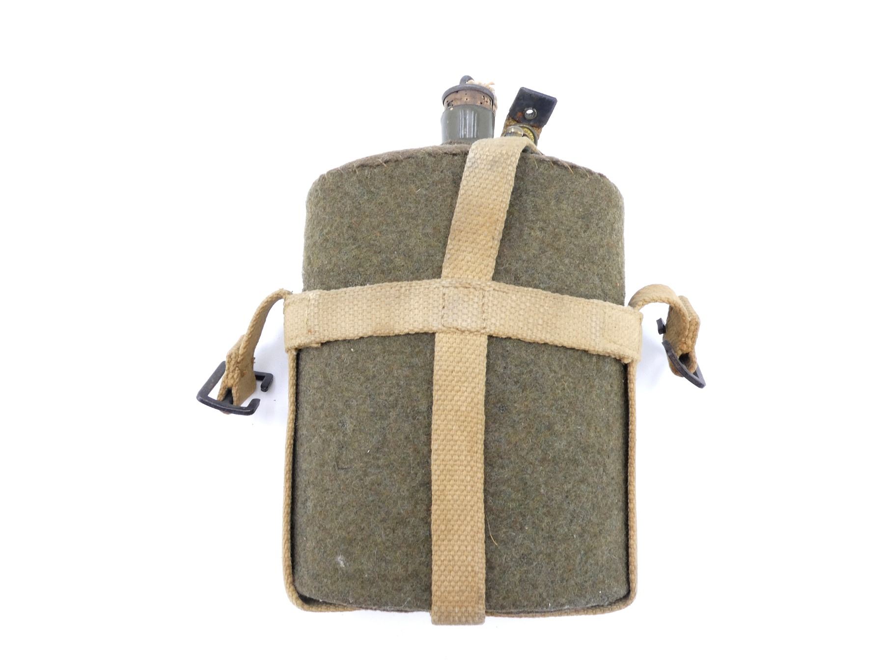 (1) WOOL / FELT COVERED GREEN ENAMELED METAL CANTEEN WITH CORK / METAL STOPPER, TAN P37 WEB SKELETON CARRIER MARKED: "J&A, H, LTD. 1953, NAABO??", STEEL / BRASS FITTINGS, SHOWS AGE / WEAR. SEE PHOTOS.