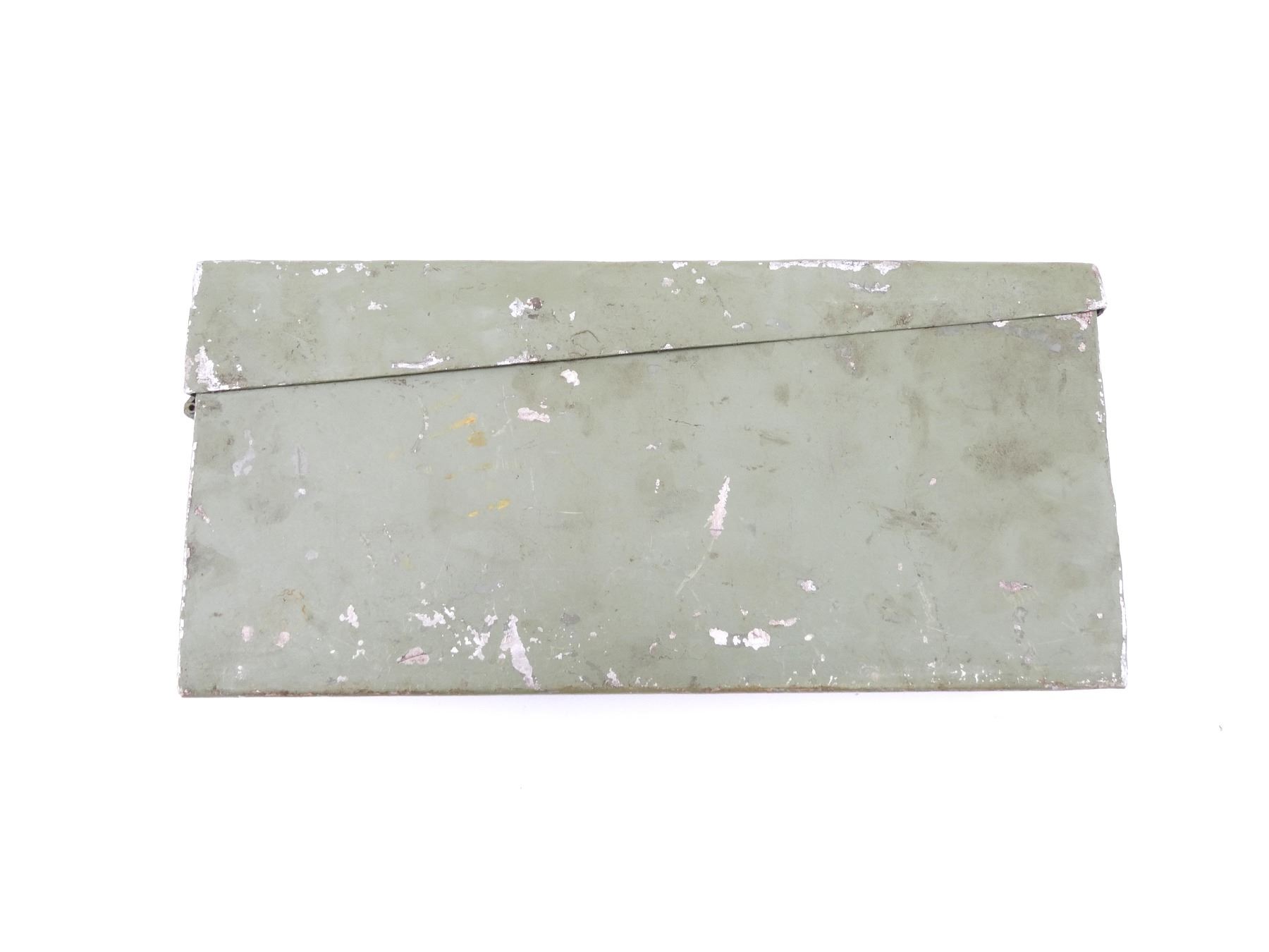 (1) GREEN PAINTED AMMO TIN WITH CARRY HANDLE, NO VISIBLE MARKINGS, GREASY, APPROX. 14.5" X 3.5" X 6.75". SEE PHOTOS.