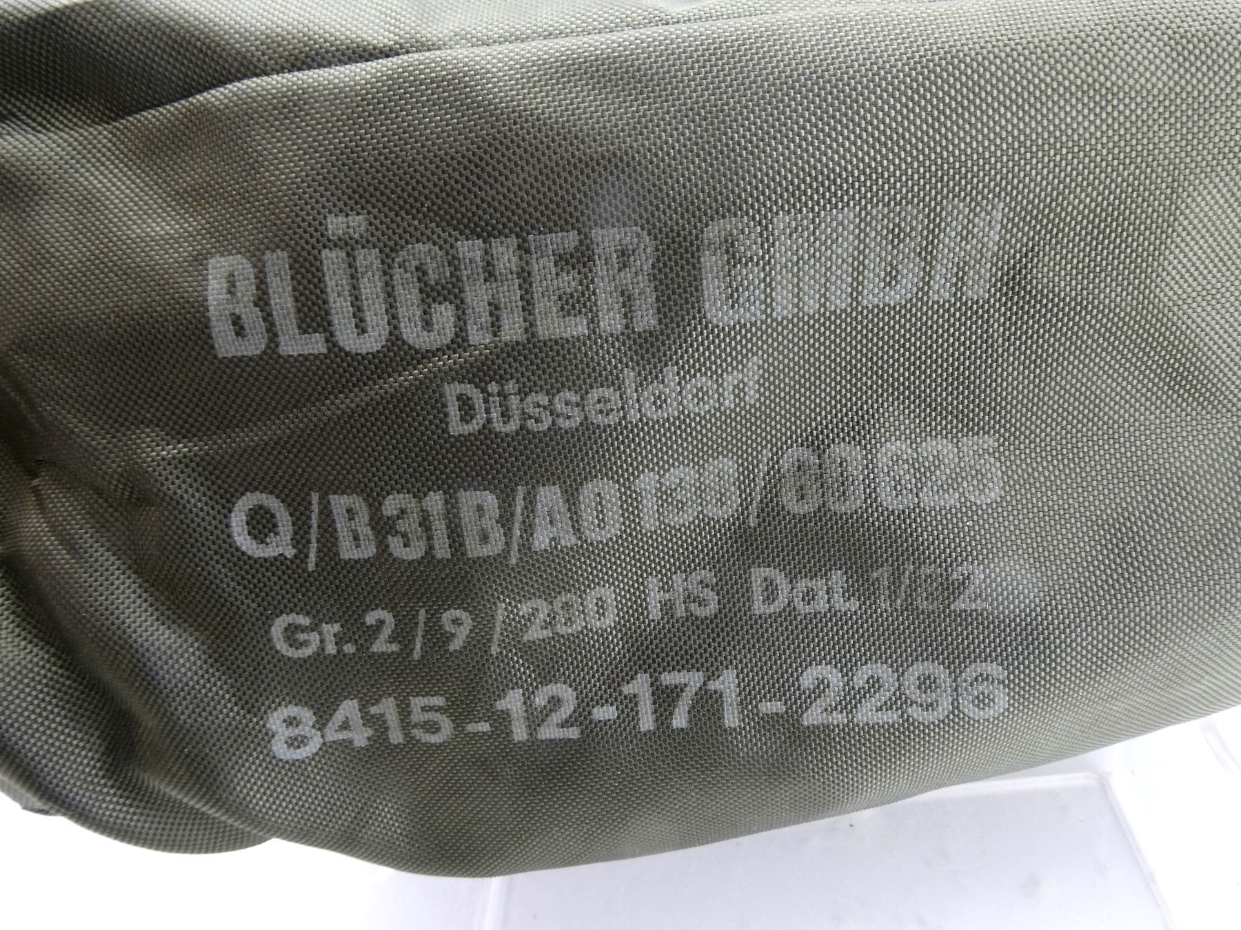 (1) GREEN NYLON, APPEARS NEW OLD STOCK, IN CARRIER BAG, BAG MARKED: "BLUCHER GMBH, DUSSELDORF, Q/B31B/A0138/80625, GR.2/9/280 HS DAT. 1/82, 8415-12-171-2298". SEE PHOTOS.