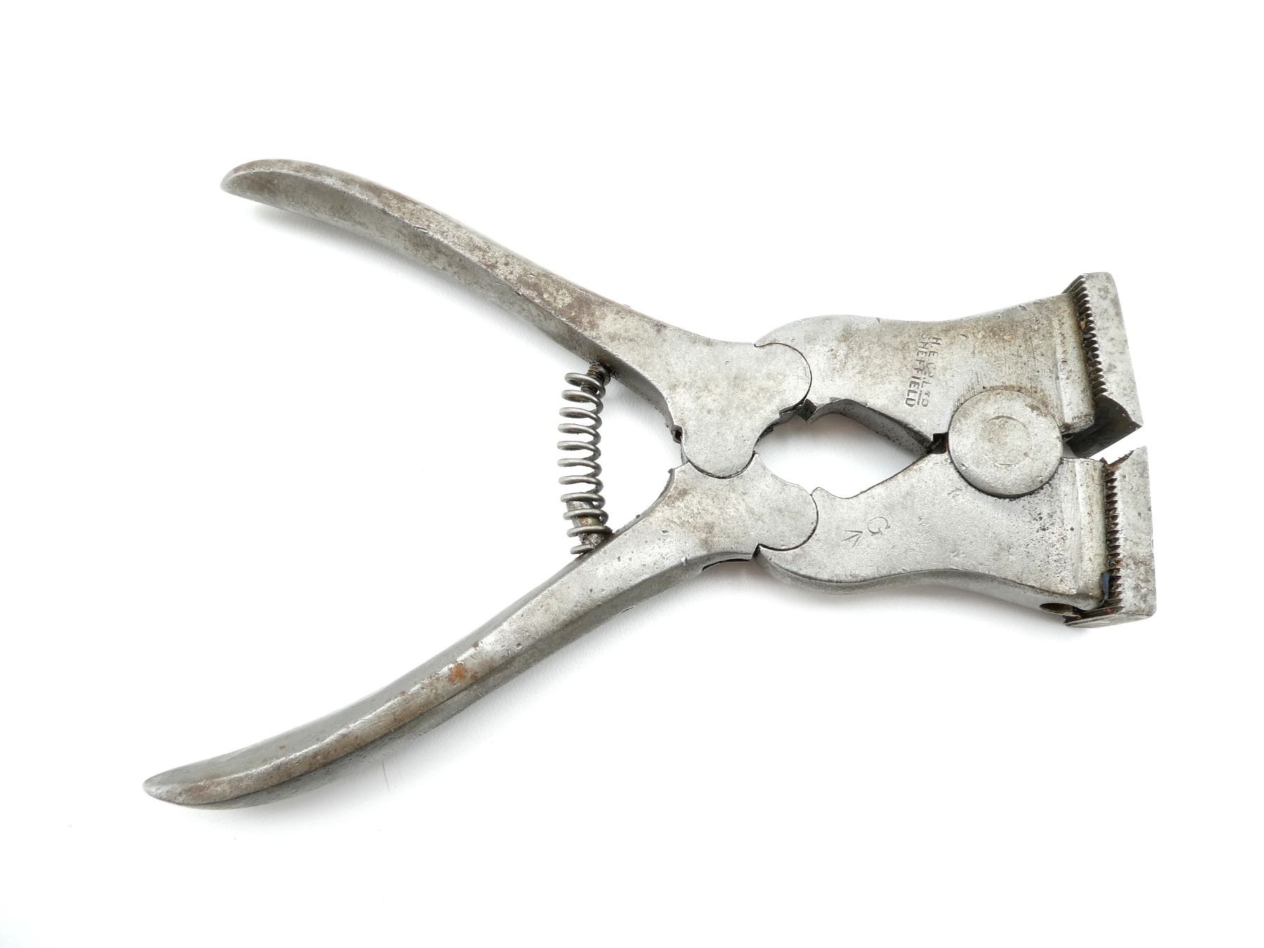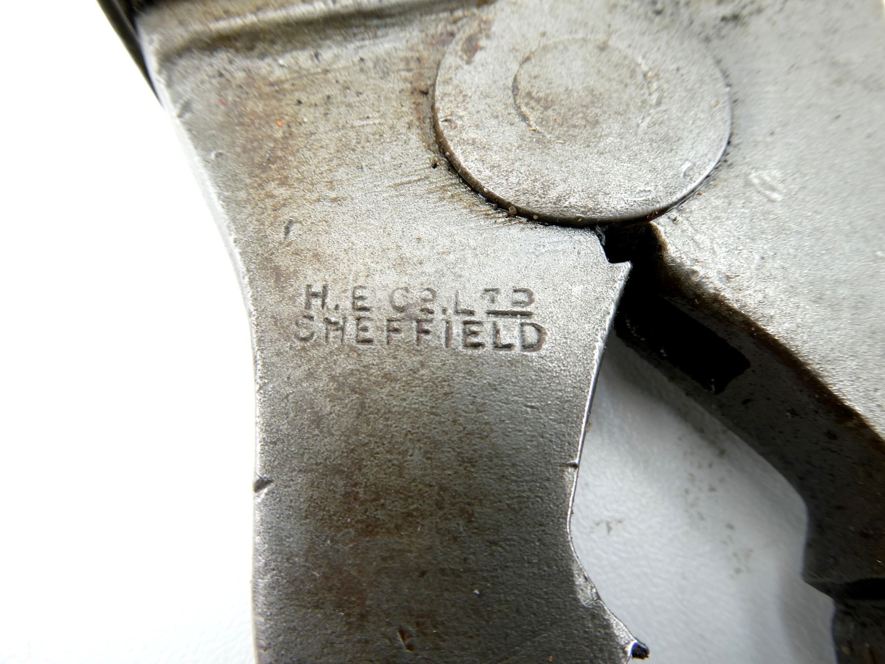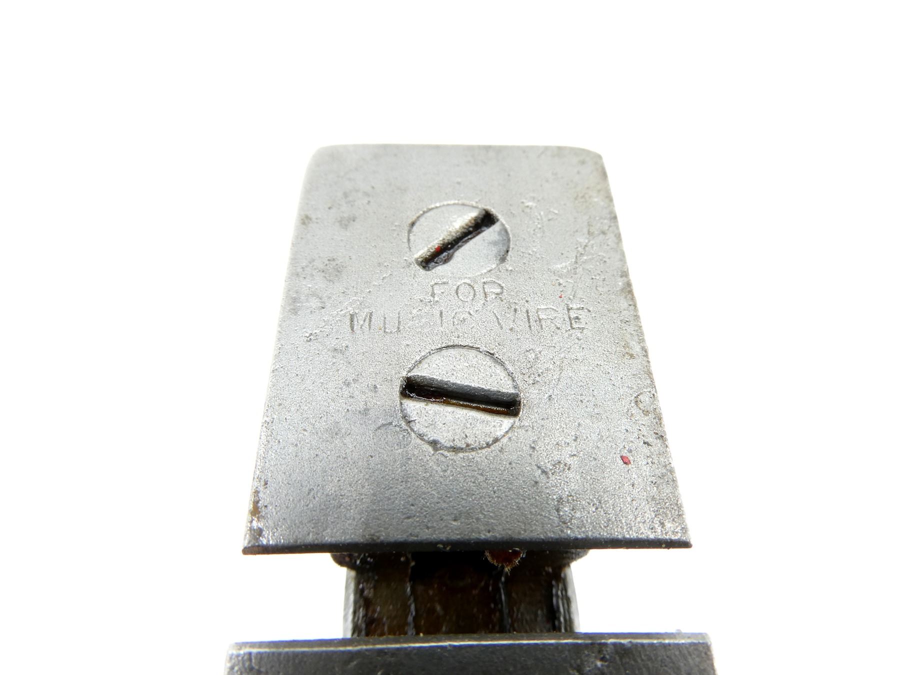 (1) PAIR OF STEEL WIRE CUTTERS, MARKED: "FOR MUSIC WIRE", "H.E.CO.LTD, SHEFFIELD" & "G" OVER BROAD ARROW, OVERALL LENGTH APPROX. 7". SEE PHOTOS.