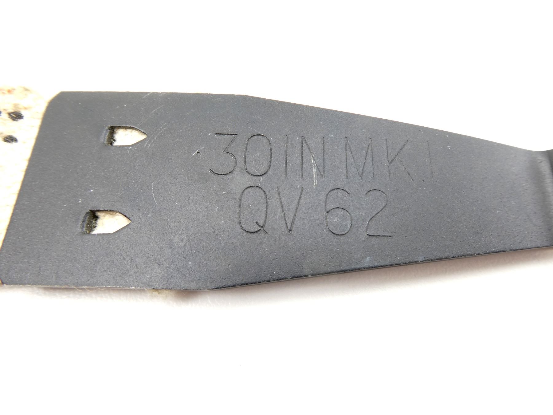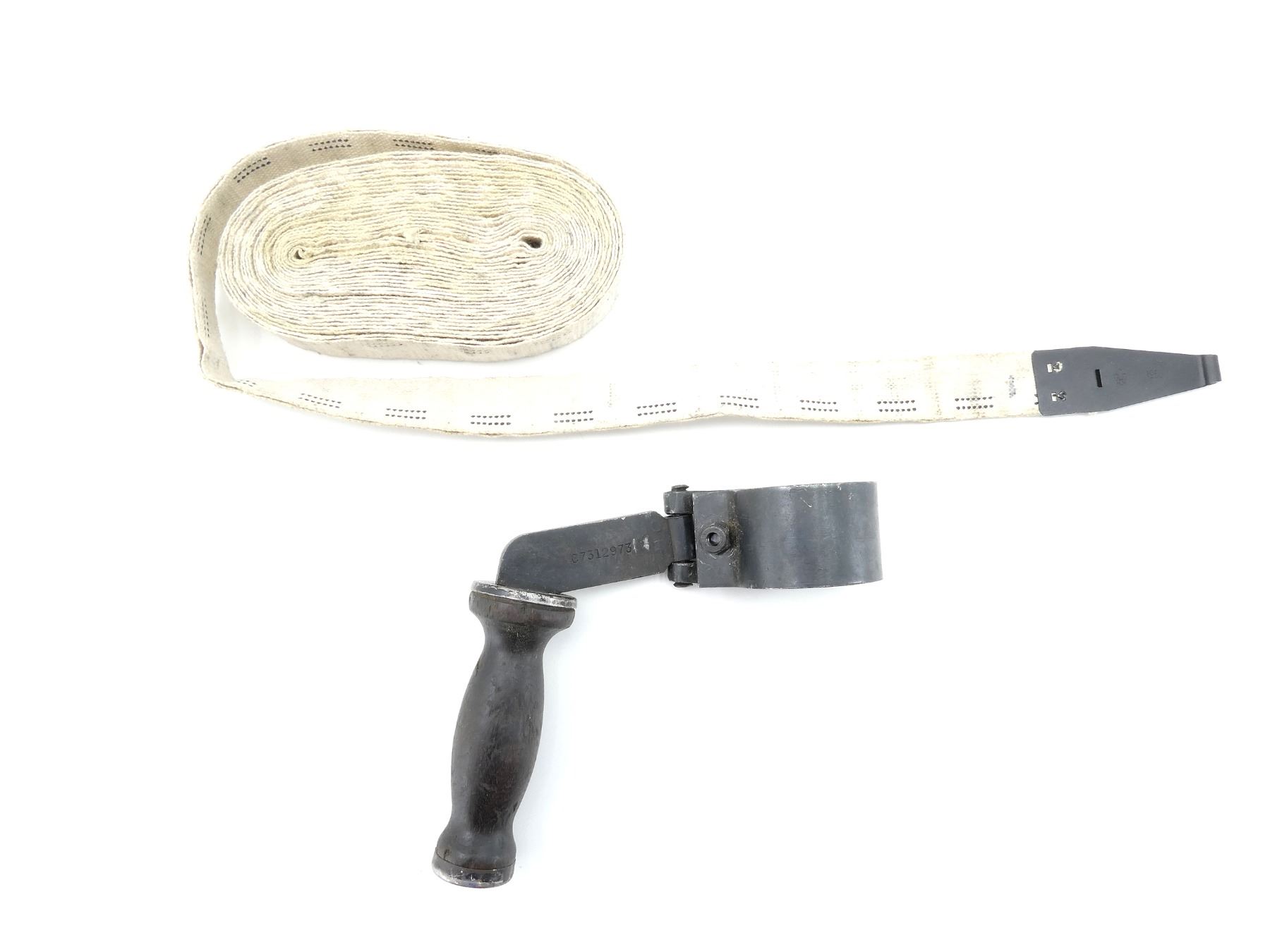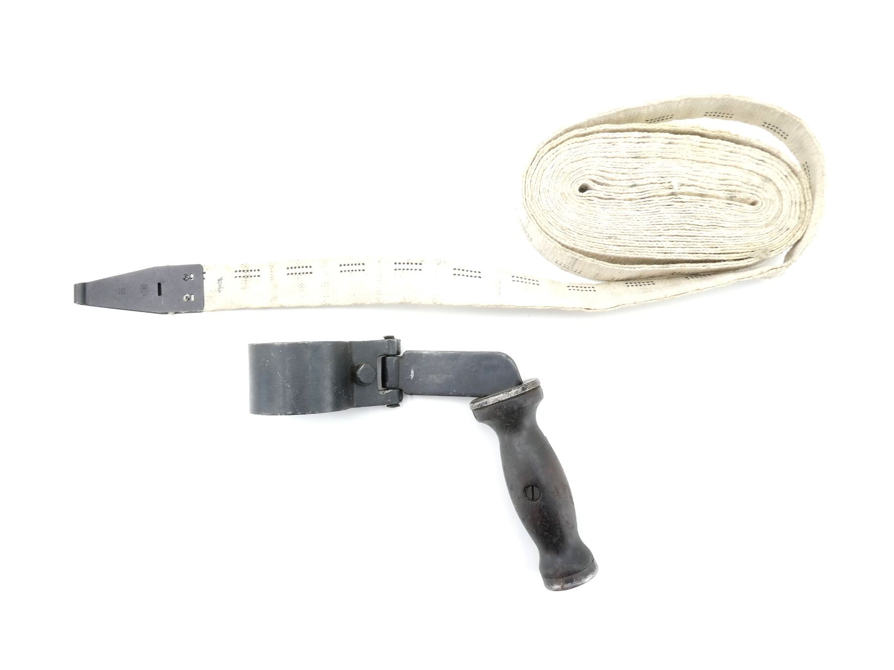 LOT INCLUDES; (1) BROWNING 1919 MG CLOTH BELT, 250-RNDS, STARTER TAB MARKED: "30IN MKI, QV 62", OTHER-SIDE WITH FLEUR DE LIS "1965", VARIOUS MARKINGS ON BELT & (1) BROWNING 1919 MG CARRYING HANDLE, WOOD / METAL CONSTRUCTION, MARKED: "C7312973". SEE PHOTOS.