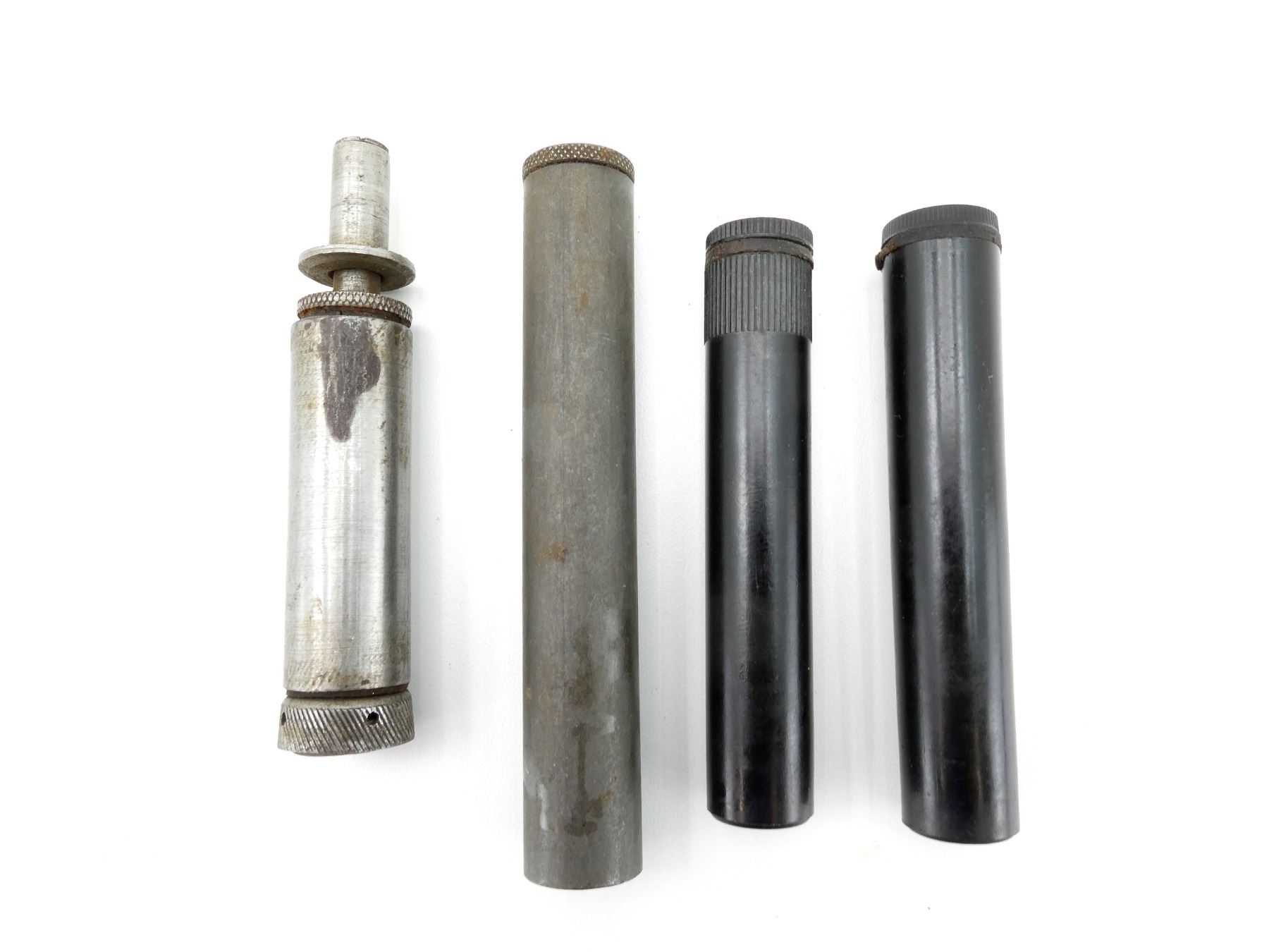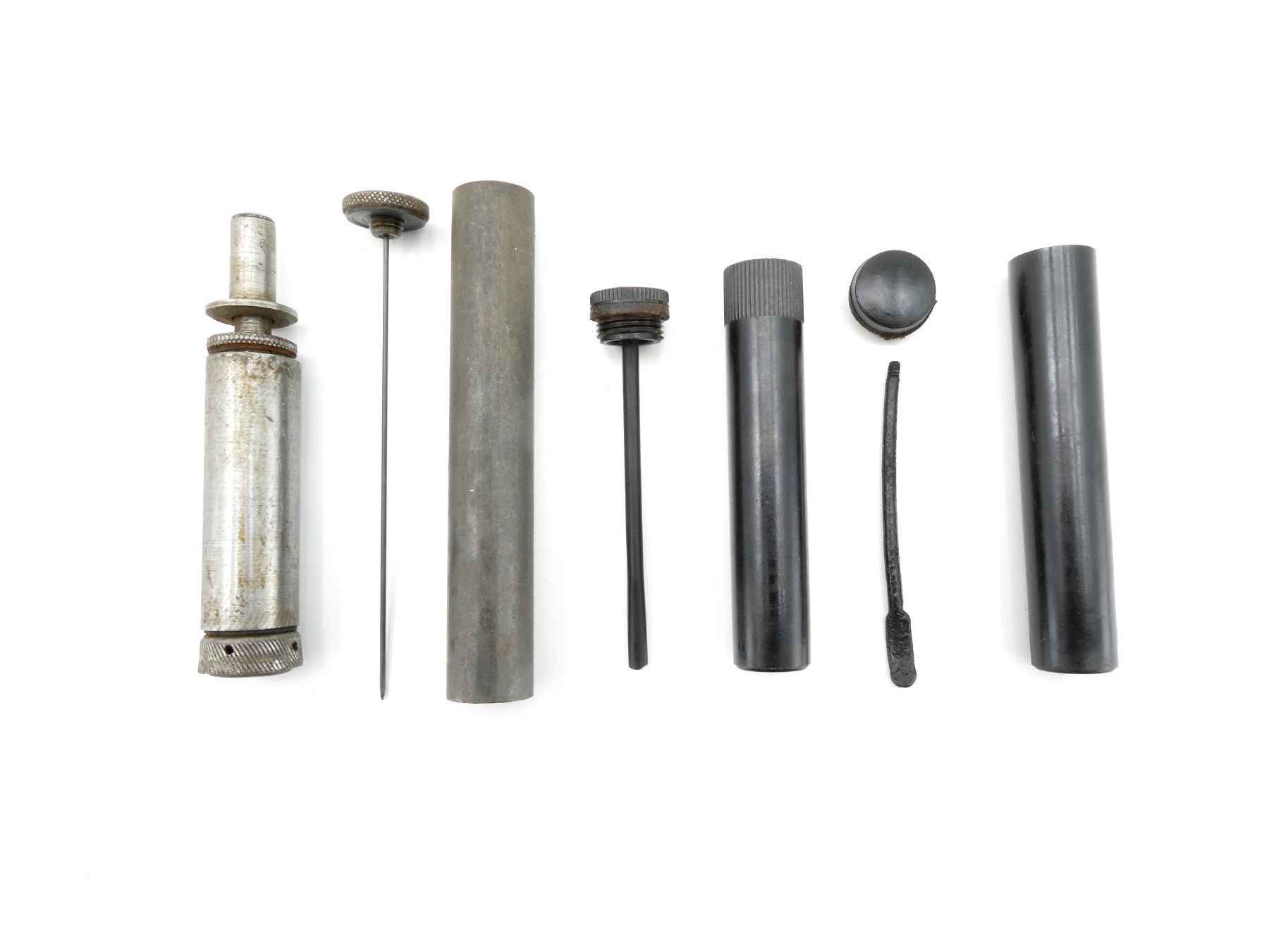 LOT INCLUDES; (1) U.S. MILITARY THOMPSON SMG OILER, STEEL WITH CAP / WIRE DIPPER, NO VISIBLE MARKINGS, OVERALL LENGTH APPROX. 4 5/8", (1) GERMAN K98 STYLE OILER, BOTTOM IS DAMAGED, NO VISIBLE MARKINGS, OVERALL LENGTH APPROX. 4 1/8" & (2) BLACK POLYMER OILERS, ONE WITH SPOON NO LONGER ATTACHED TO CAP, ONE WITH BROKEN SPOON TIP, OALS APPROX. 3.75" & 4". SEE PHOTOS.