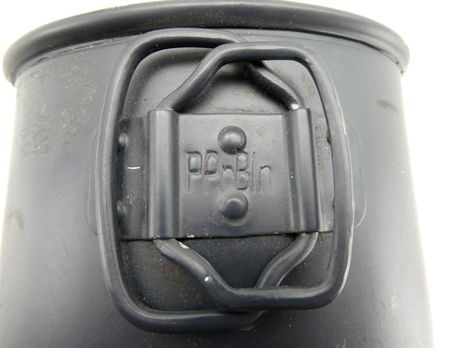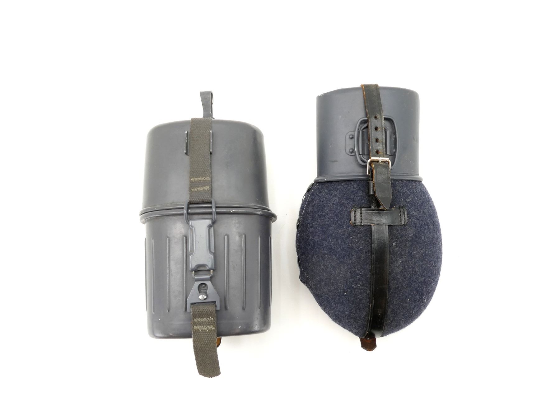 LOT INCLUDES; (1) WEST BERLIN POLICE 1L CANTEEN WITH CUP, BLUEISH GREY FELT CANTEEN COVER WITH SNAP CLOSURE, BLUEISH GREY PAINTED CANTEEN CUP MARKED: "PPRBLN", FOLDING HANDLES, BLACK LEATHER STRAPPING TO HOLD TOGETHER WITH METAL CLIP FOR BELT, NO VISIBLE MARKINGS, TEAR ON STRAP NEAR BOTTOM OF CANTEEN & (1) BUNDESWEHR ARMY CANTEEN, BLUEISH GREY PAINTED, FOLDING HANDLE, NO VISIBLE MARKINGS, GREY CANVAS / LEATHER STRAPPING TO HOLD TOGETHER, NO VISIBLE MARKINGS, METAL FITTINGS. SEE PHOTOS.