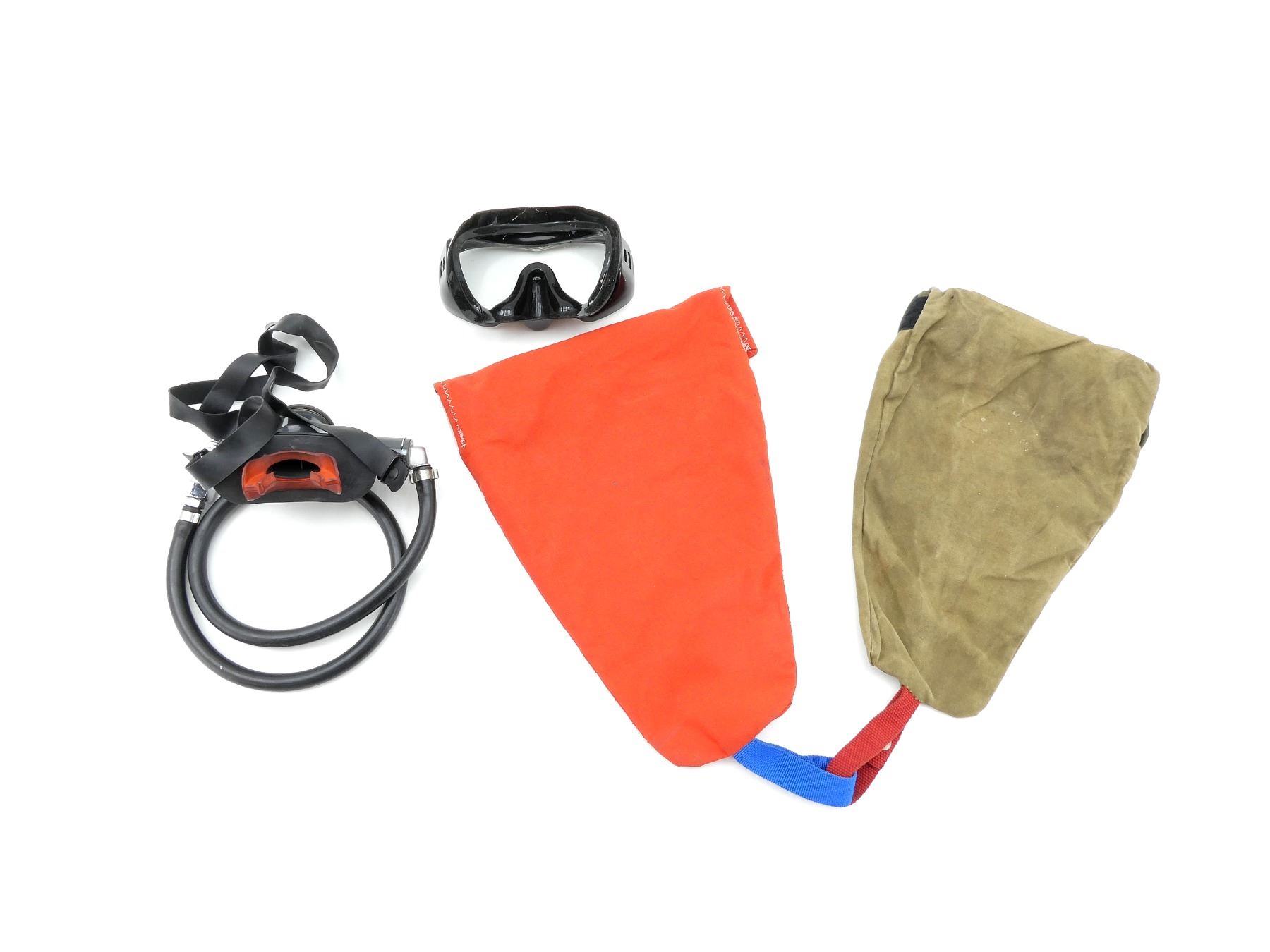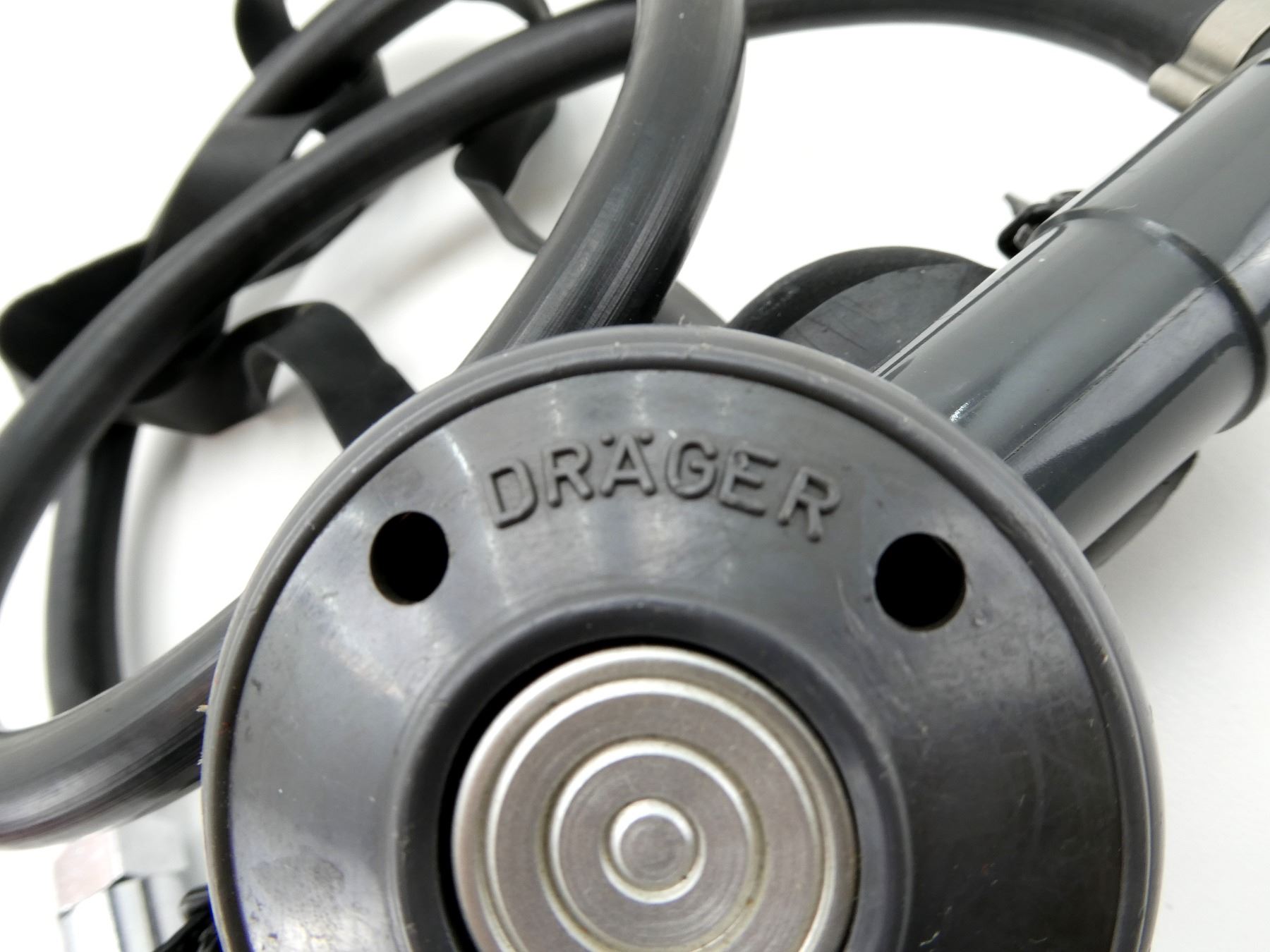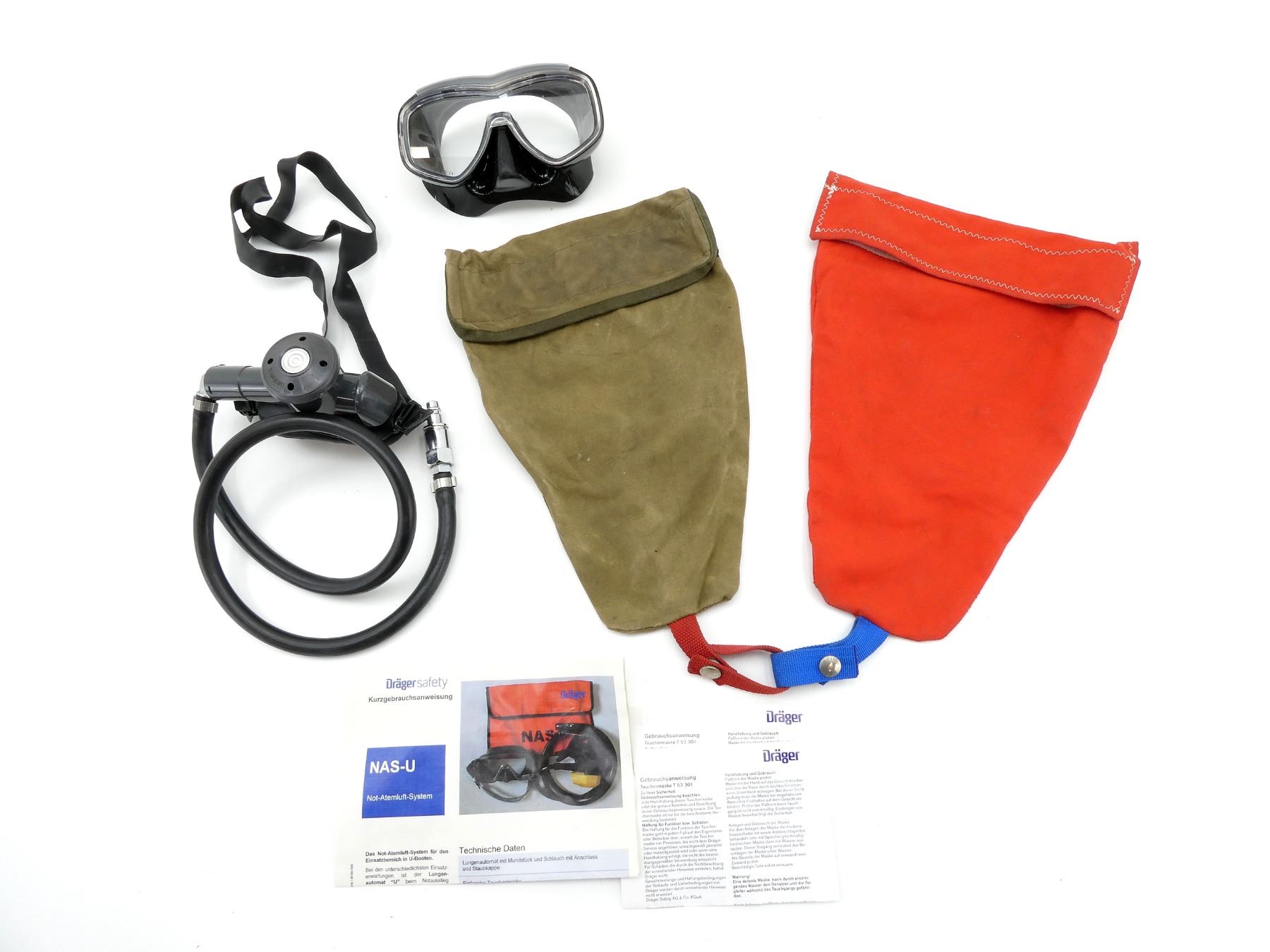 EMERGENCY OXYGEN SYSTEM FOR USE IN SUBMARINES WHEN AIR IS NOT BREATHABLE INSIDE, LOT INCLUDES; (1) PAIR OF RUBBER / PLASTIC GOGGLES, MARKED: "DRAGER", MISSING HEAD STRAP, PLASTIC EYE PIECE, INTACT, (1) OXYGEN MOUTH PIECE / HOSE, BLACK RUBBER HOSE, RUBBER / PLASTIC MOUTH PIECE, MARKED: "DRAGER", WITH HEAD STRAP, KIT COMES WITH VARIOUS INSTRUCTIONAL SHEETS & (2) KIT CARRIERS / BAGS, ONE RED FABRIC, ONE TAN CANVAS, VELCRO CLOSURE, STRAP ON BOTTOM, ONE SHOWS AGE / WEAR, NO VISIBLE MARKINGS. SEE PHOTOS.
