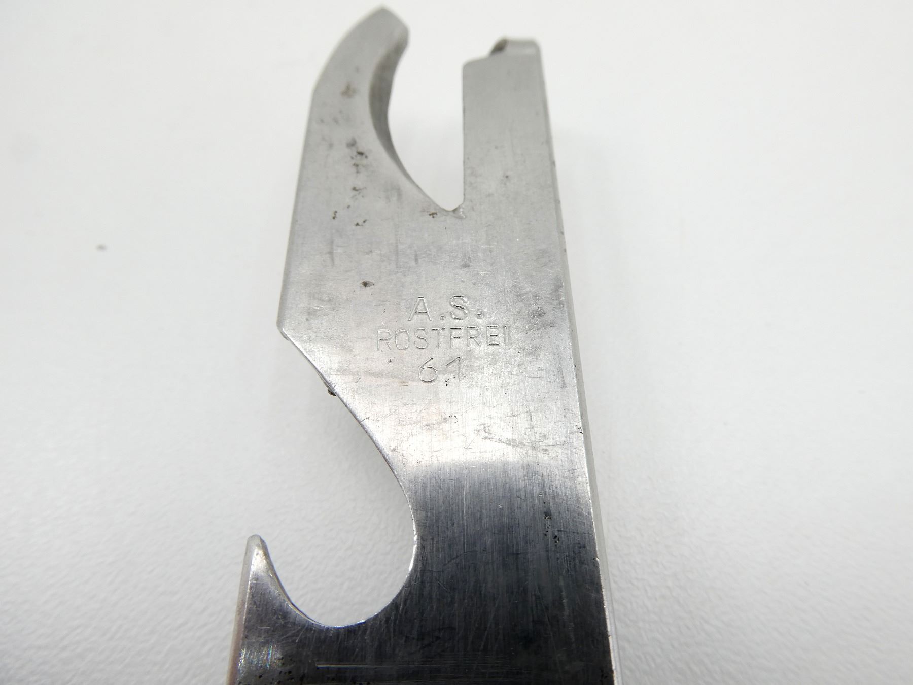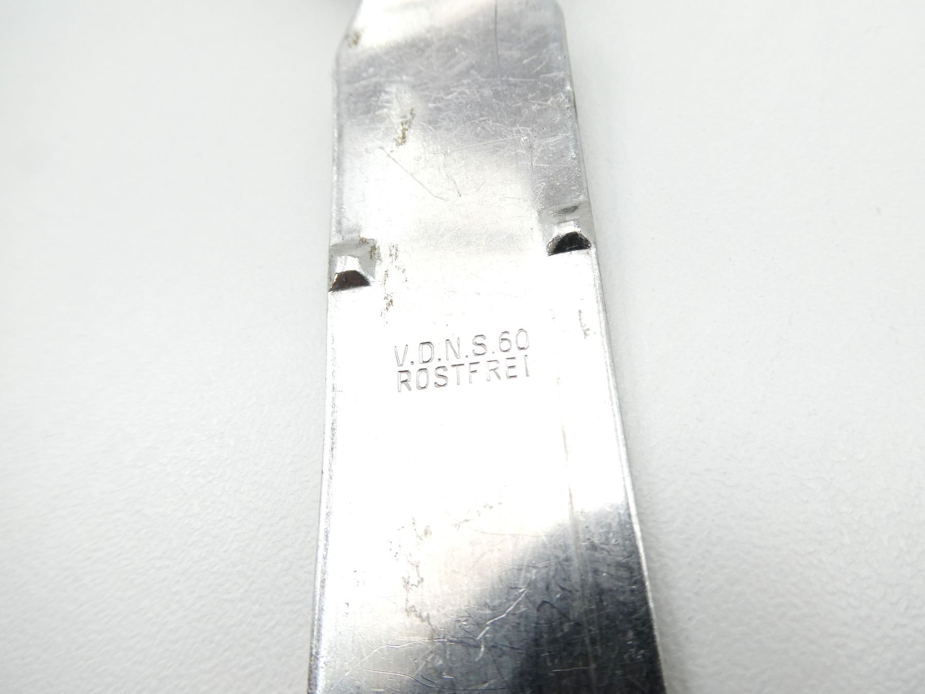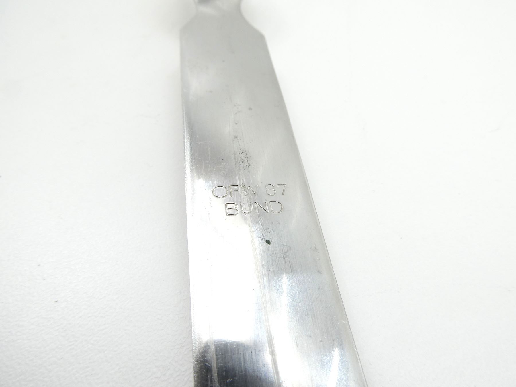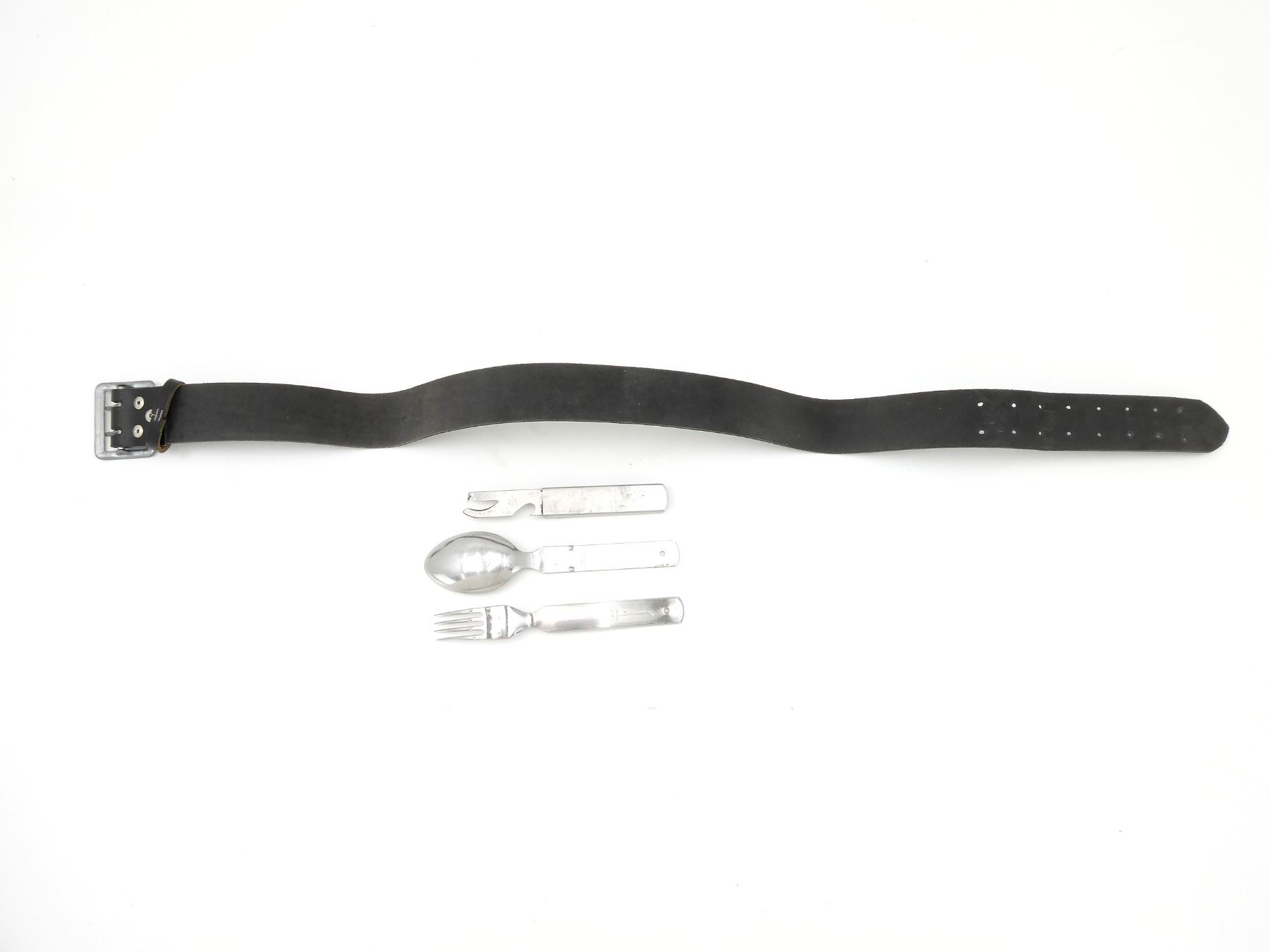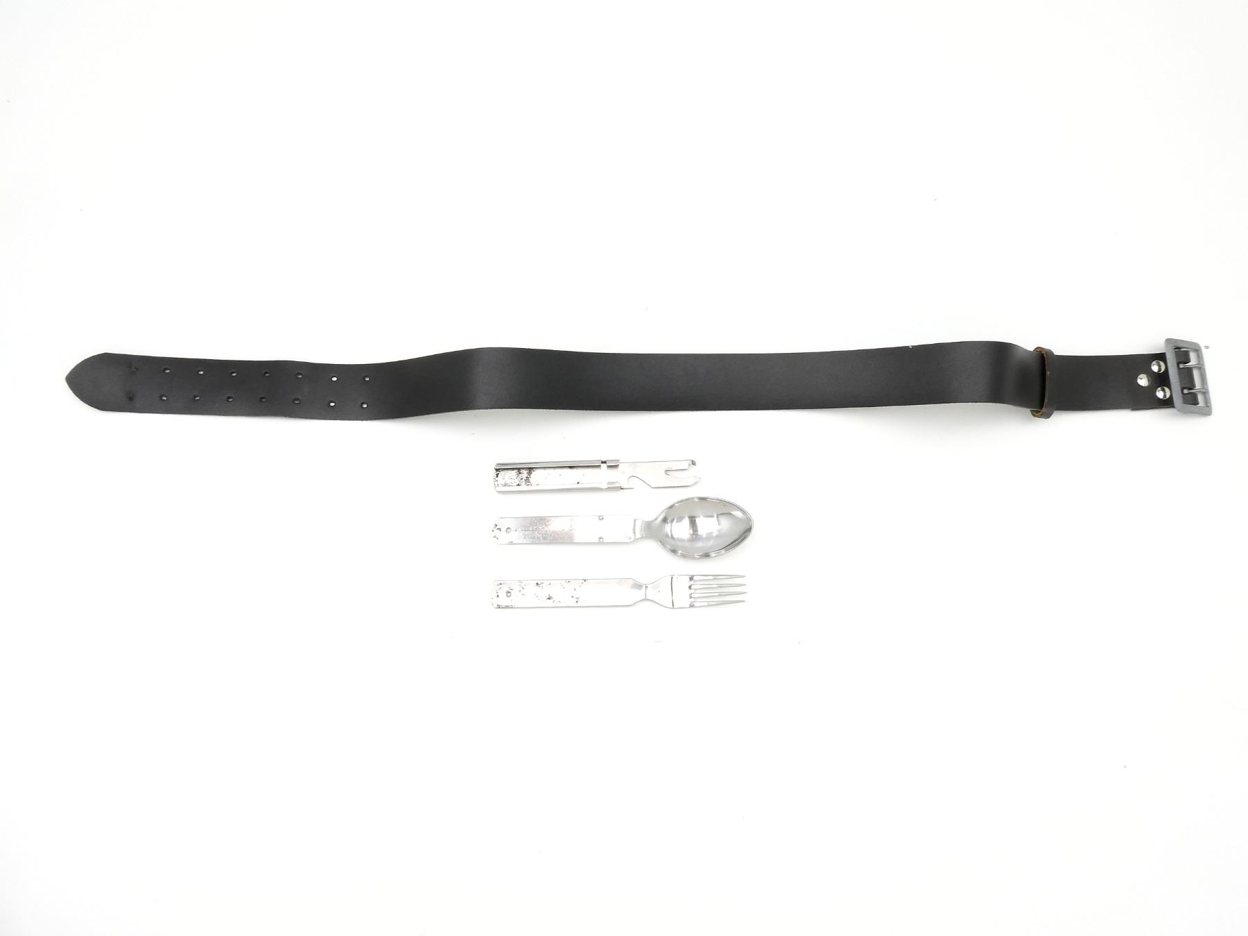 LOT INCLUDES; (1) BUNDESWEHR FORK, SPOON & CAN OPENER, SPOON MARKED: "V.D.N.S. 60, ROSTFREI", FORK MARKED: "OFW 87, BUND", CAN OPENER MARKED: "A.S., ROSTFREI, 61" & (1) BUNDESWEHR BLACK LEATHER OFFICER'S WAIST BELT, PEBBLED METAL BUCKLE, NO VISIBLE MARKINGS, OVERALL LENGTH APPROX. 36.75", ADJUSTABLE. SEE PHOTOS.
