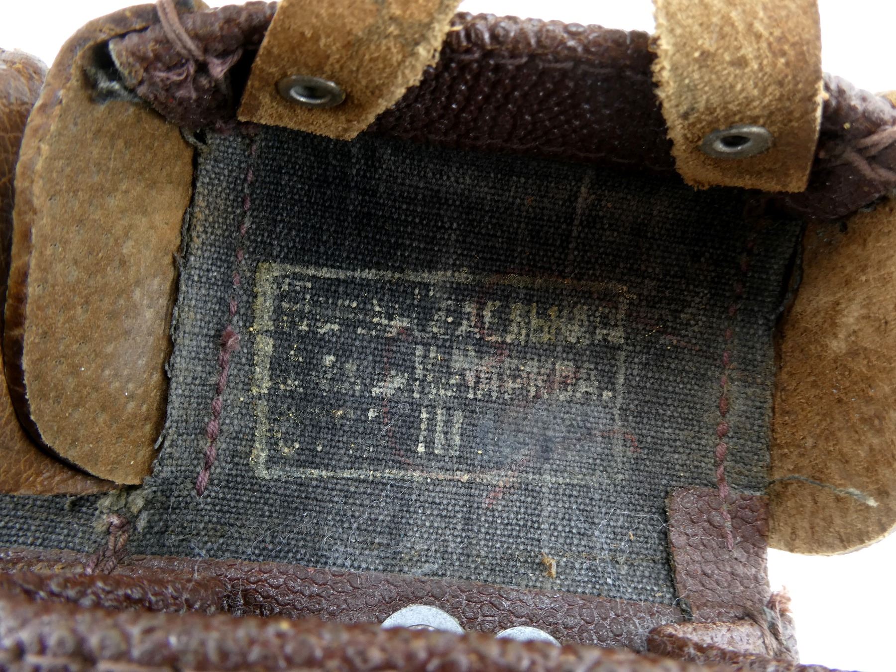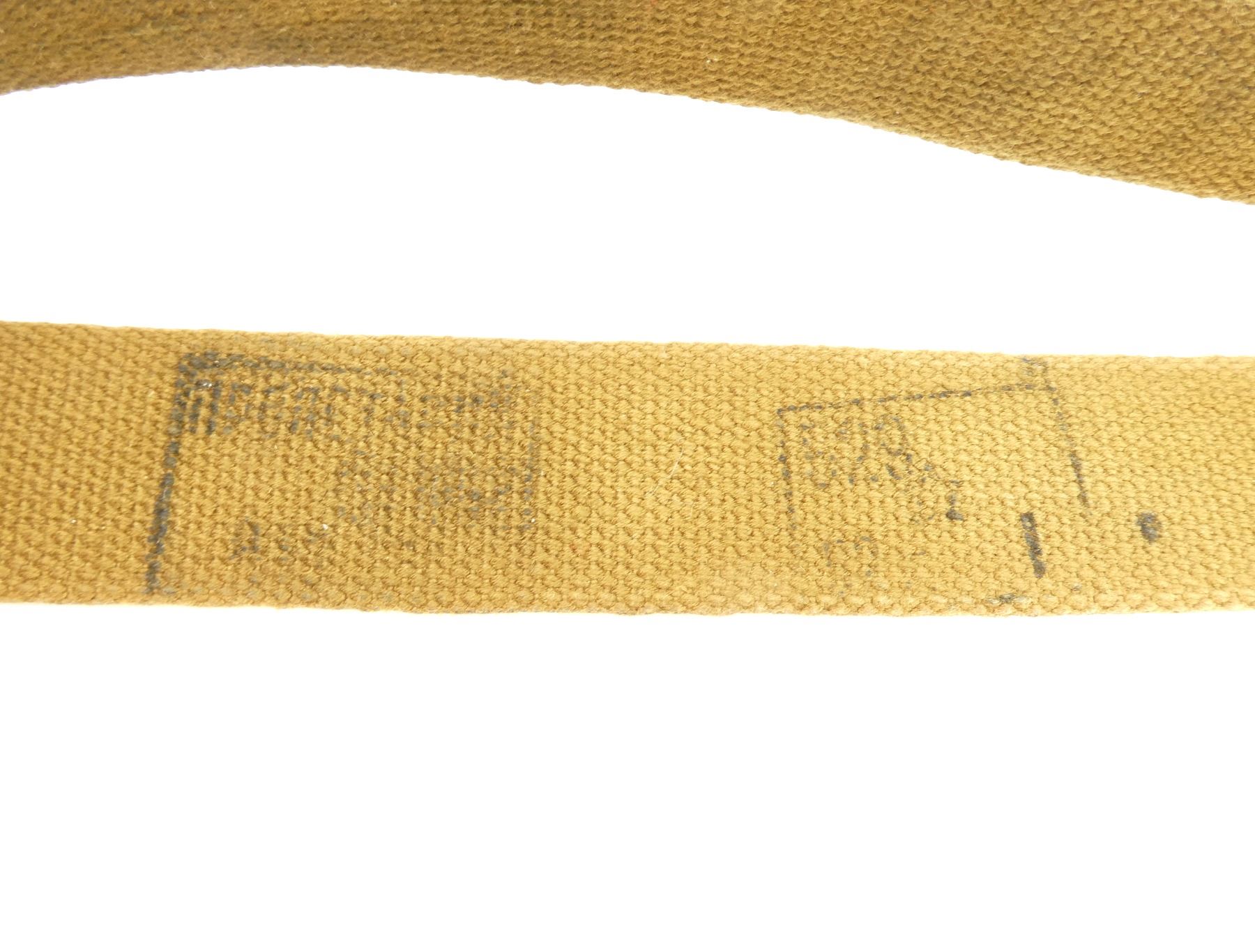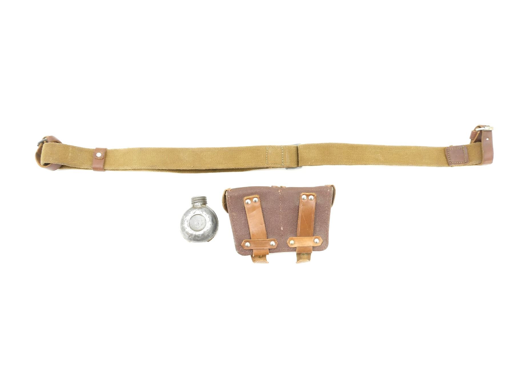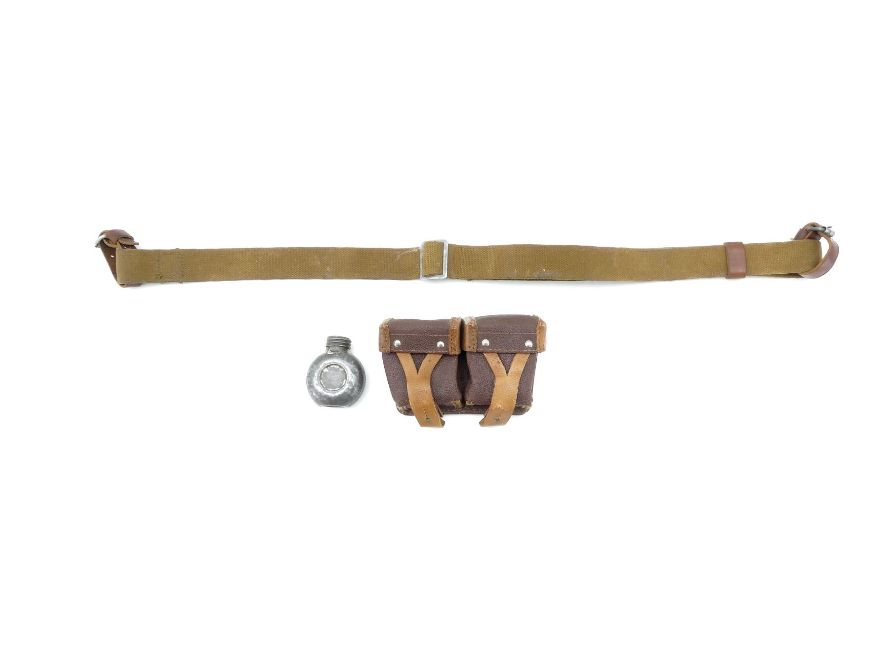 LOT INCLUDES; (1) MOSIN-NAGANT BROWN LEATHER AMMO POUCH, VARIOUS INK STAMP MARKINGS ON FLAP, LEATHER BELT LOOPS, (1) STEEL SINGLE-SPOUT OILER, NO VISIBLE MARKINGS & (1) MOSIN-NAGANT TAN CANVAS SLING WITH LEATHER STRAPS, VARIOUS INK STAMP MARKINGS, METAL BUCKLES / FITTINGS, OVERALL LENGTH APPROX. 31.5", ADJUSTABLE. SEE PHOTOS.