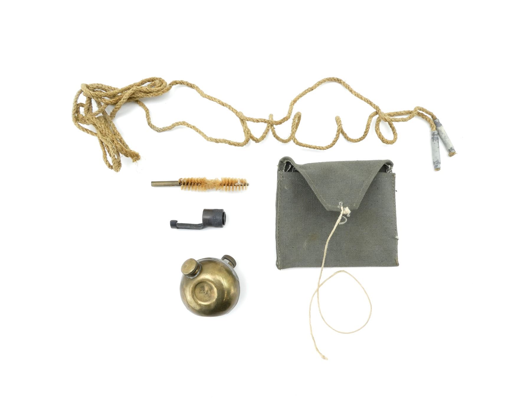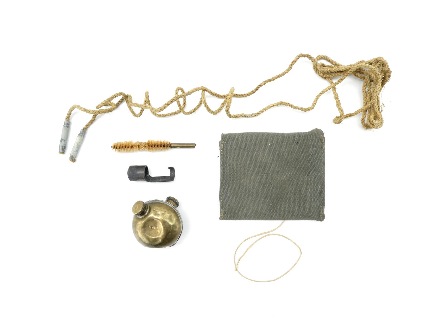 LOT INCLUDES; (1) BRASS DOUBLE-SPOUTED OILER, VARIOUS MARKINGS, (1) ROPE PULL-THRU WITH TWO WEIGHTS, (1) WIRE BRUSH, (1) YUGOSLAVIAN M48 MAUSER MUZZLE COVER & (1) GREY CANVAS CLEANING KIT POUCH, NO VISIBLE MARKINGS. SEE PHOTOS.