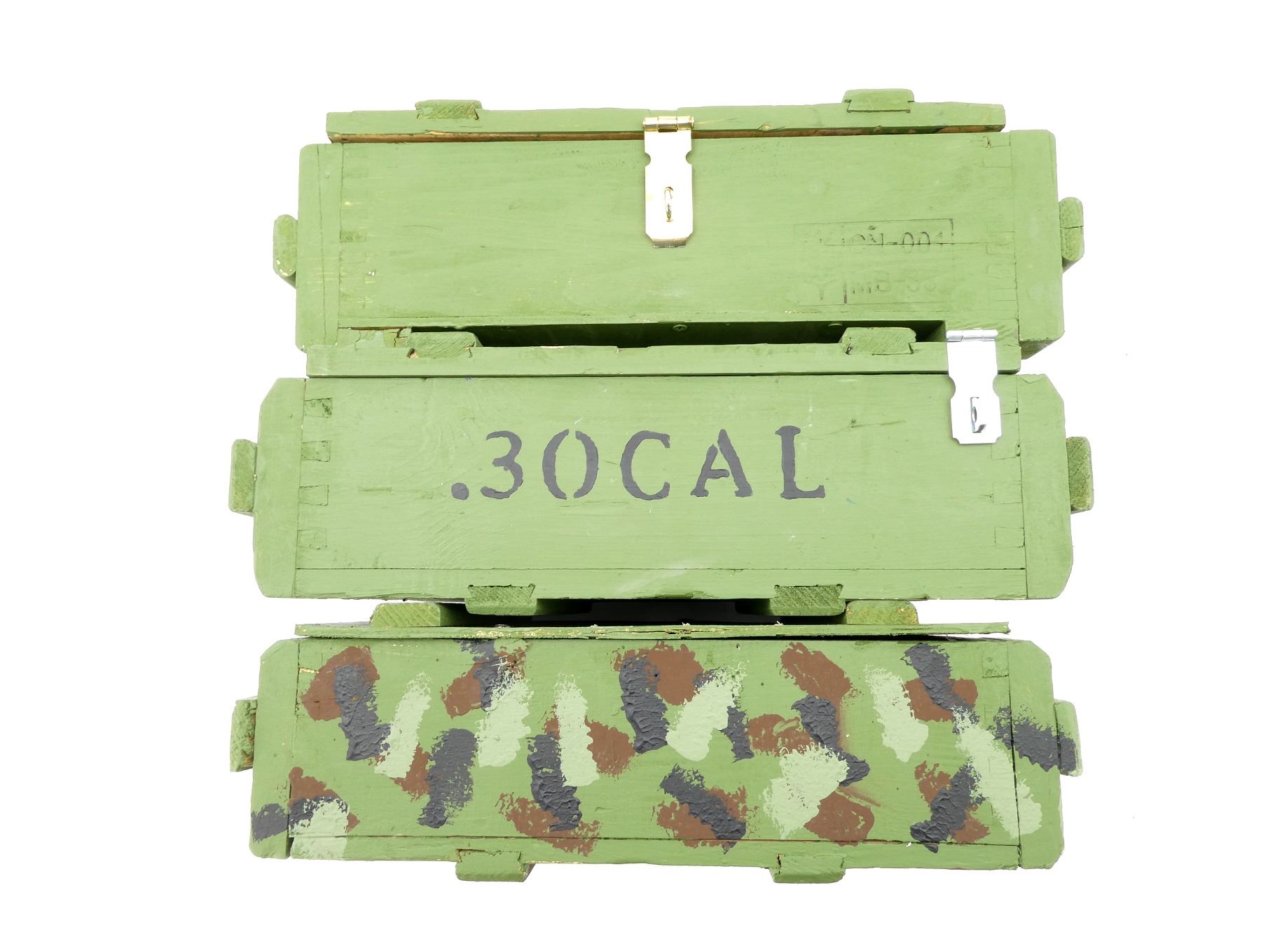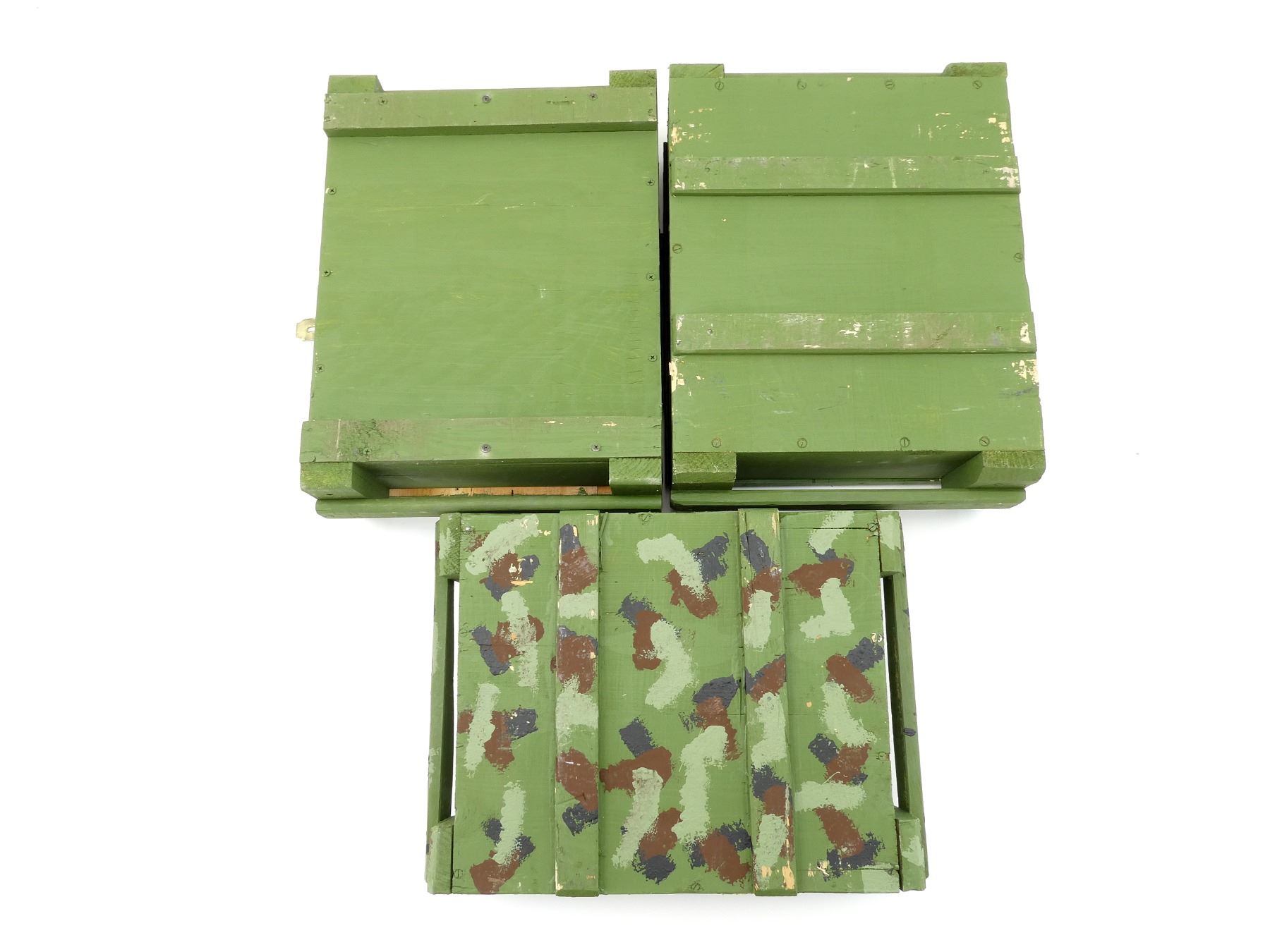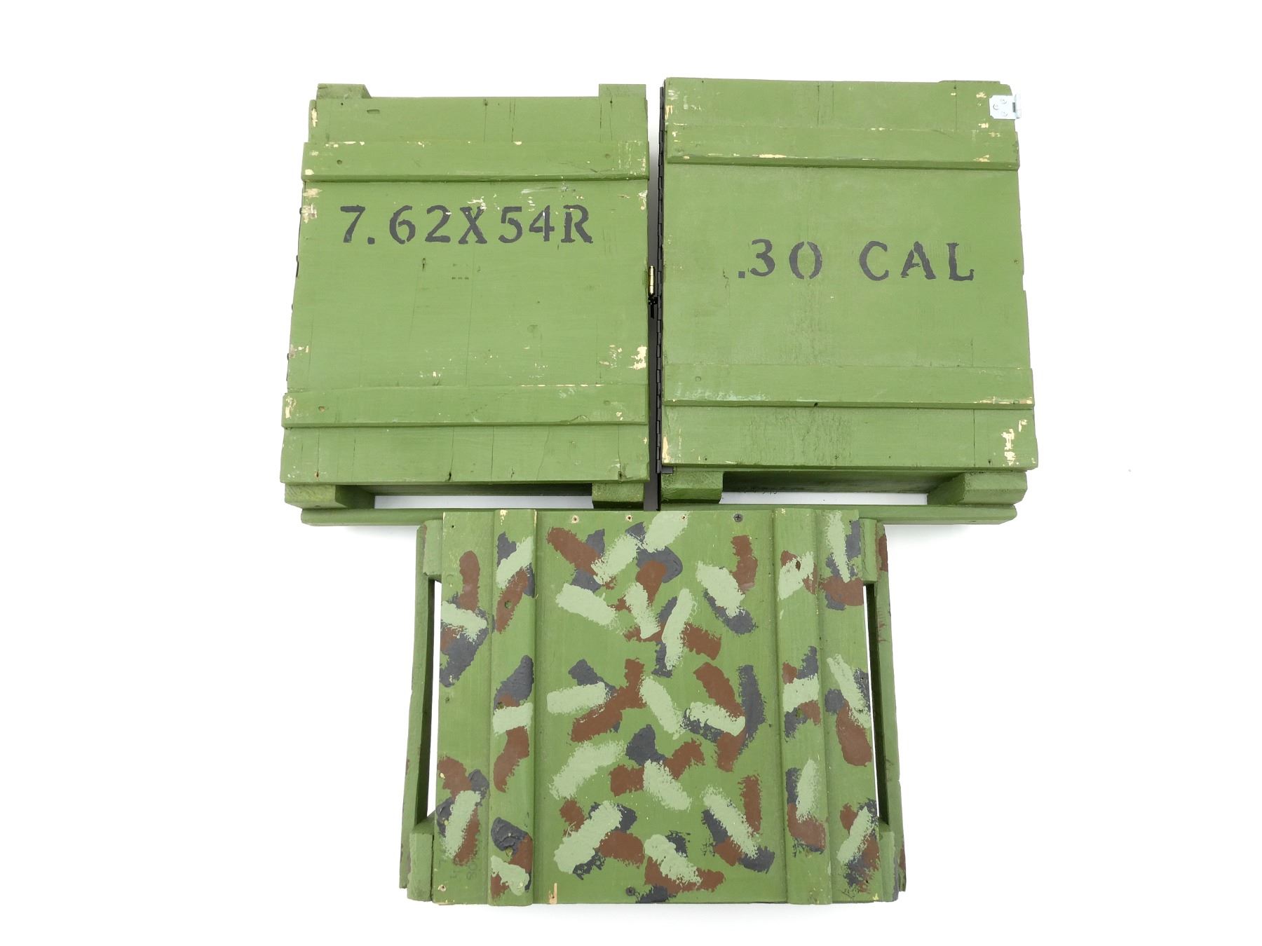 LOT INCLUDES; (3) GREEN PAINTED WOODEN AMMO CRATES WITH LIDS (EMPTY), VARIOUS MARKINGS, APPROX. 18.25" X 13.25" X 6.25". SEE PHOTOS.