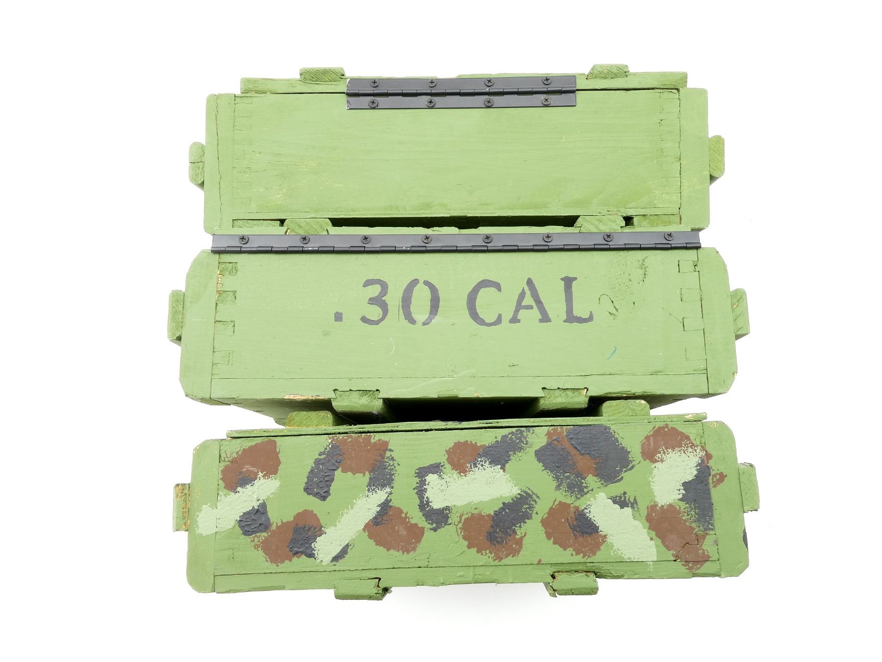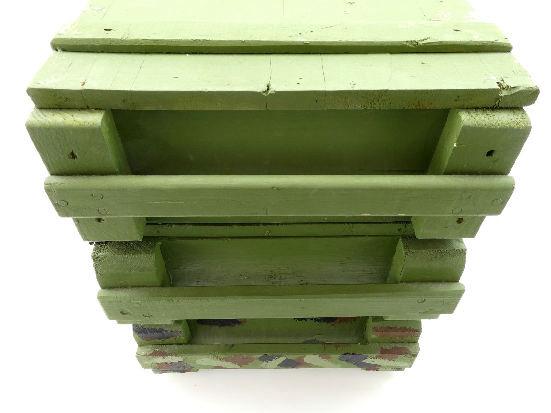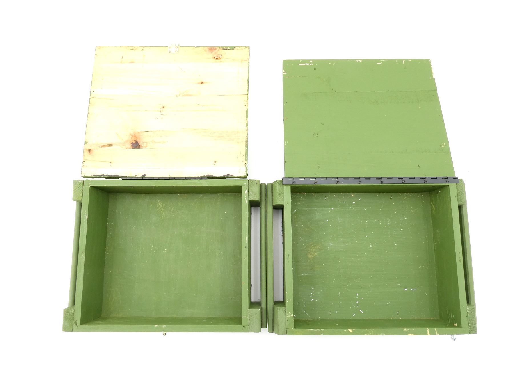 LOT INCLUDES; (3) GREEN PAINTED WOODEN AMMO CRATES WITH LIDS (EMPTY), VARIOUS MARKINGS, APPROX. 18.25" X 13.25" X 6.25". SEE PHOTOS.