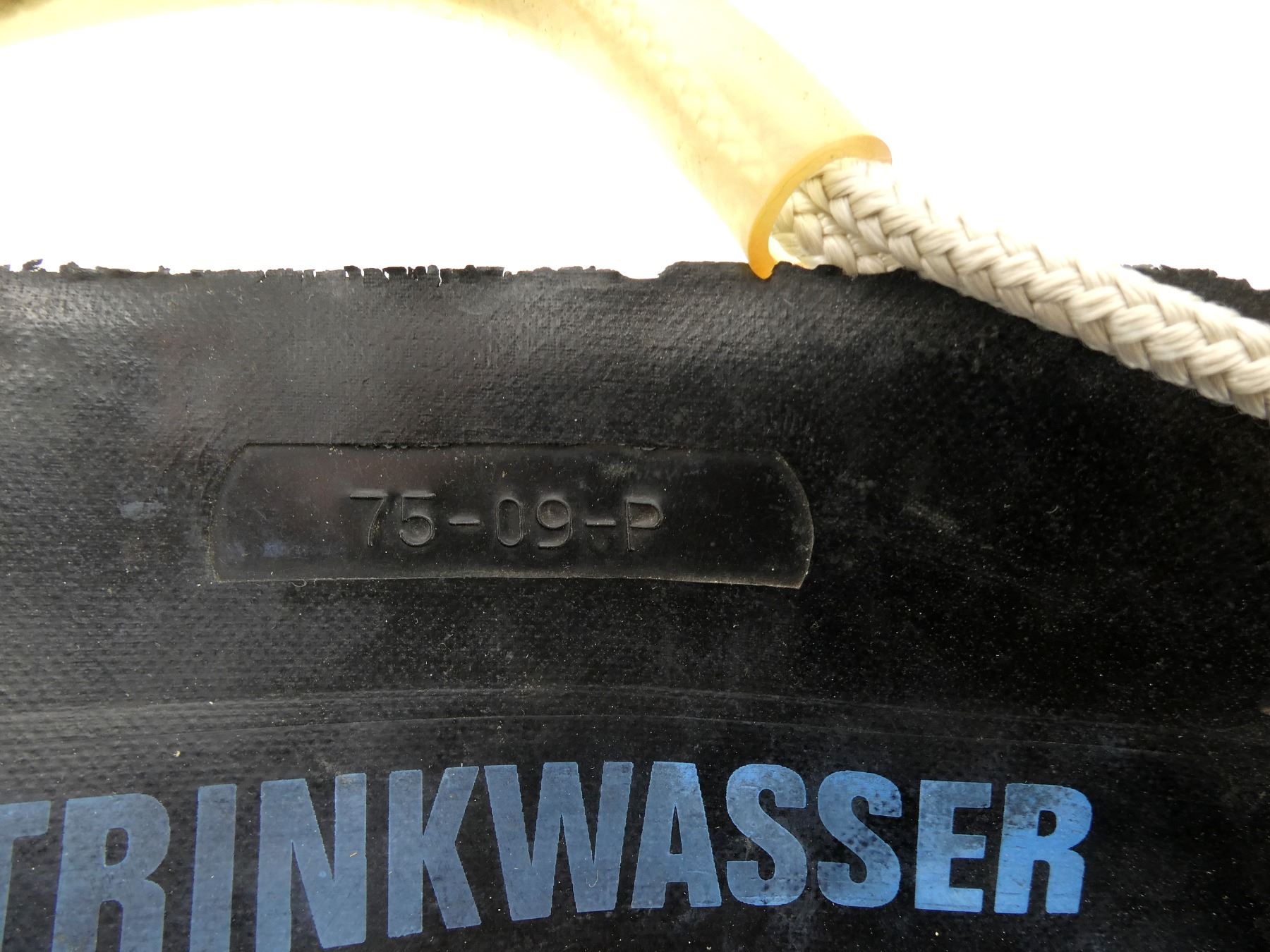 (1) 20 L WATER BAG, BLACK RUBBER WITH ROPE / PLASTIC HANDLES & BLACK PLASTIC FILLER NECK, MARKED: "NUR FUER TRINKWASSER EXCLUSIVEMENT POUR EAU POTABLE SOLO PER ACQUA POTABILE" & "75-09-P", SHOWS AGE / WEAR, APPROX. 17.75" X 24". SEE PHOTOS.