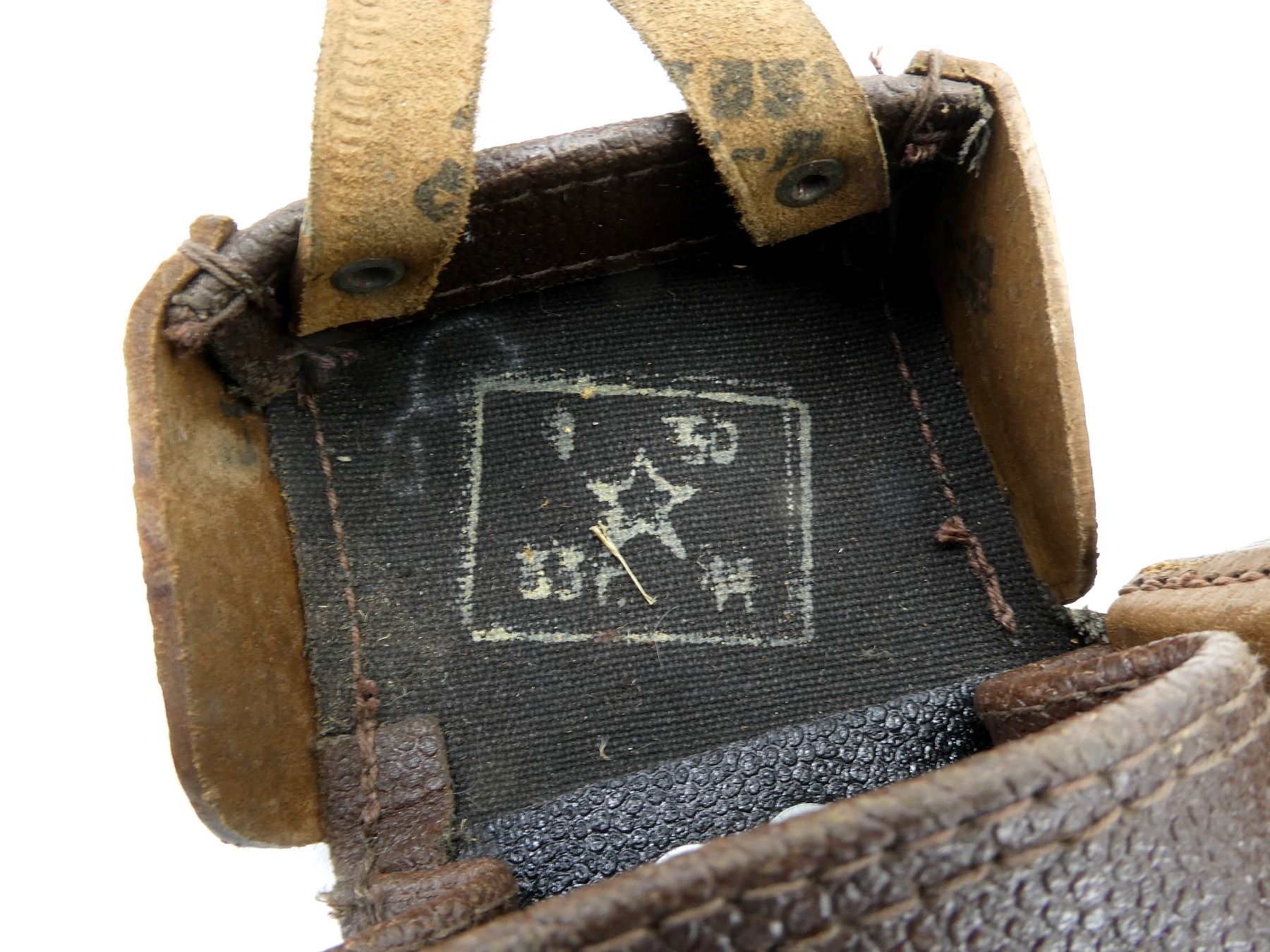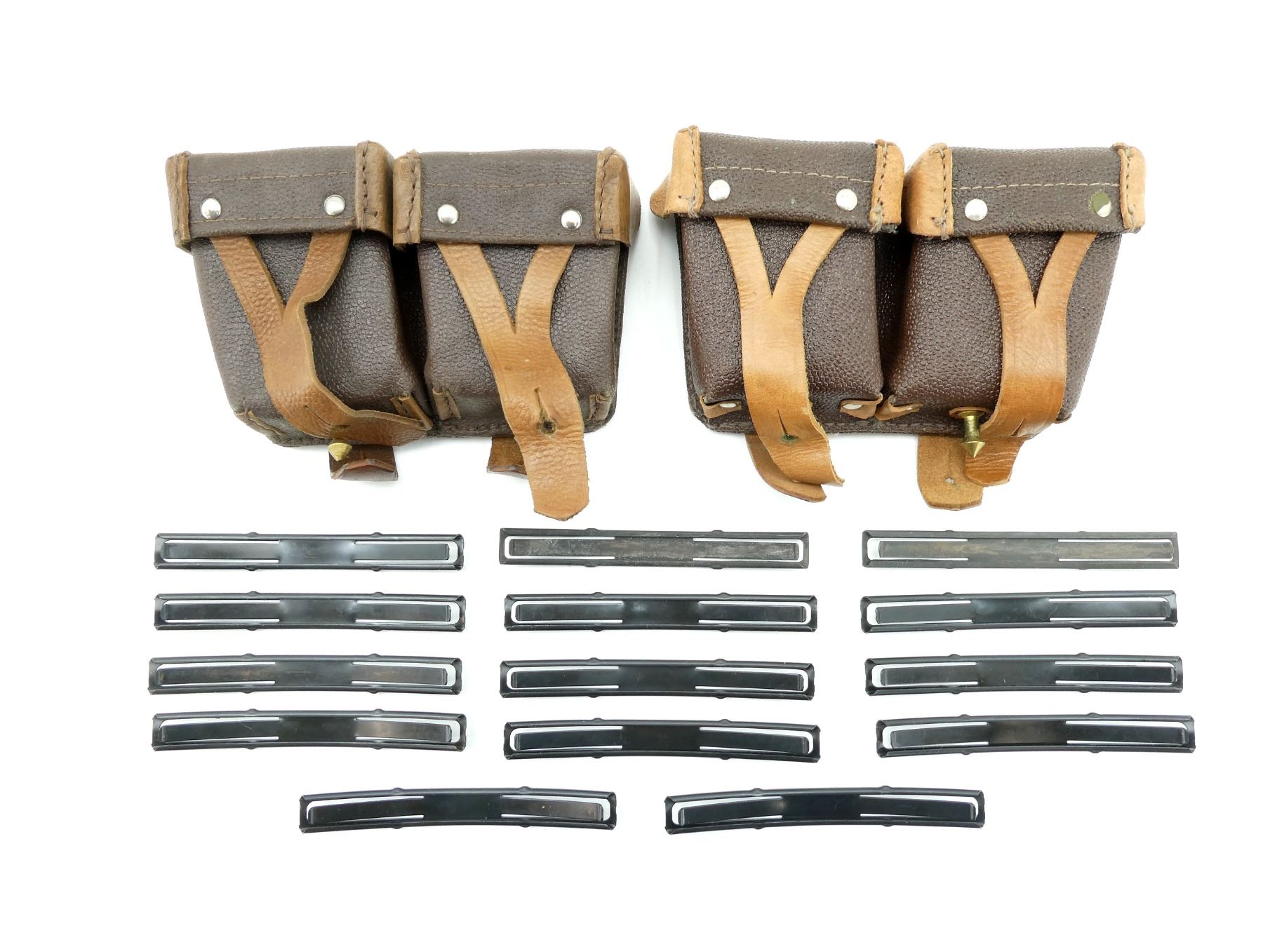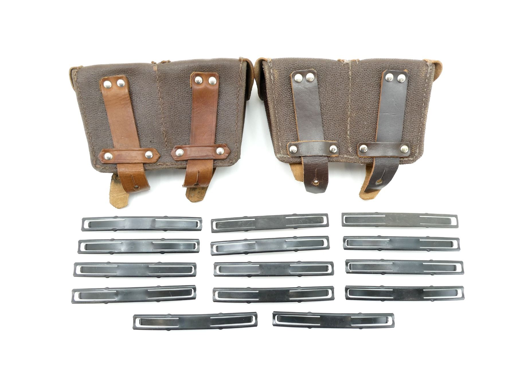 LOT INCLUDES; (2) MOSIN NAGANT BROWN LEATHER AMMO POUCHES, 2-POCKET, METAL / BRASS FITTINGS, VARIOUS INK STAMP MARKINGS, TWO LEATHER BELT LOOPS & APPROX. (14) SKS 7.62X39MM, 10-RND STRIPPER CLIPS, BLUED / BLACK PAINTED STEEL, ONE MARKED: "31" IN A CIRCLE PROOF MARK, OTHERS HAVE NO VISIBLE MARKINGS. SEE PHOTOS.