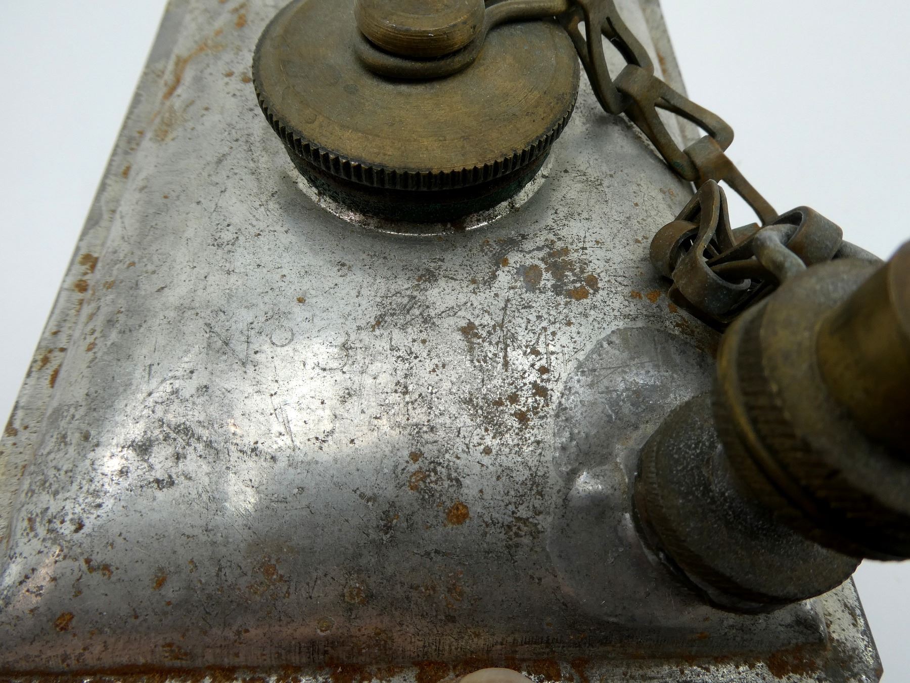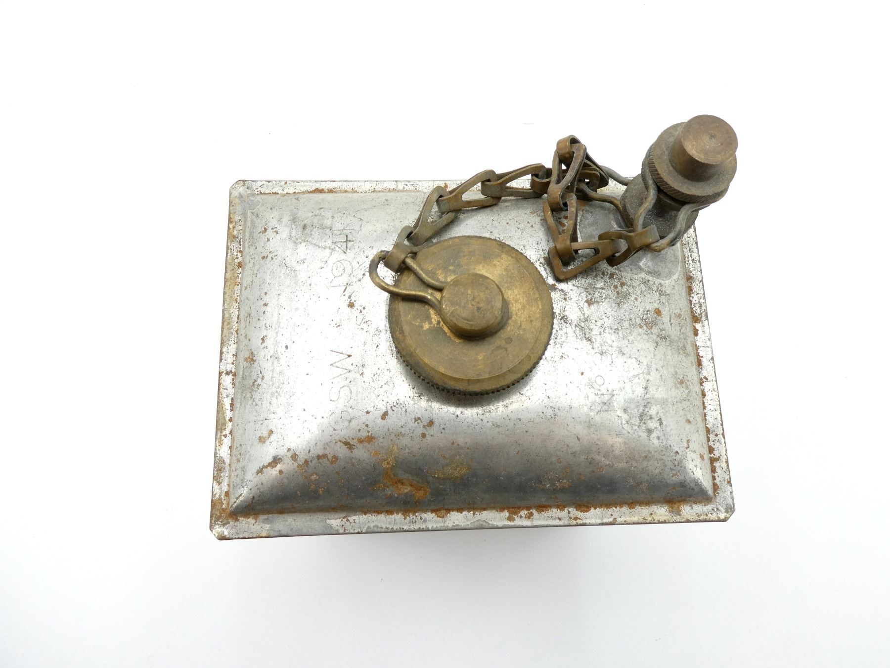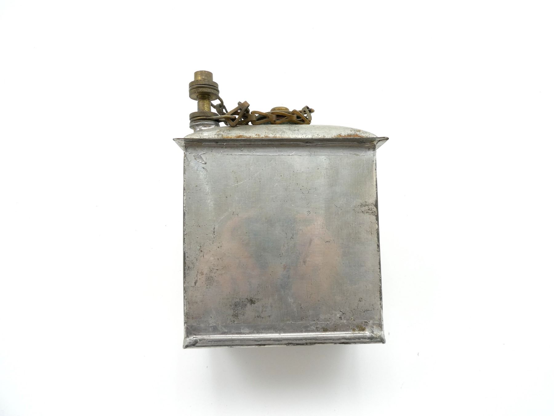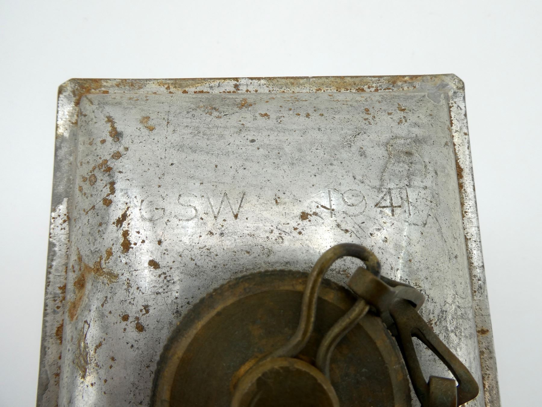 (1) STEEL OIL CAN WITH BRASS CAPS / CHAINS, MISSING LEATHER COVER / WRAP, TOP MARKED: "GSW (GENERAL STEEL WARES), 1941", "NO. 3, MKII". SEE PHOTOS.