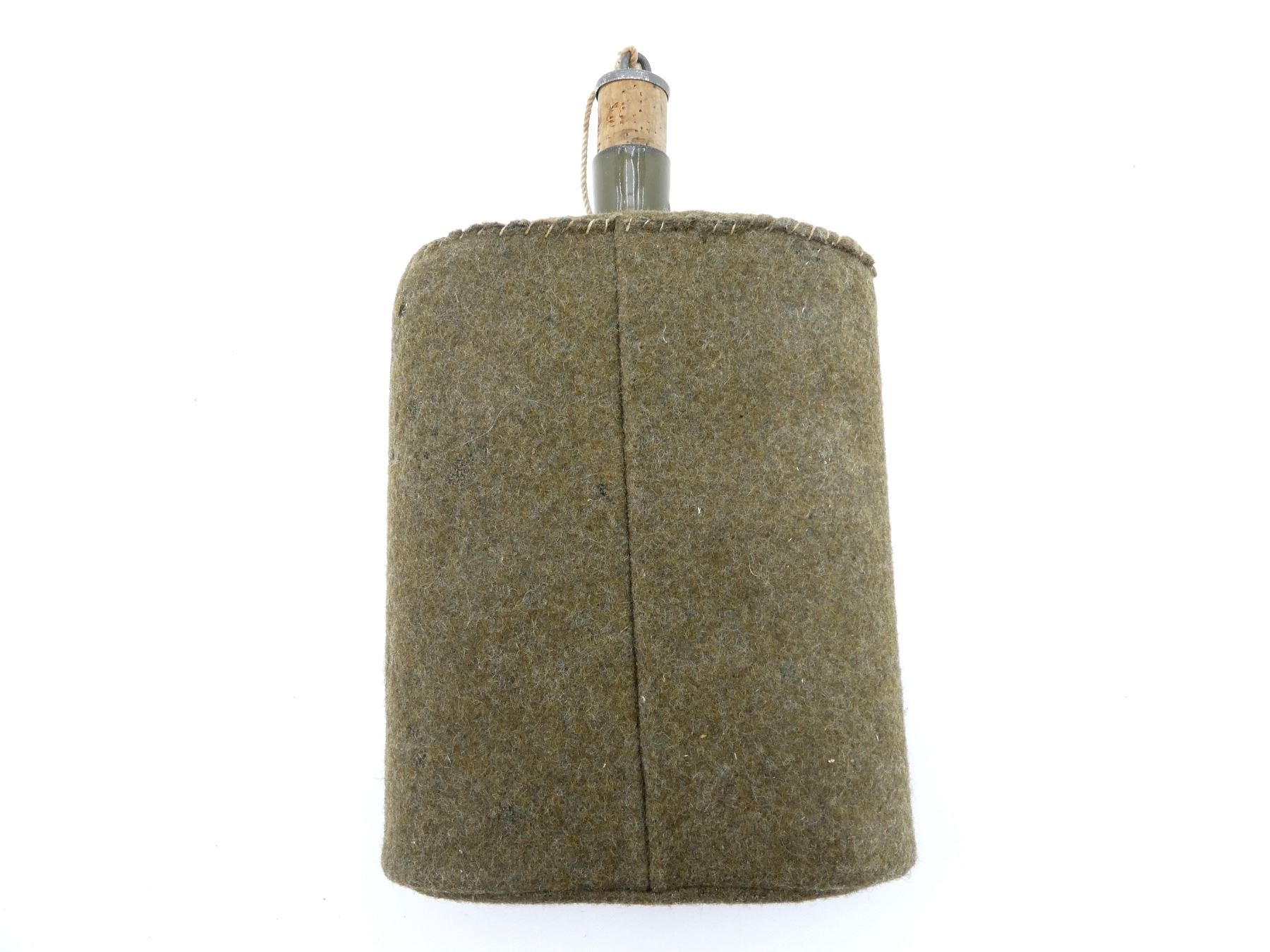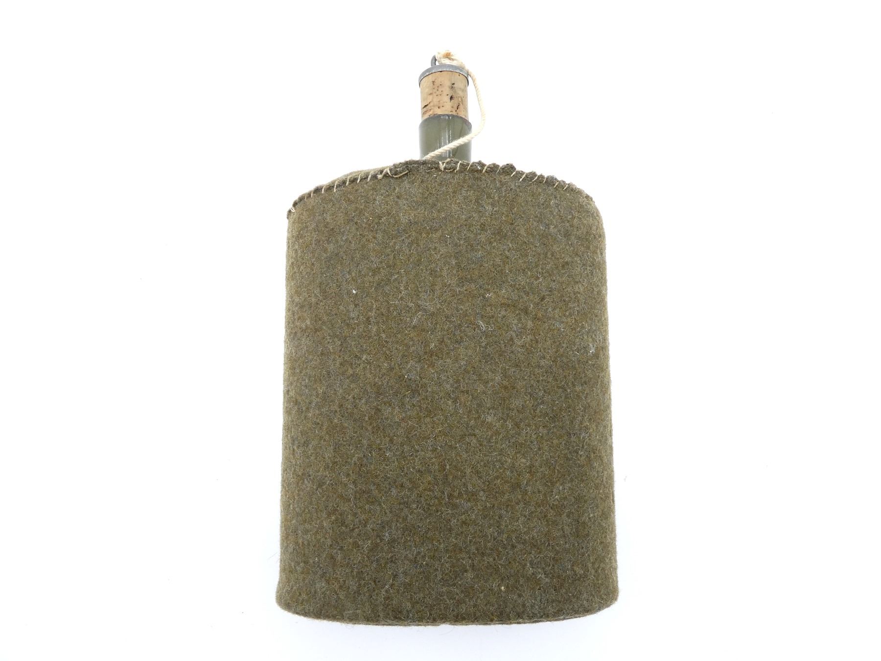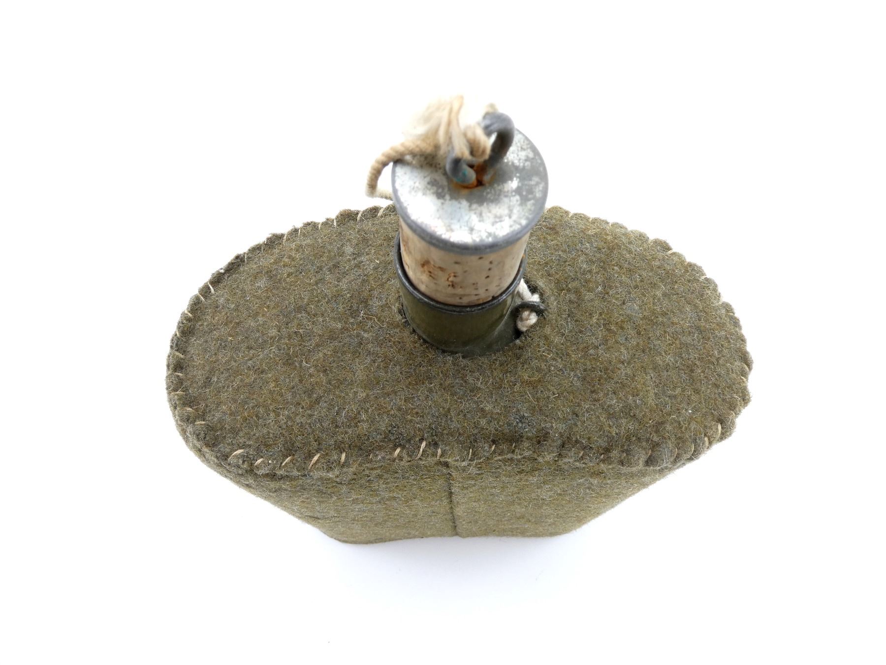 (1) GREEN ENAMELED STEEL FELT-COVERED CANTEEN WITH CORK, NO VISIBLE MARKINGS, NO CARRIER. SEE PHOTOS.