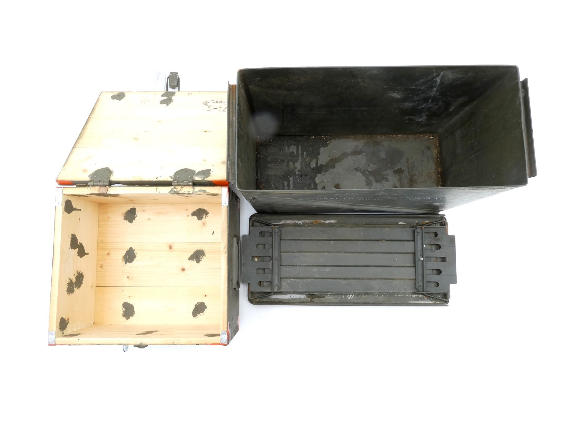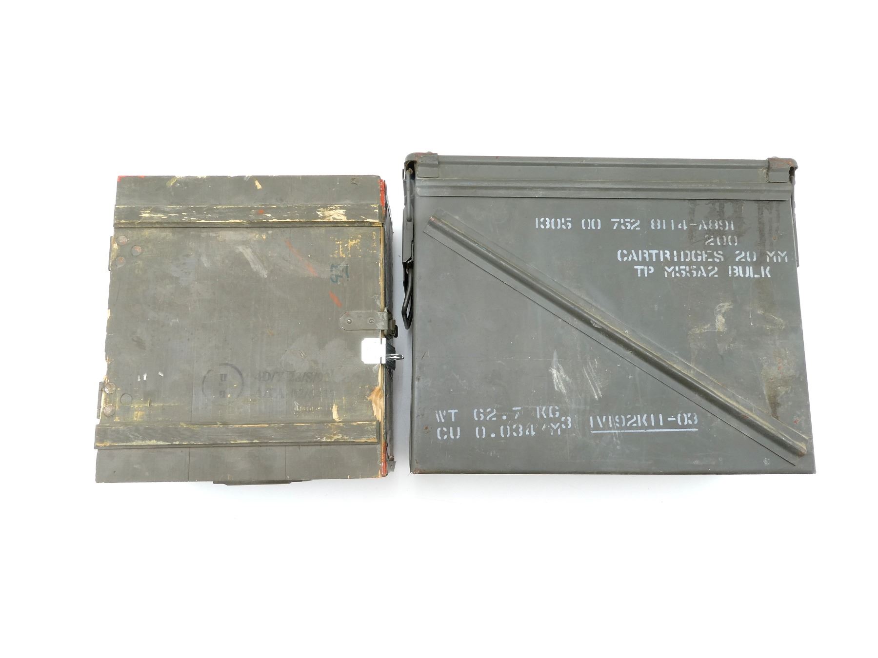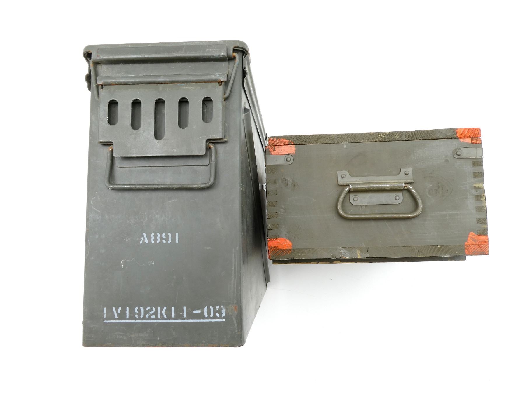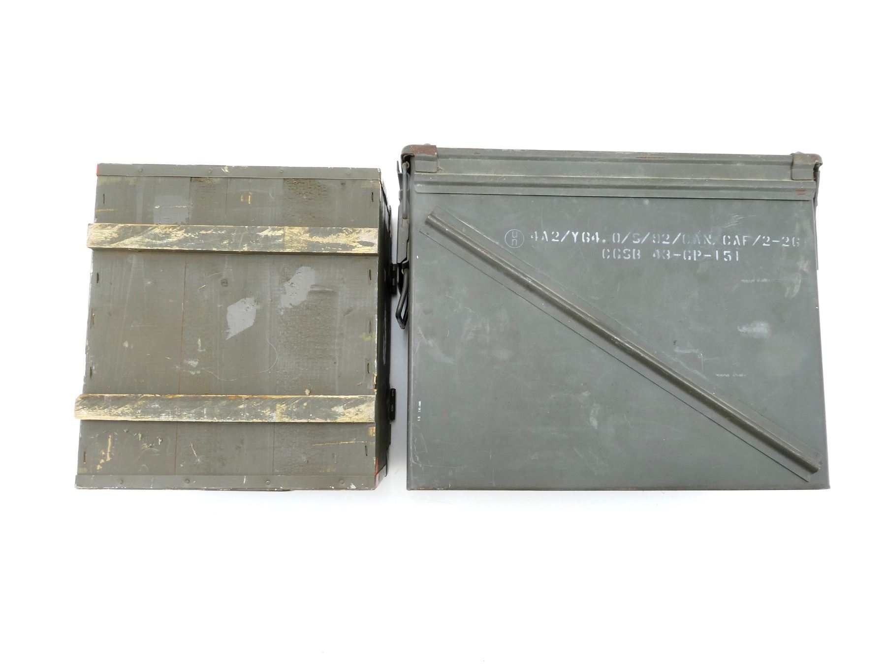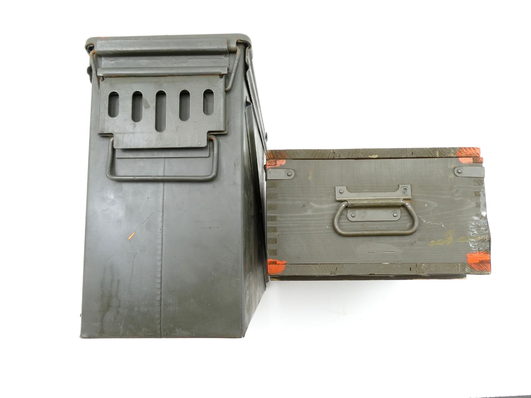 LOT INCLUDES; (1) GREEN PAINTED AMMO TIN, VARIOUS MARKINGS, APPROX. 18.75" X 8.25" X 14.25" & (1) GREEN PAINTED WOODEN AMMO CRATE, VARIOUS MARKINGS, APPROX. 13 5/8" X 12.25" X 8". SEE PHOTOS.