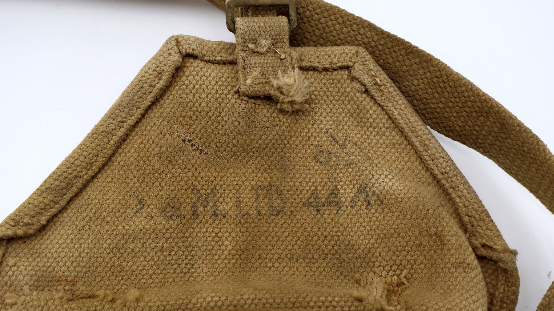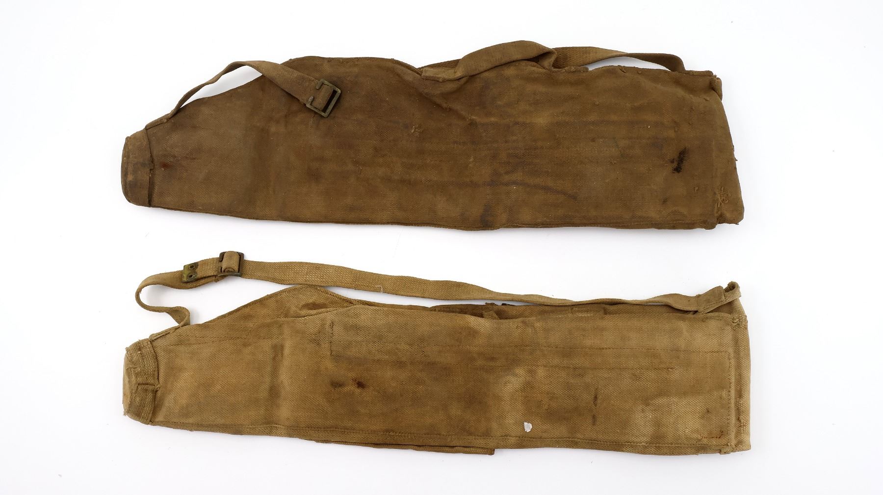 LOT INCLUDES; (2) FITS .303 BR LMG BARRELS, GUNNER'S KIT, OILER, ETC., TAN P37 WEB CANVAS WITH BRASS FITTINGS & SHOULDER STRAPS, ONE MARKED: "?&M. LTD. 44", BROAD ARROW, BROAD ARROW OVER "76", OTHER HAS NO VISIBLE MARKINGS, CANVAS CARRY HANDLES, SHOWS AGE / WEAR / TEAR, OALS APPROX. 26". SEE PHOTOS.