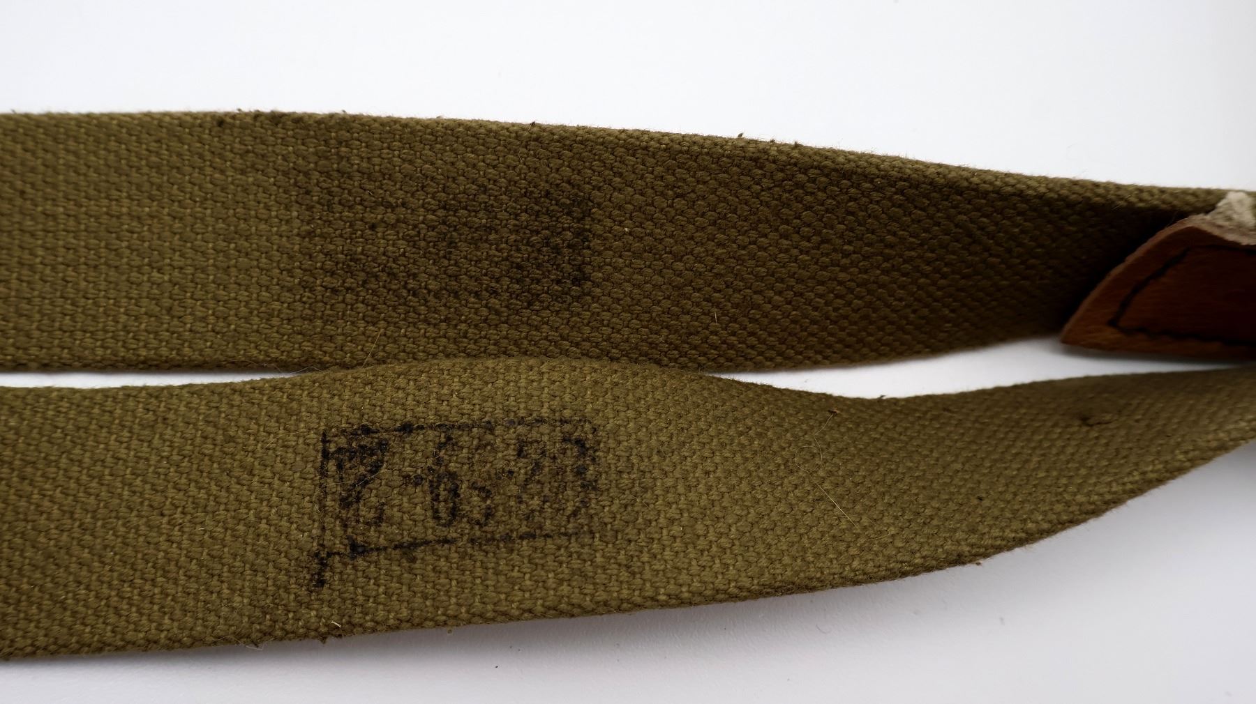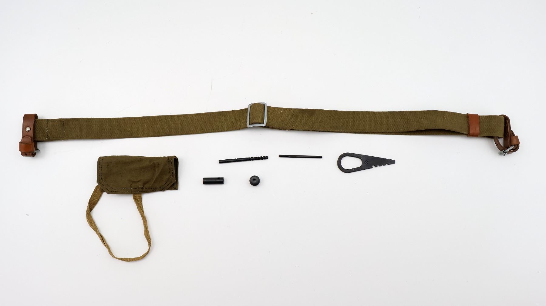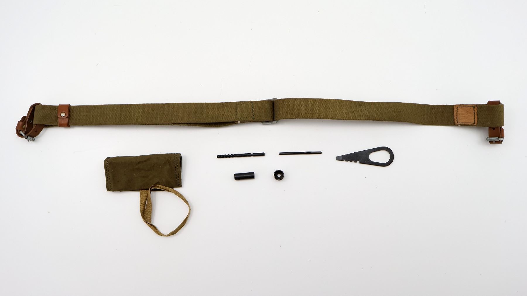 LOT INCLUDES; (1) MOSIN NAGANT CLEANING KIT WITH CANVAS POUCH, JAG, COMBO TOOL, WRENCH, GUIDE & (1) MOSIN NAGANT TAN CANVAS SLING WITH LEATHER STRAPS, VARIOUS INK STAMP MARKINGS, METAL BUCKLES / FITTINGS, OVERALL LENGTH APPROX. 33", ADJUSTABLE. SEE PHOTOS.
