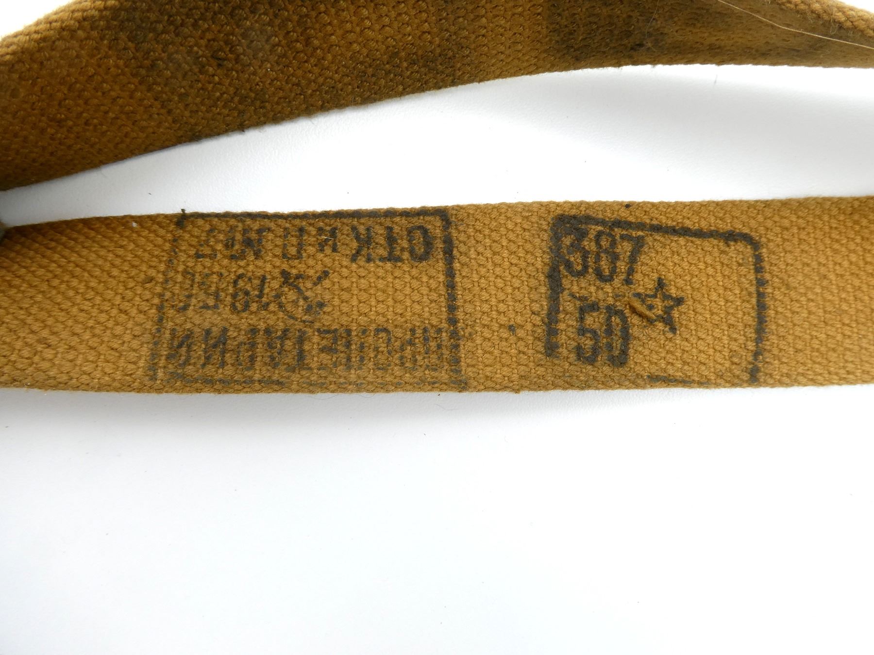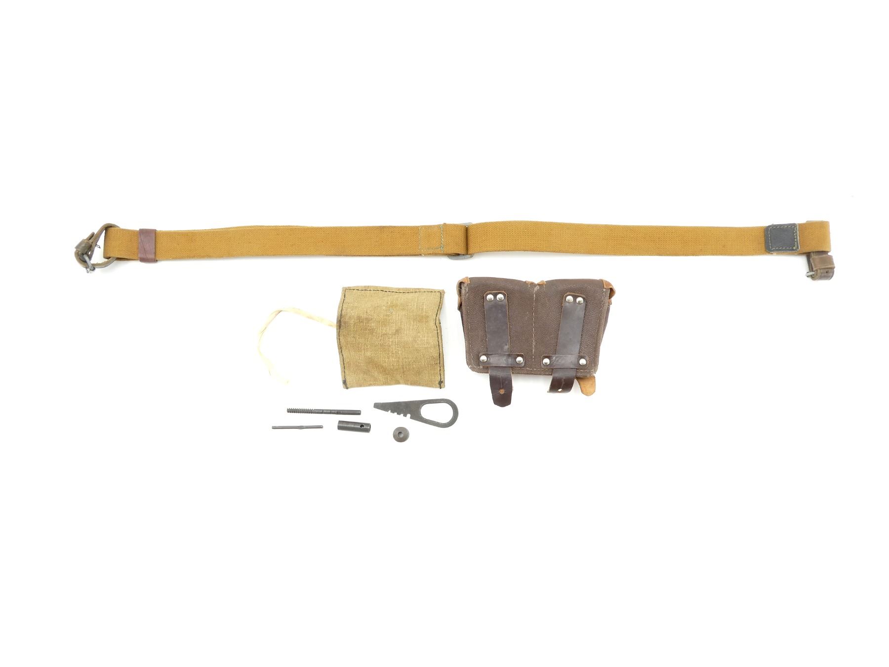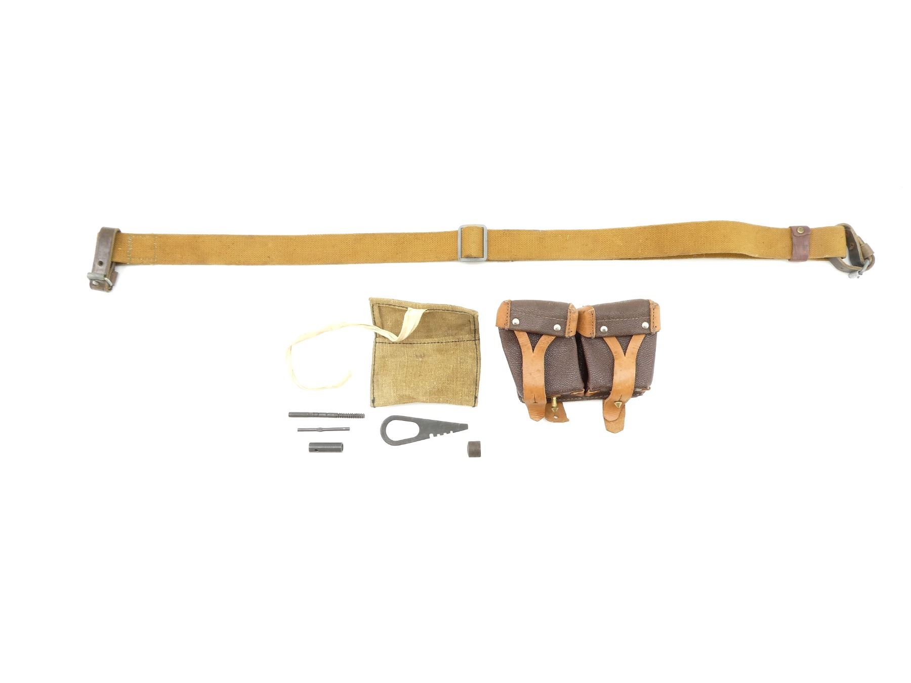 LOT INCLUDES; (1) MOSIN NAGANT BROWN LEATHER AMMO POUCH, 2-POCKET, METAL / BRASS FITTINGS, VARIOUS INK STAMP MARKINGS, TWO LEATHER BELT LOOPS, (1) MOSIN NAGANT CLEANING KIT WITH CANVAS POUCH, JAG, COMBO TOOL, WRENCH, GUIDE & (1) MOSIN NAGANT TAN CANVAS SLING WITH LEATHER STRAPS, VARIOUS INK STAMP MARKINGS, METAL BUCKLES / FITTINGS, OVERALL LENGTH APPROX. 34.5", ADJUSTABLE. SEE PHOTOS.