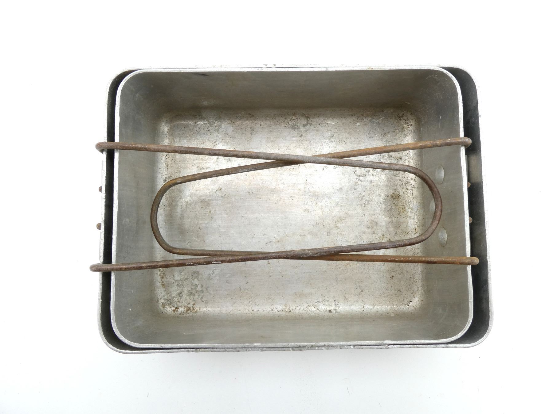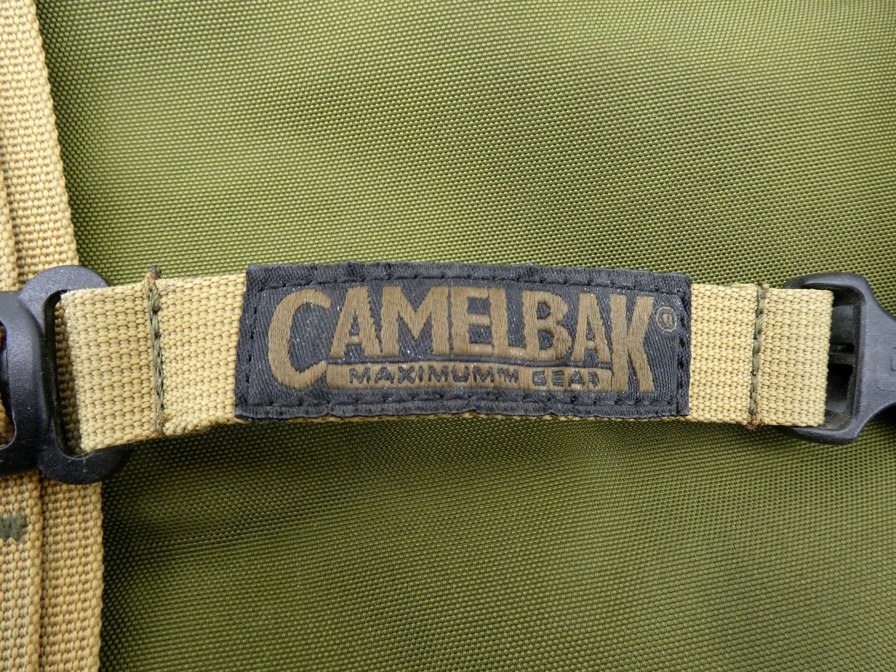 LOT INCLUDES; (1) BRITISH MILITARY GREEN CAMO / TAN NYLON HYDRATION SYSTEM, MARKED: "CAMELBAK, MAXIMUM GEAR", "CAMELBAK PRODUCTS, LLC, INDIVIDUAL HYDRATION SYSTEM, NSN: CN 8405-99-842-7034" ETC., WITH SHOULDER STRAPS, HOSE TO BLADDER, SHOWS WEAR & (2) CANADIAN MILITARY MESS TINS, MARKED: "W.D.S. & CO., DURO, ALUMINUM, MADE IN CANADA" ETC., FOLDING HANDLES . SEE PHOTOS.