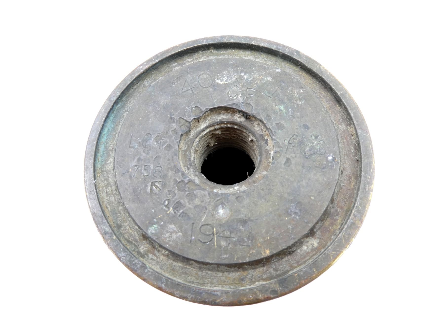 (1) 40MM BOFORS BRASS SHELL CASING, NO PRIMER, NO PROJECTILE, BASE MARKED: "40MM III, CF, LOT, 758, A?/C", BROAD ARROW, "P", BROAD ARROW, "?" & "1943", BASE APPROX. 2 3/8" DIA. & OVERALL LENGTH APPROX. 12.25". SEE PHOTOS.