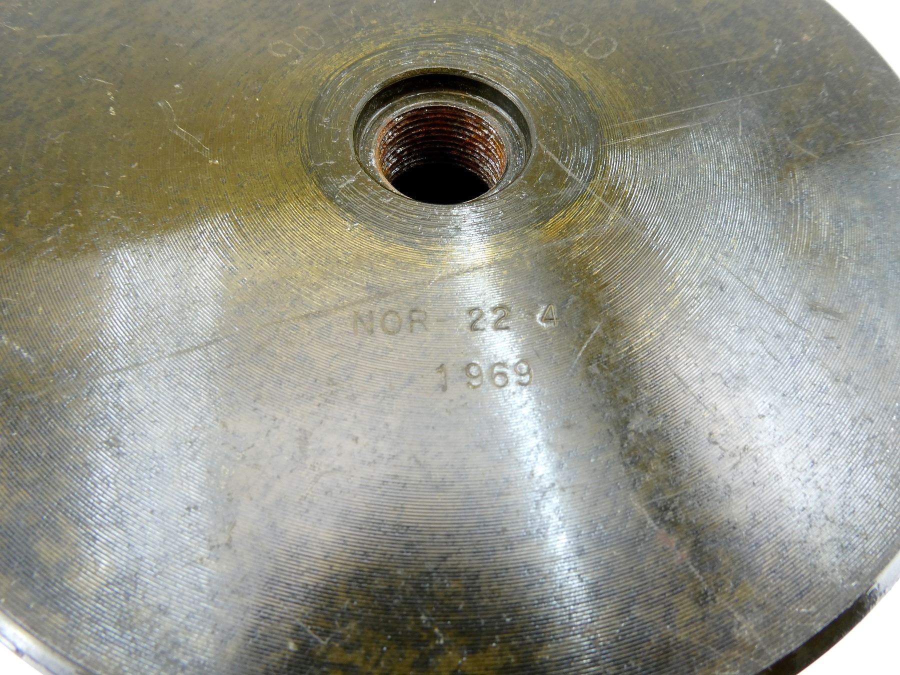 (1) BROWN LACQUERED STEEL SHELL CASING, NO PRIMER, NO PROJECTILE, BASE MARKED: "90 MM XM200, NOR-22-4, 1969", APPROX. 5 1/8" DIA. & OVERALL LENGTH APPROX. 23.5". SEE PHOTOS.