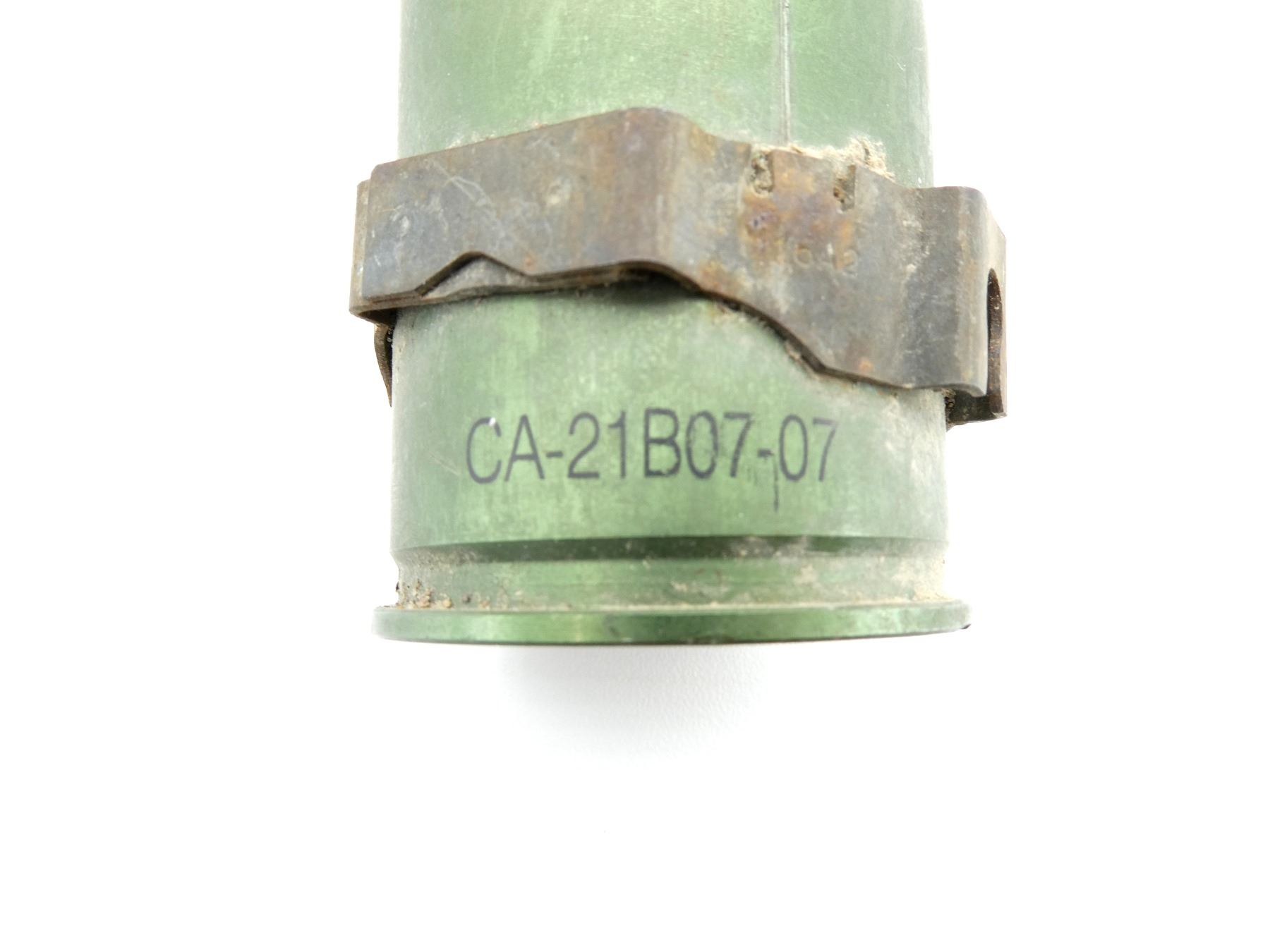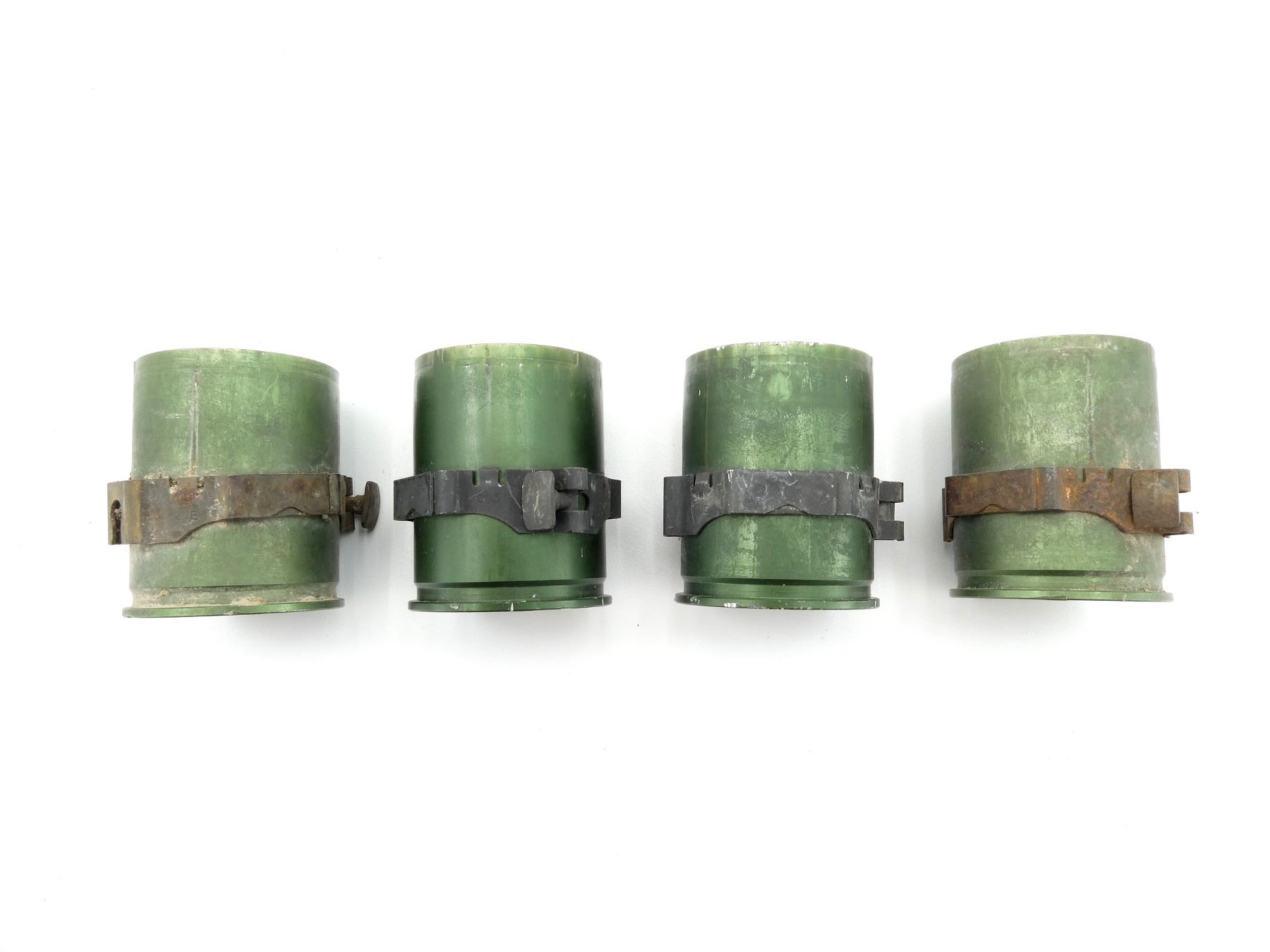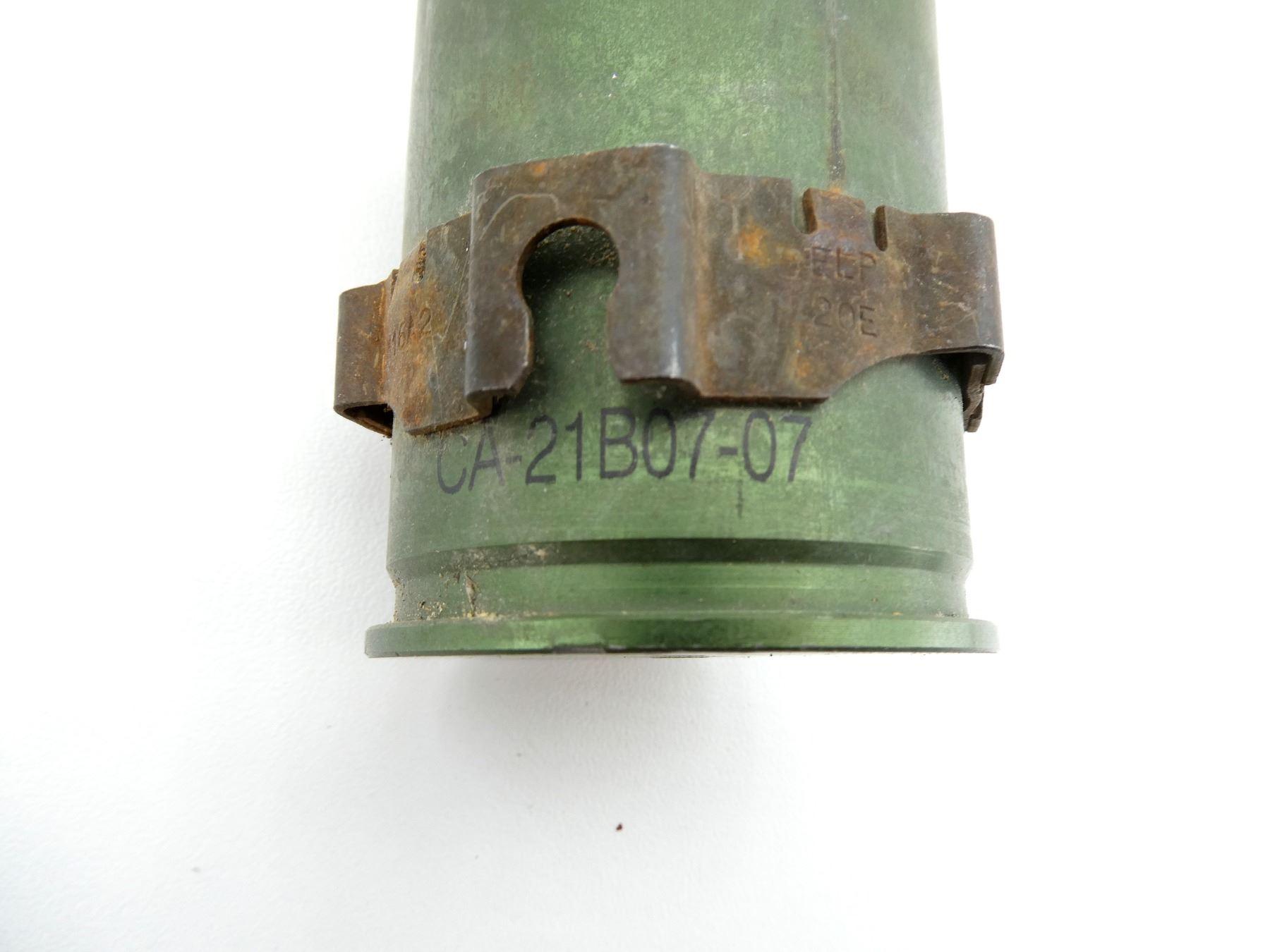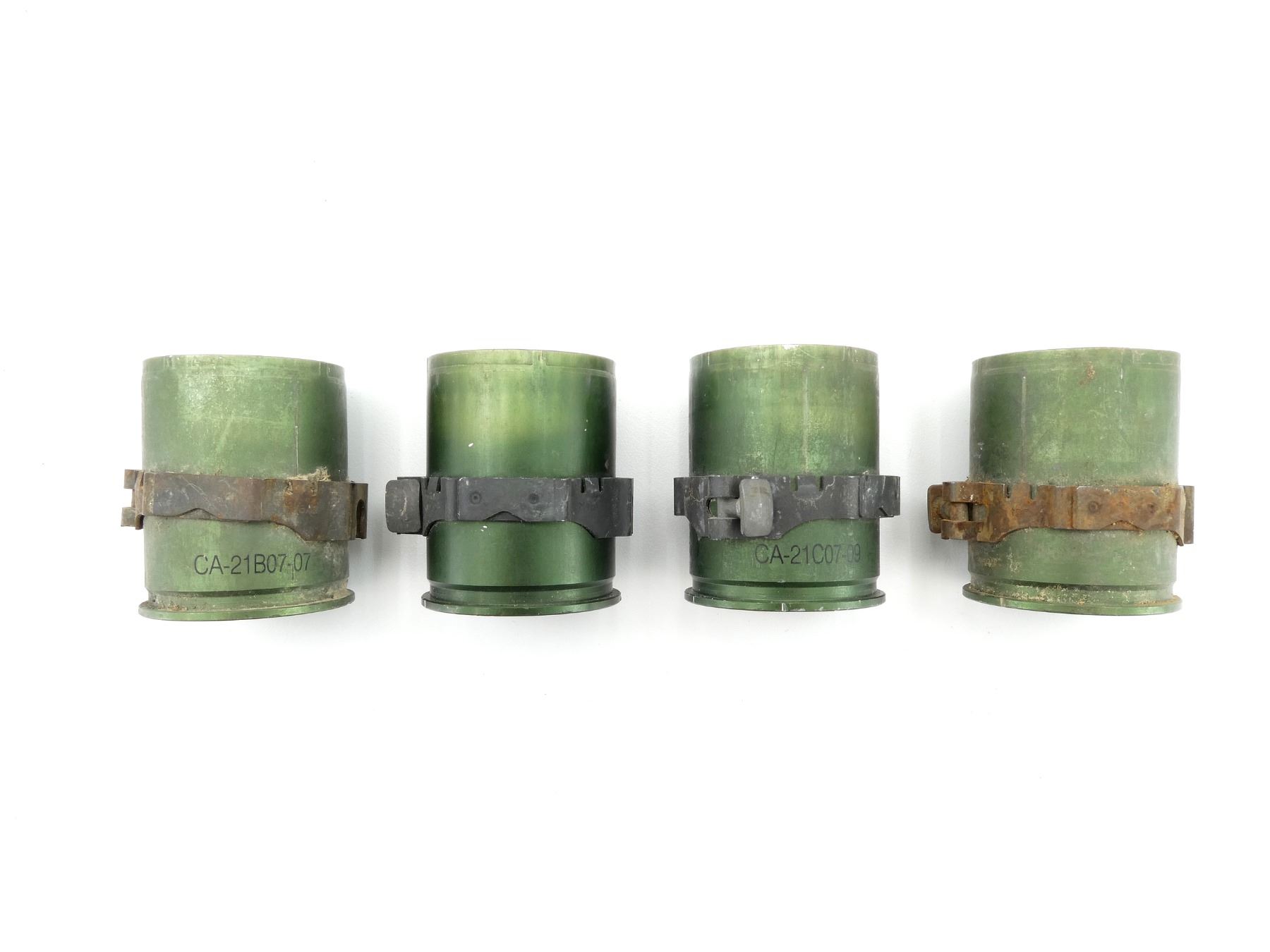 LOT INCLUDES; (4) 40MM SHELL CASINGS, FIRED PRIMER, GREEN PAINTED, NON-MAGNETIC METAL, MARKED: "CA-21C07-09", "CA-21B07-07", STEEL BAND AROUND CASINGS, VARIOUS MARKINGS ON BANDS, APPROX. 1.75" DIA. & OALS APPROX. 2". SEE PHOTOS.