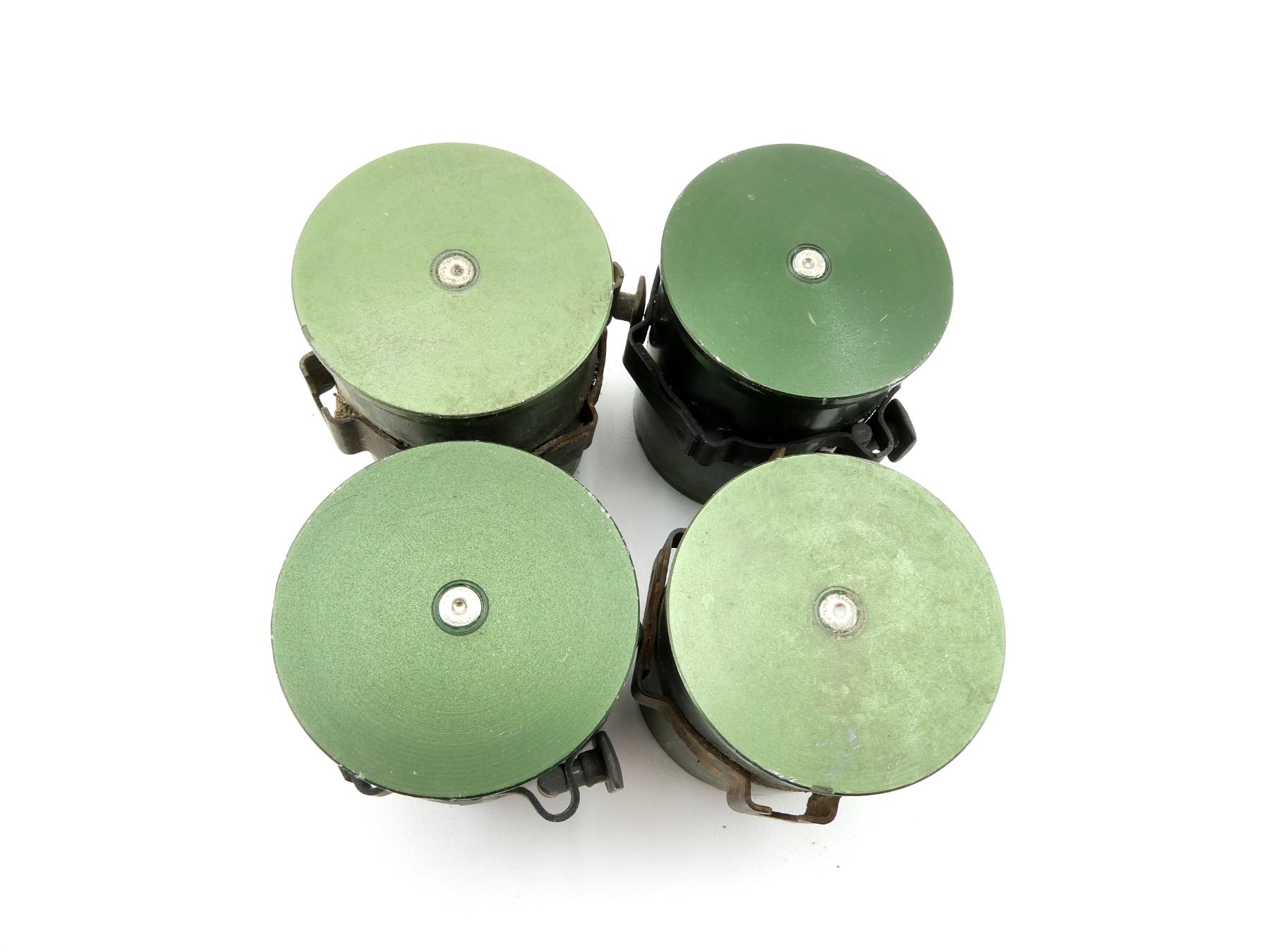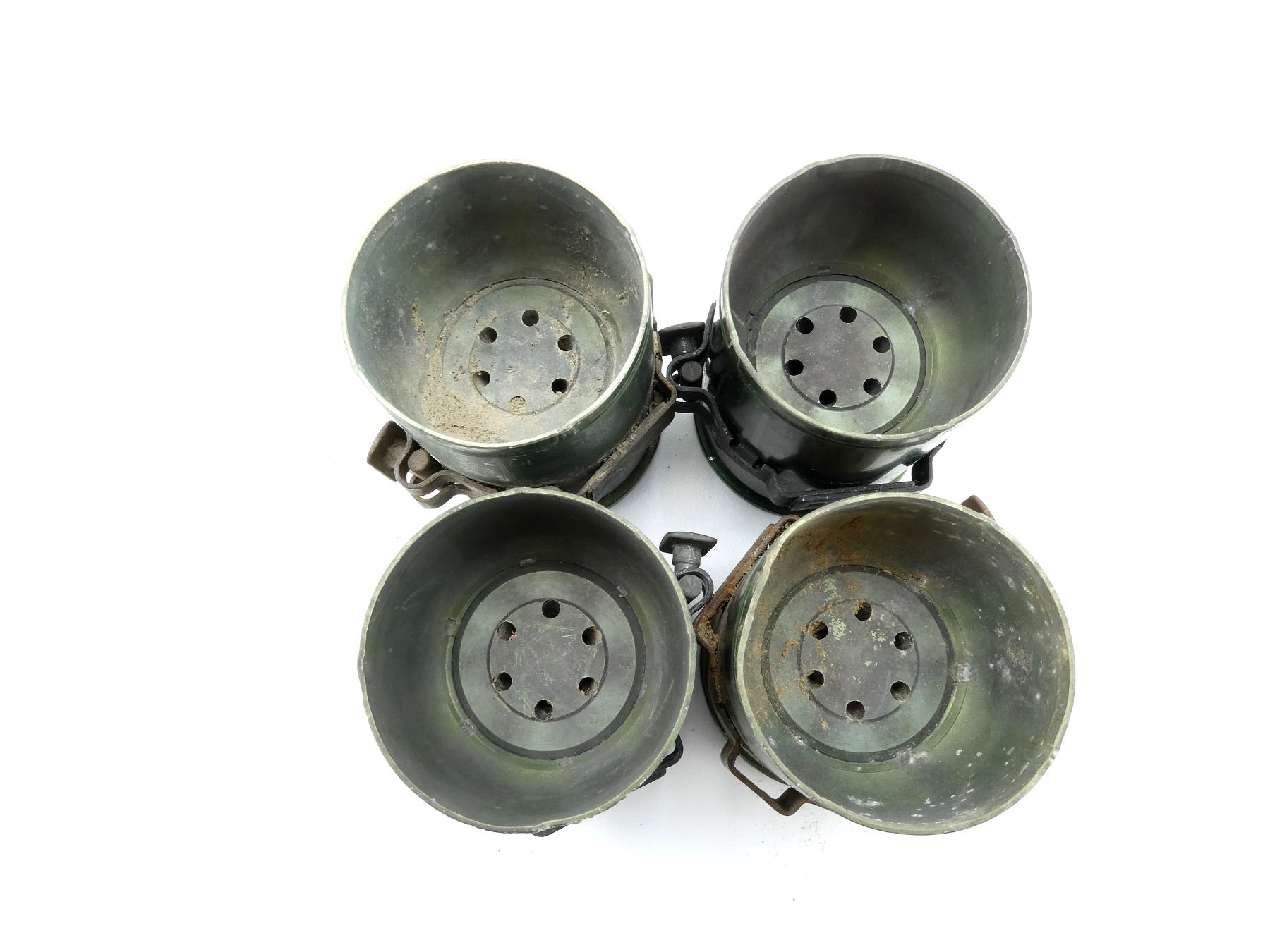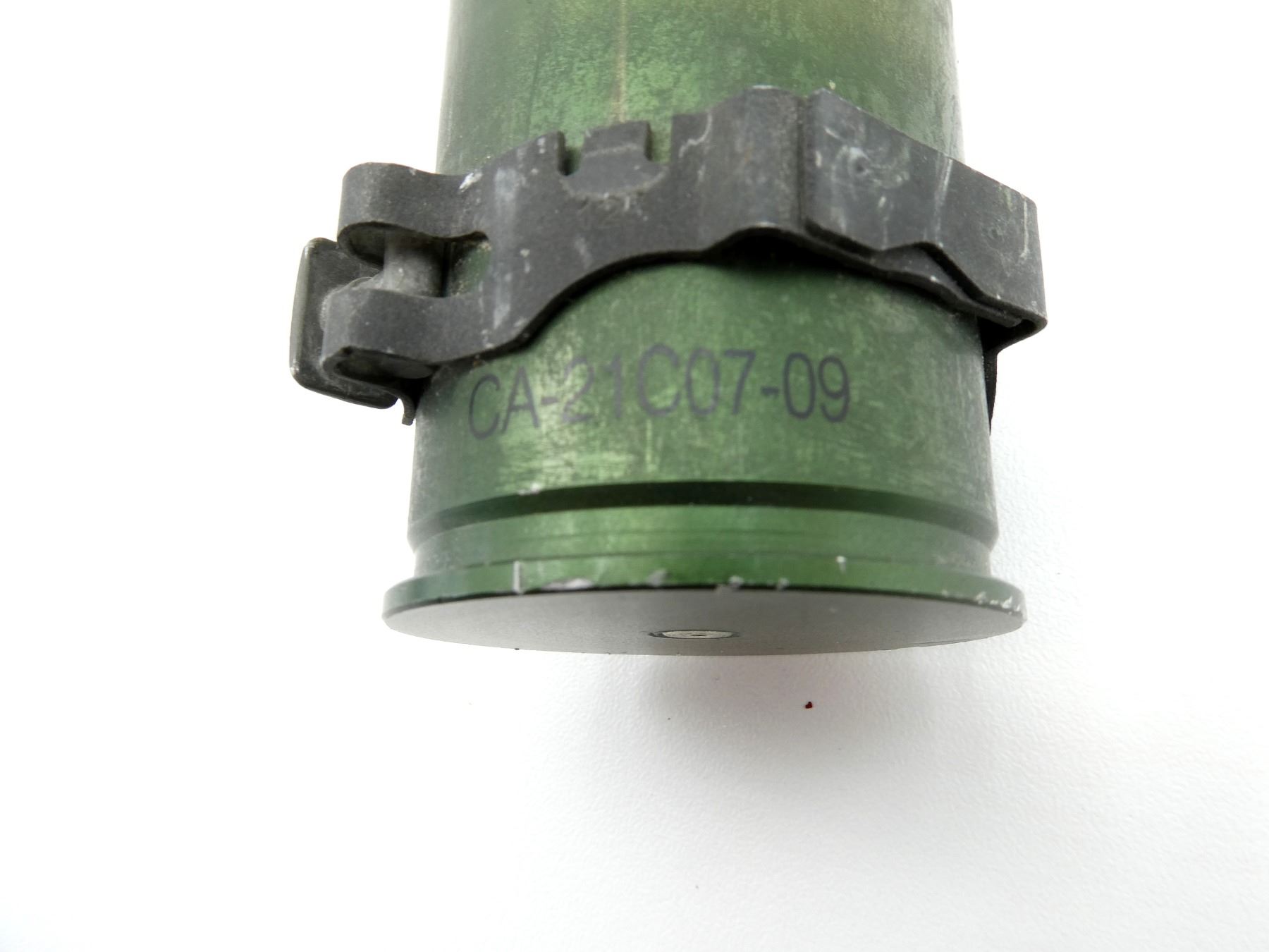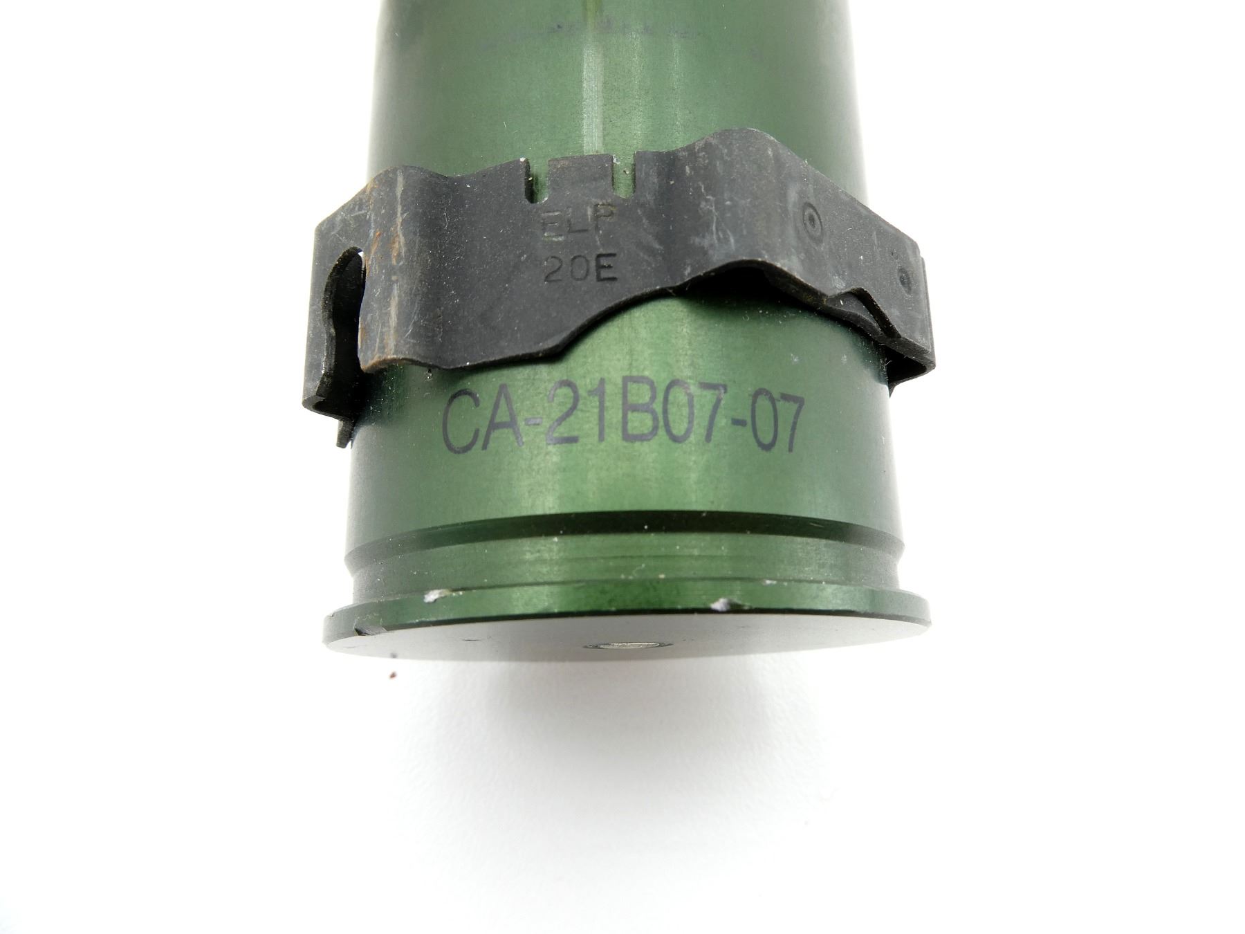 LOT INCLUDES; (4) 40MM SHELL CASINGS, FIRED PRIMER, GREEN PAINTED, NON-MAGNETIC METAL, MARKED: "CA-21C07-09", "CA-21B07-07", STEEL BAND AROUND CASINGS, VARIOUS MARKINGS ON BANDS, APPROX. 1.75" DIA. & OALS APPROX. 2". SEE PHOTOS.