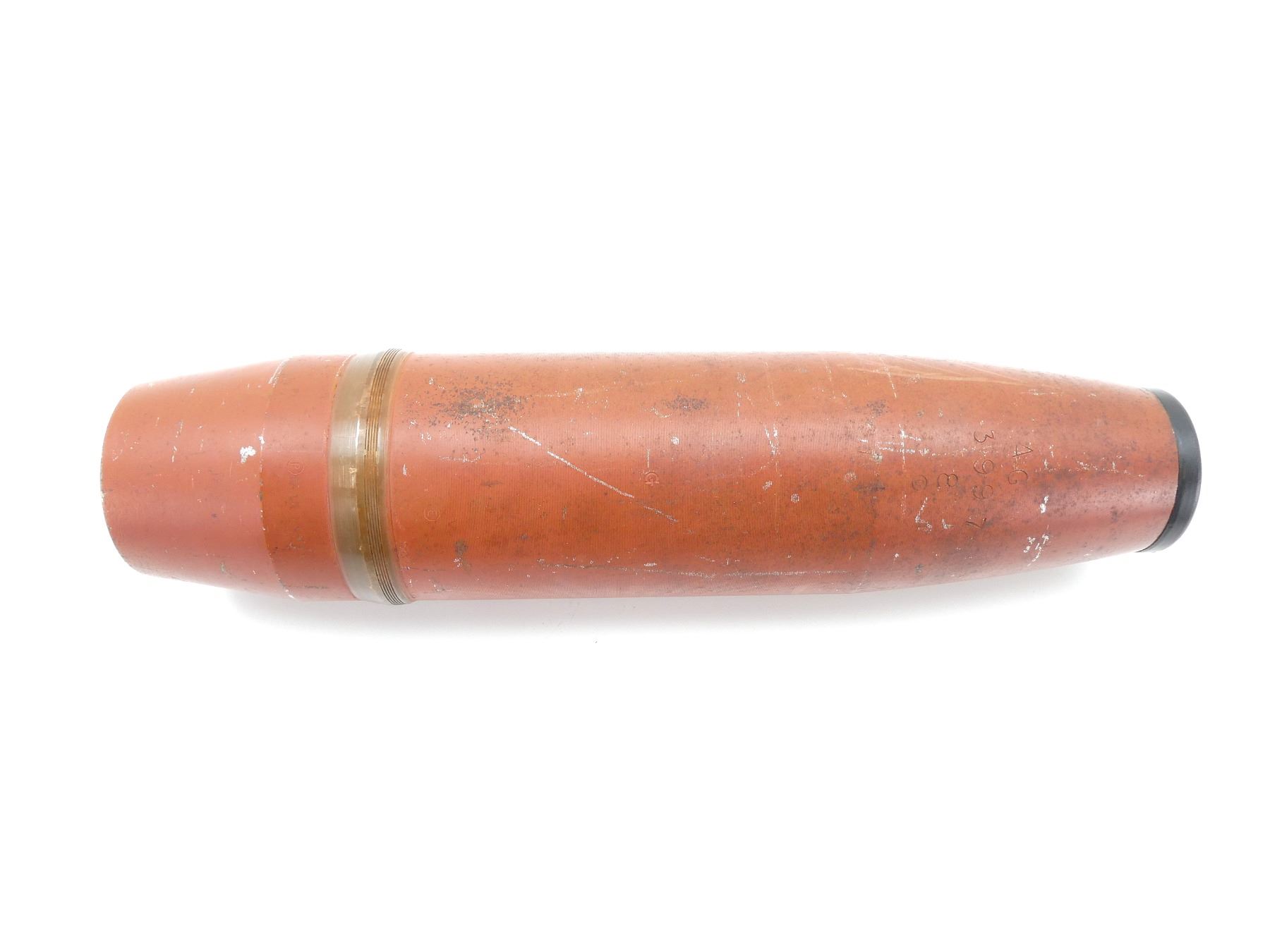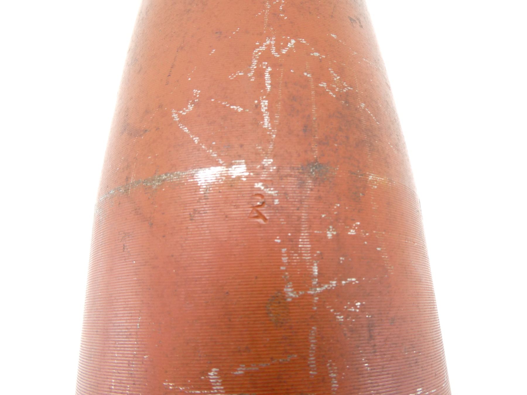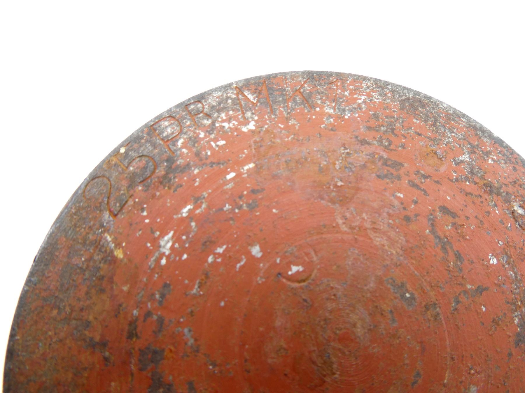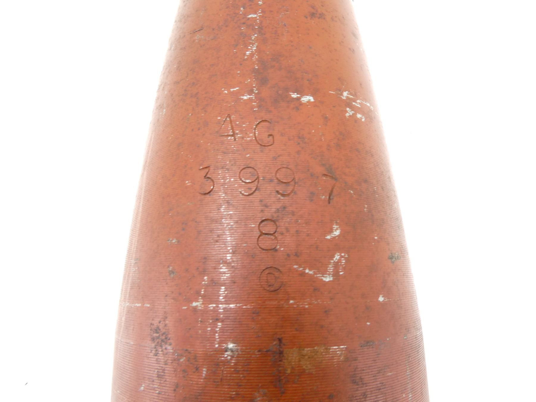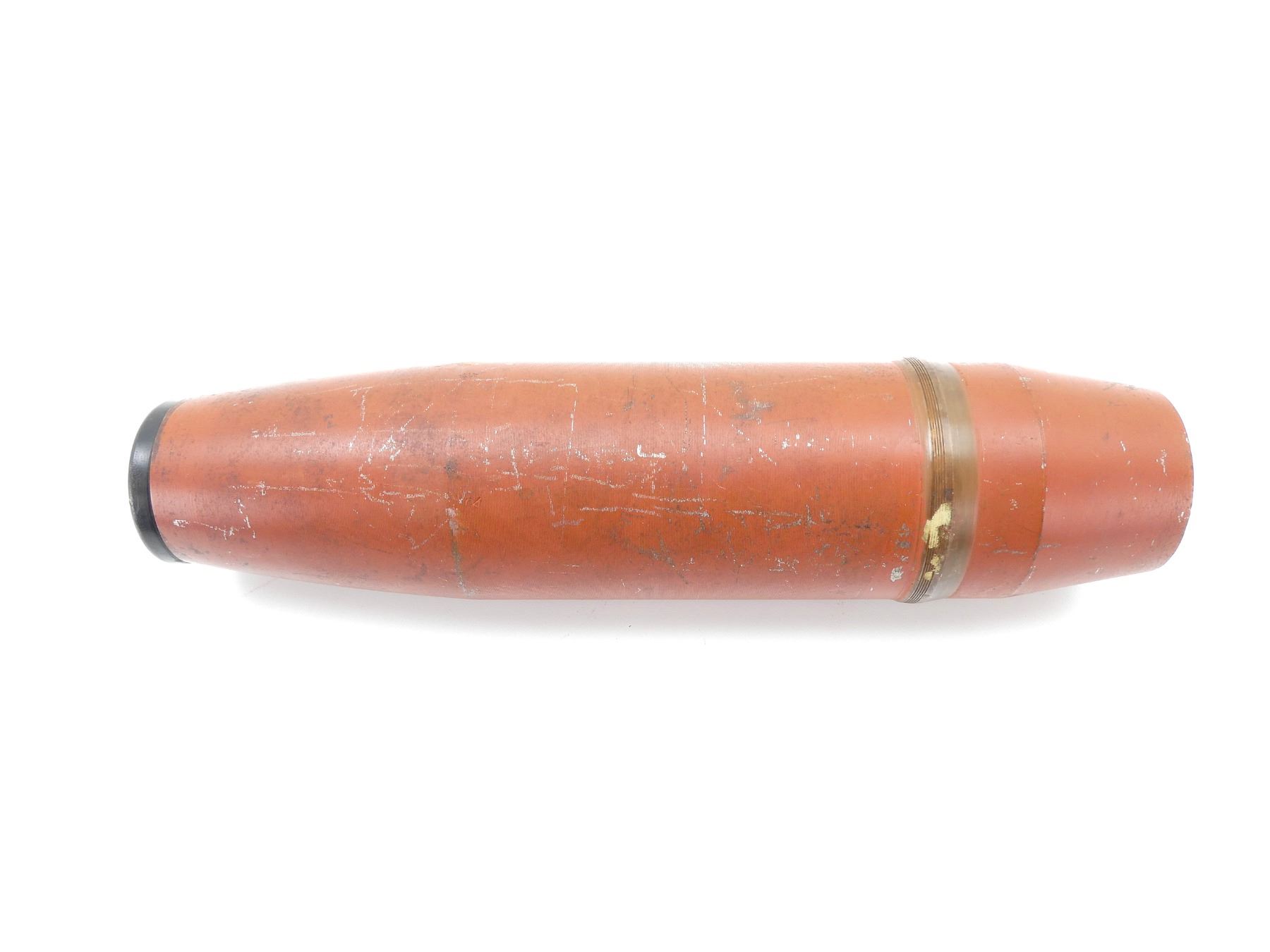 (1) RED PAINTED STEEL PROJECTILE WITH COPPER DRIVING BAND, BLACK POLYMER NOSE PLUG, PLUG MARKED: "V.M.C., 52, NO. 1 IZ", PROJECTILE BODY MARKED: "AG, 3997, 8", "D" IN A CIRCLE, VARIOUS OTHER PROOF MARKS, BASE MARKED: "25 PR MK1", "9-53", "C" WITH AN "A" INSIDE, PARTIAL C-BROAD ARROW, FAINT PROOF MARK, APPROX. 2 5/8" DIA. & OVERALL LENGTH APPROX. 14". SEE PHOTOS.