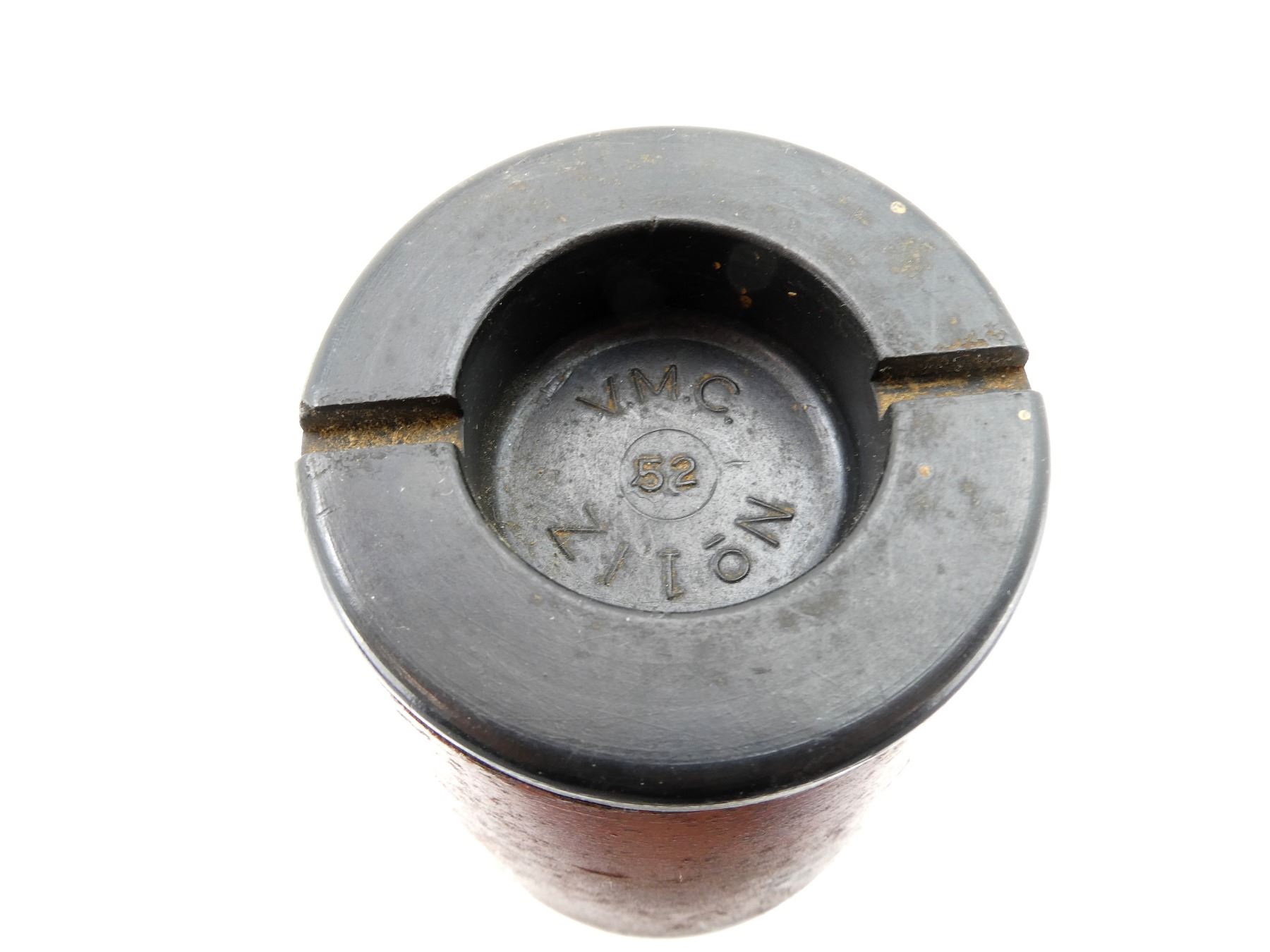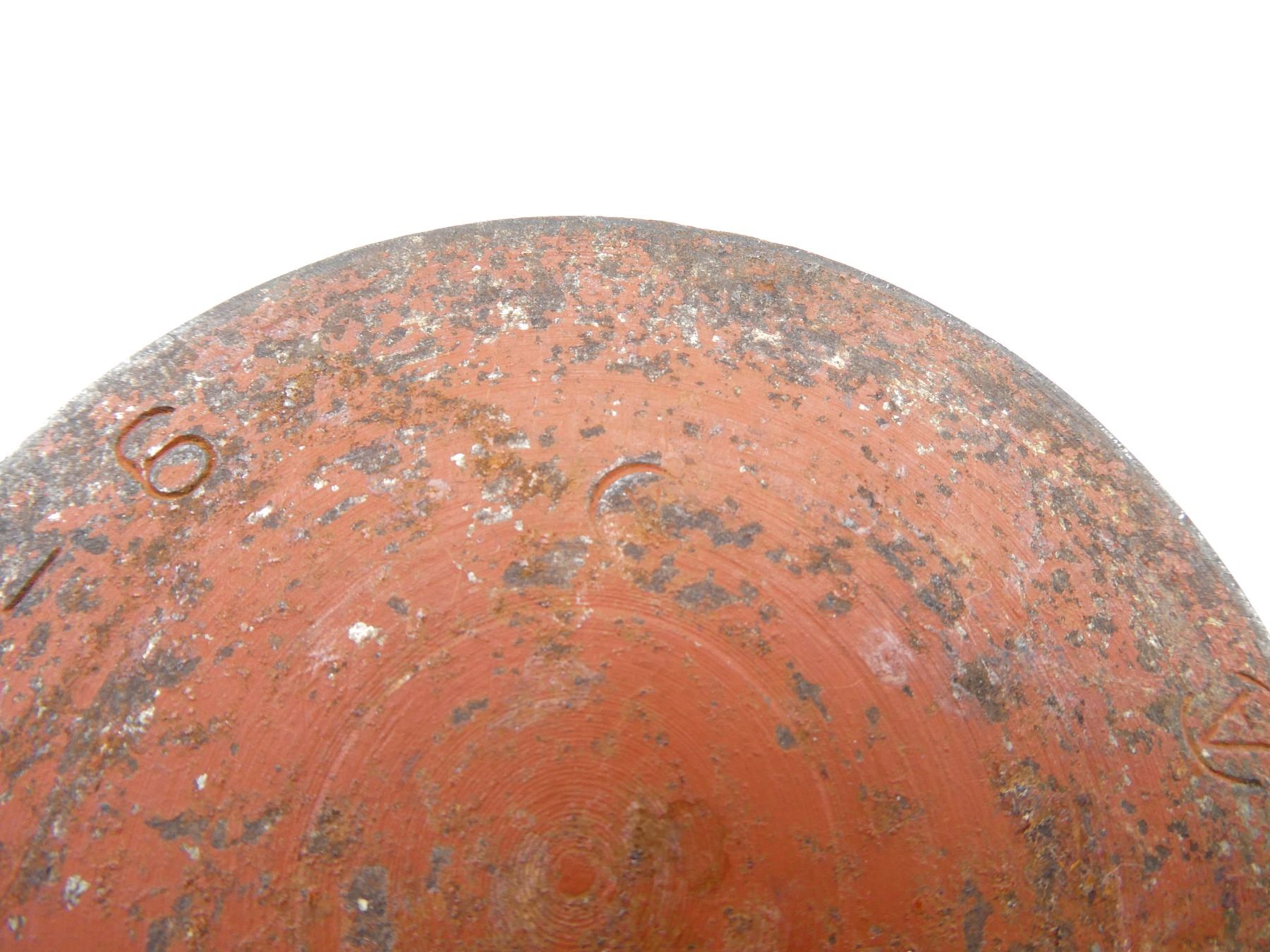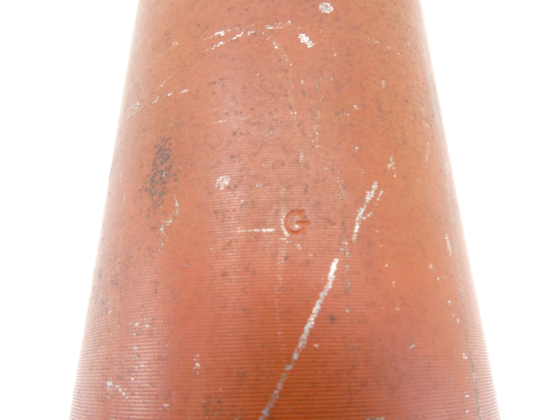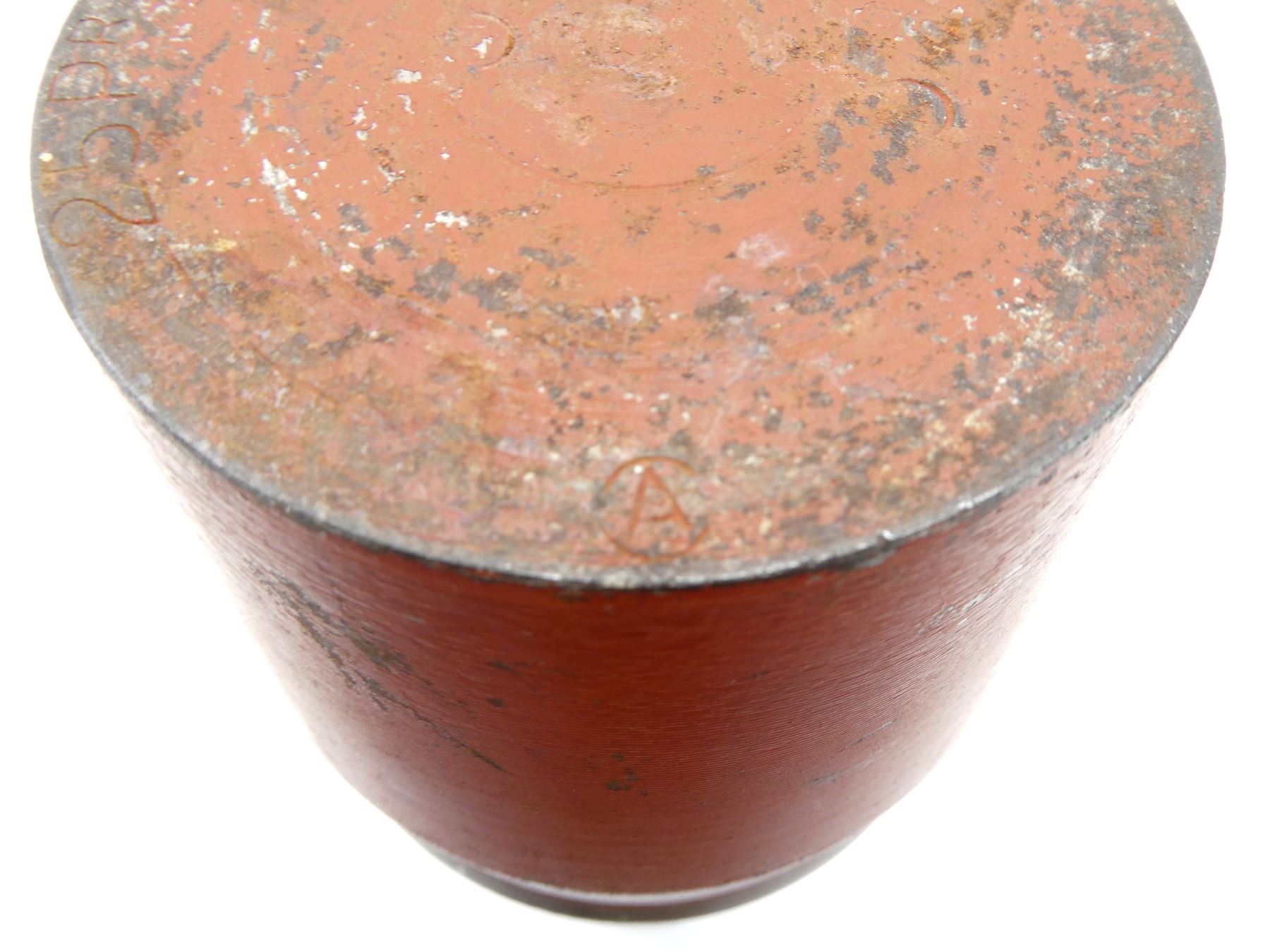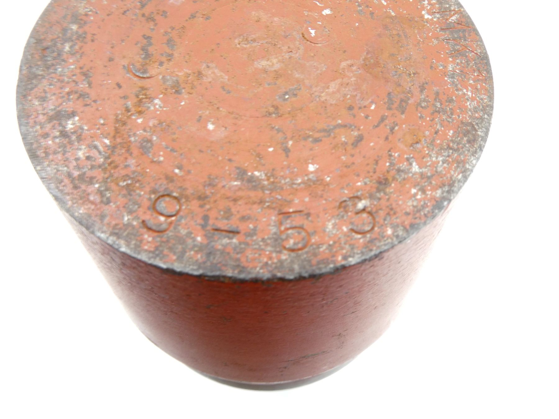 (1) RED PAINTED STEEL PROJECTILE WITH COPPER DRIVING BAND, BLACK POLYMER NOSE PLUG, PLUG MARKED: "V.M.C., 52, NO. 1 IZ", PROJECTILE BODY MARKED: "AG, 3997, 8", "D" IN A CIRCLE, VARIOUS OTHER PROOF MARKS, BASE MARKED: "25 PR MK1", "9-53", "C" WITH AN "A" INSIDE, PARTIAL C-BROAD ARROW, FAINT PROOF MARK, APPROX. 2 5/8" DIA. & OVERALL LENGTH APPROX. 14". SEE PHOTOS.