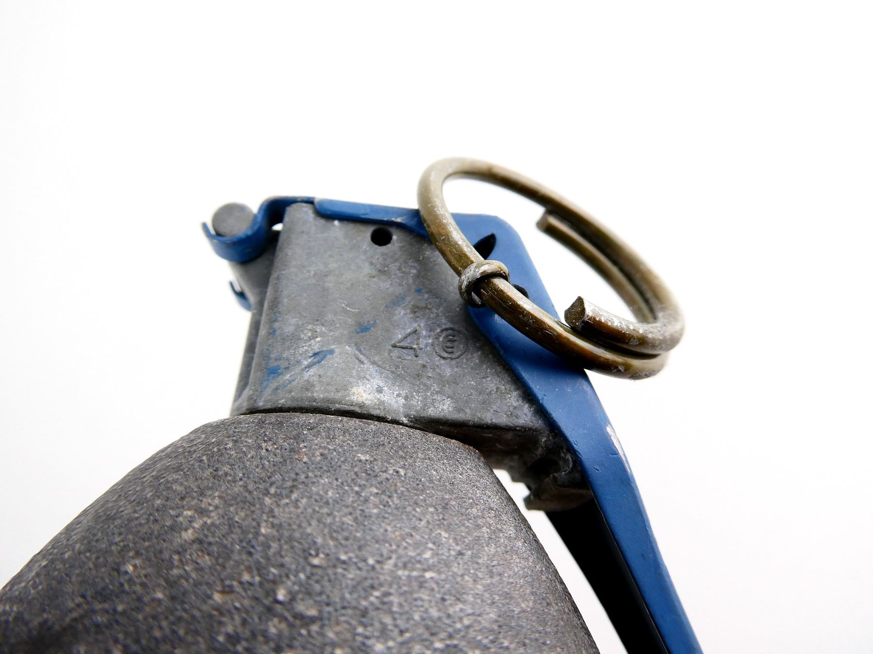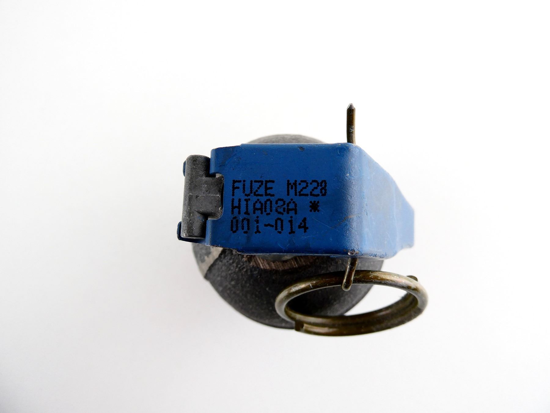 (1) CAST STEEL WITH HOLE IN BOTTOM, LONG SPOON & PULL RING, FUZE MARKED: "FUZE M228, HIA02A *, 001-014", APPROX. 2 3/8" DIA. & OVERALL LENGTH APPROX. 4.25". SEE PHOTOS.