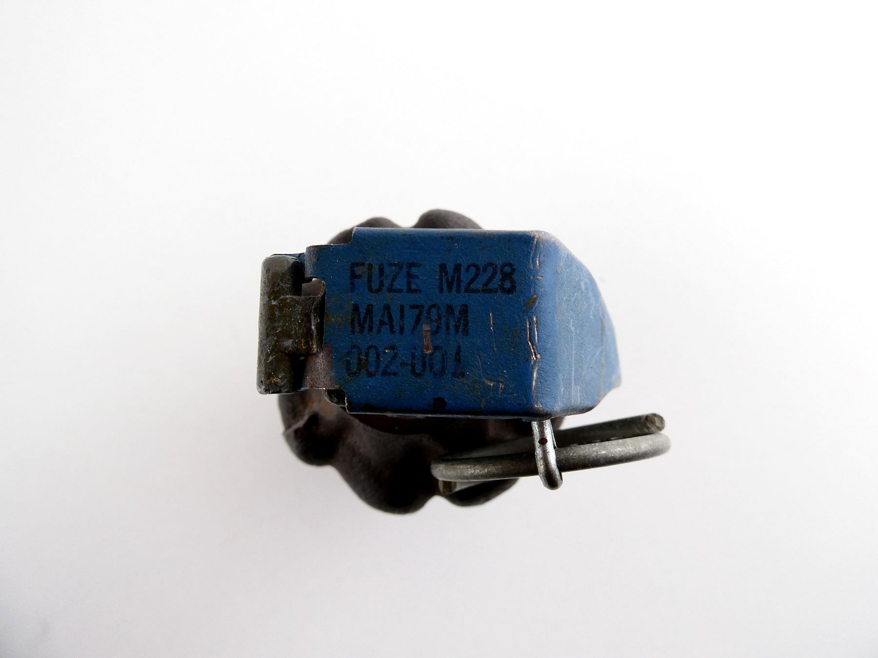 (1) CAST STEEL WITH HOLE IN BOTTOM, LONG SPOON & PULL RING, FUZE MARKED: "FUZE M228, MA179M, 002-001", BODY MARKED: "MLM", APPROX. 2.25" DIA. & OVERALL LENGTH APPROX. 4 3/8". SEE PHOTOS.