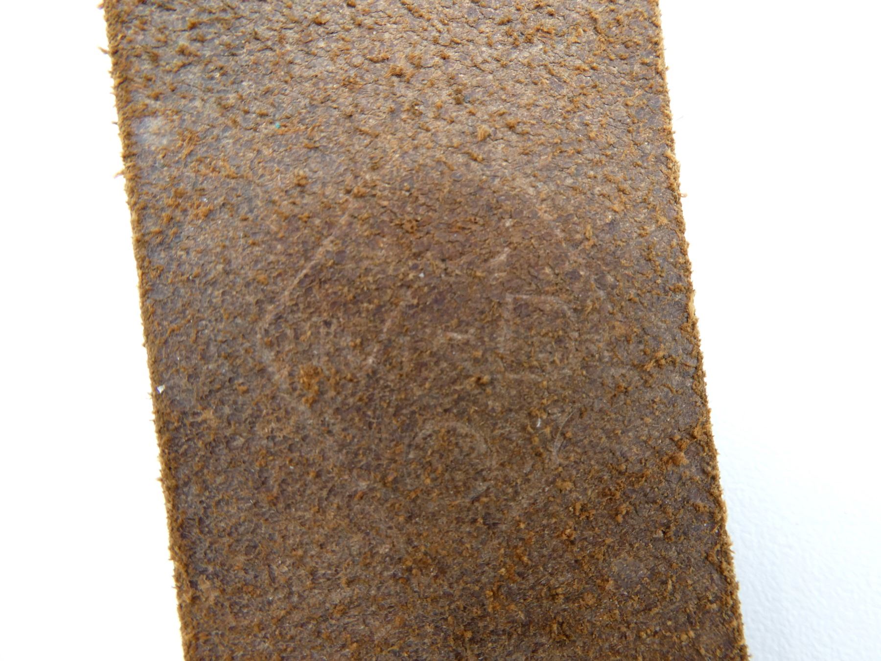 (1) BROWN LEATHER SLING, FAINTLY MARKED: "1899, M-D, O" IN A DIAMOND, MISSING LEATHER THONG TIE, APPROX. 1 3/8" WIDE & OVERALL LENGTH APPROX. 39.25". SEE PHOTOS.