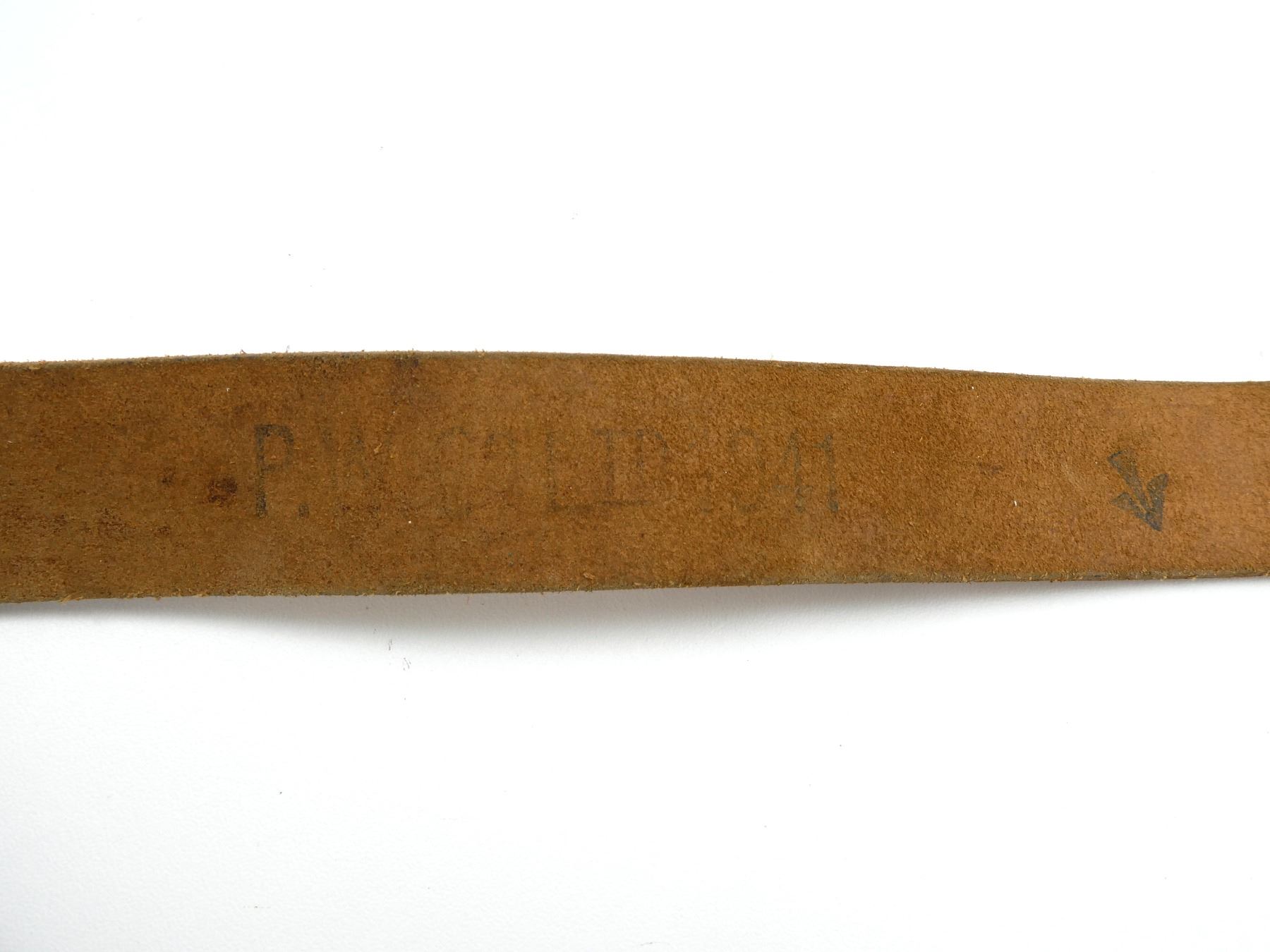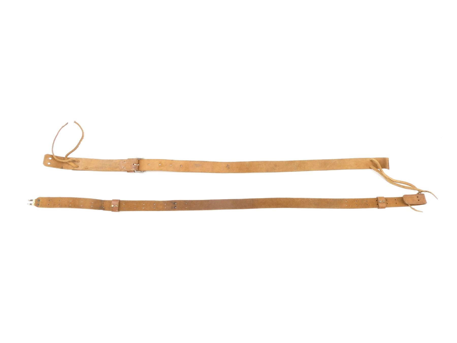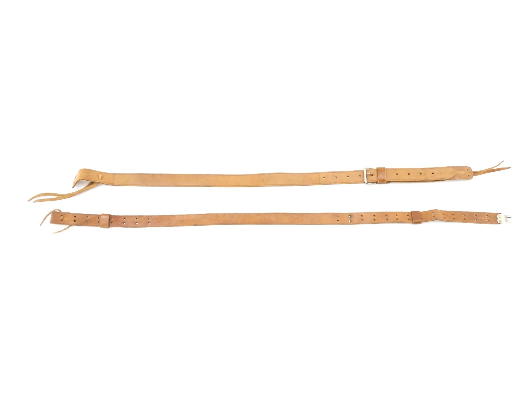 LOT INCLUDES; (1) WWII BRITISH TAN LEATHER RIFLE SLING, MARKED: "P.W.CO. LTD. 1941" WITH BROAD ARROW, OVERALL LENGTH APPROX. 38", ADJUSTABLE & (1) REPRODUCTION U.S. MILITARY 1907 STYLE PARTIAL RIFLE SLING, TAN LEATHER, METAL HOOK MARKED: "JAPAN", OVERALL LENGTH APPROX. 44.75". SEE PHOTOS.