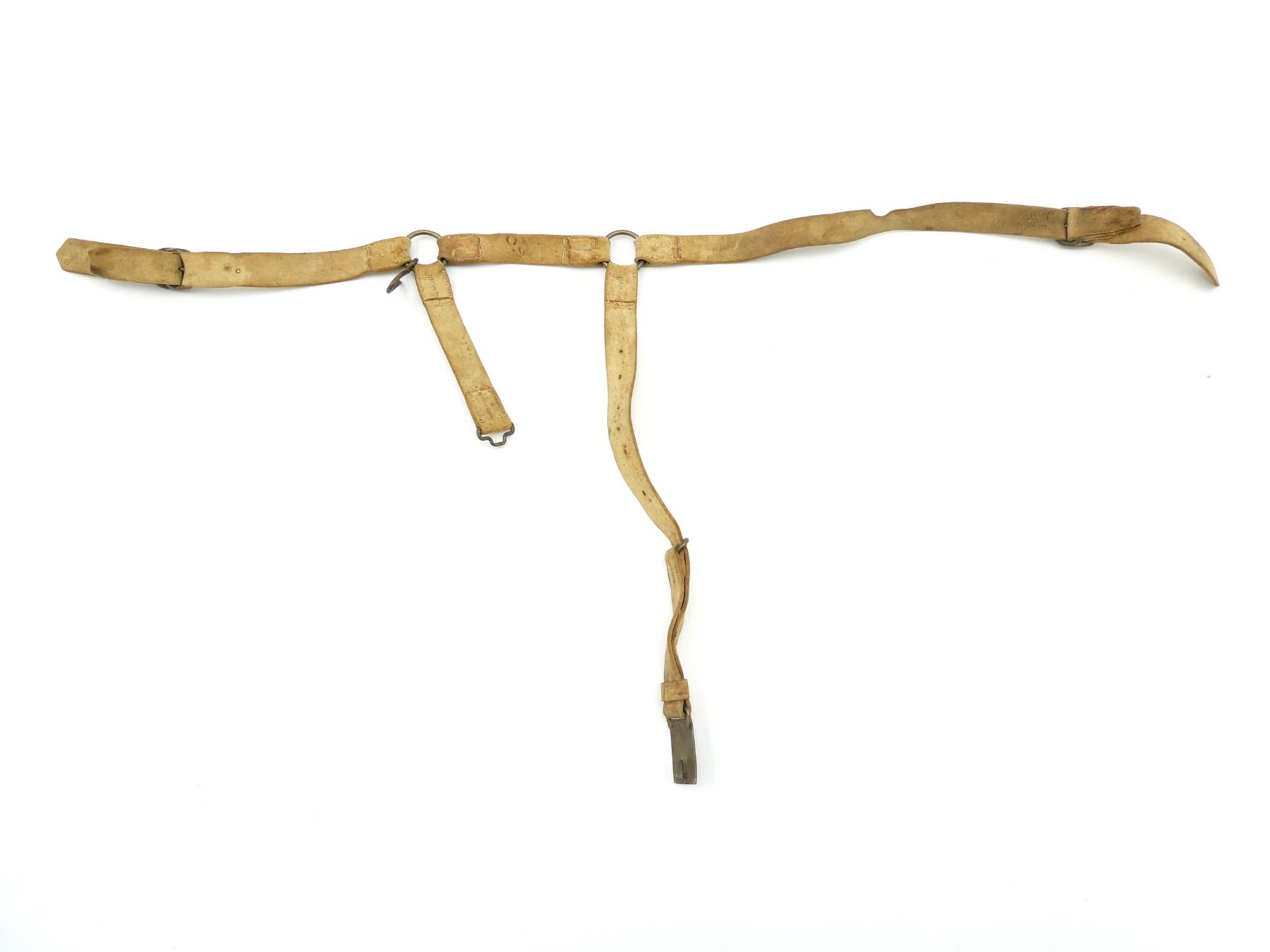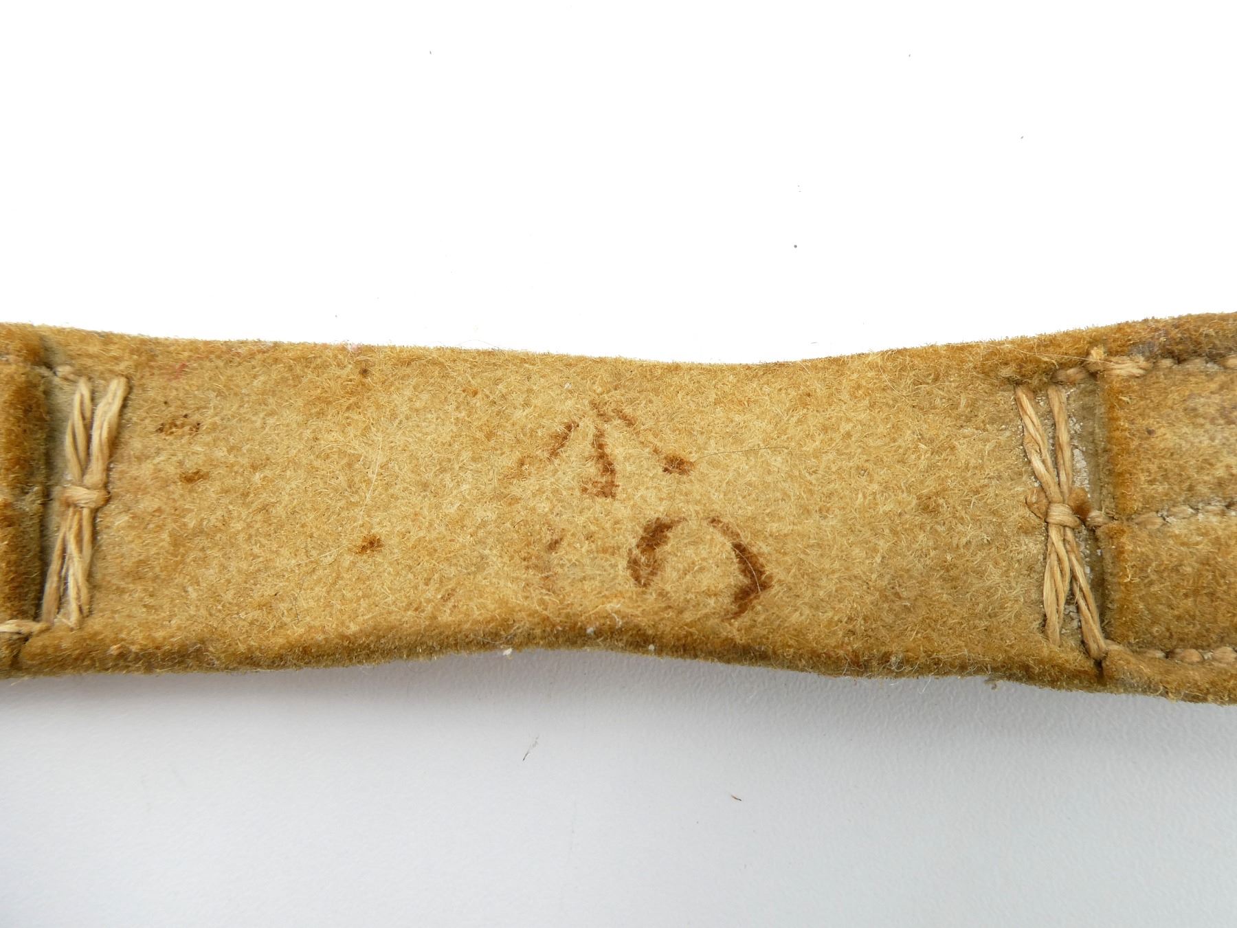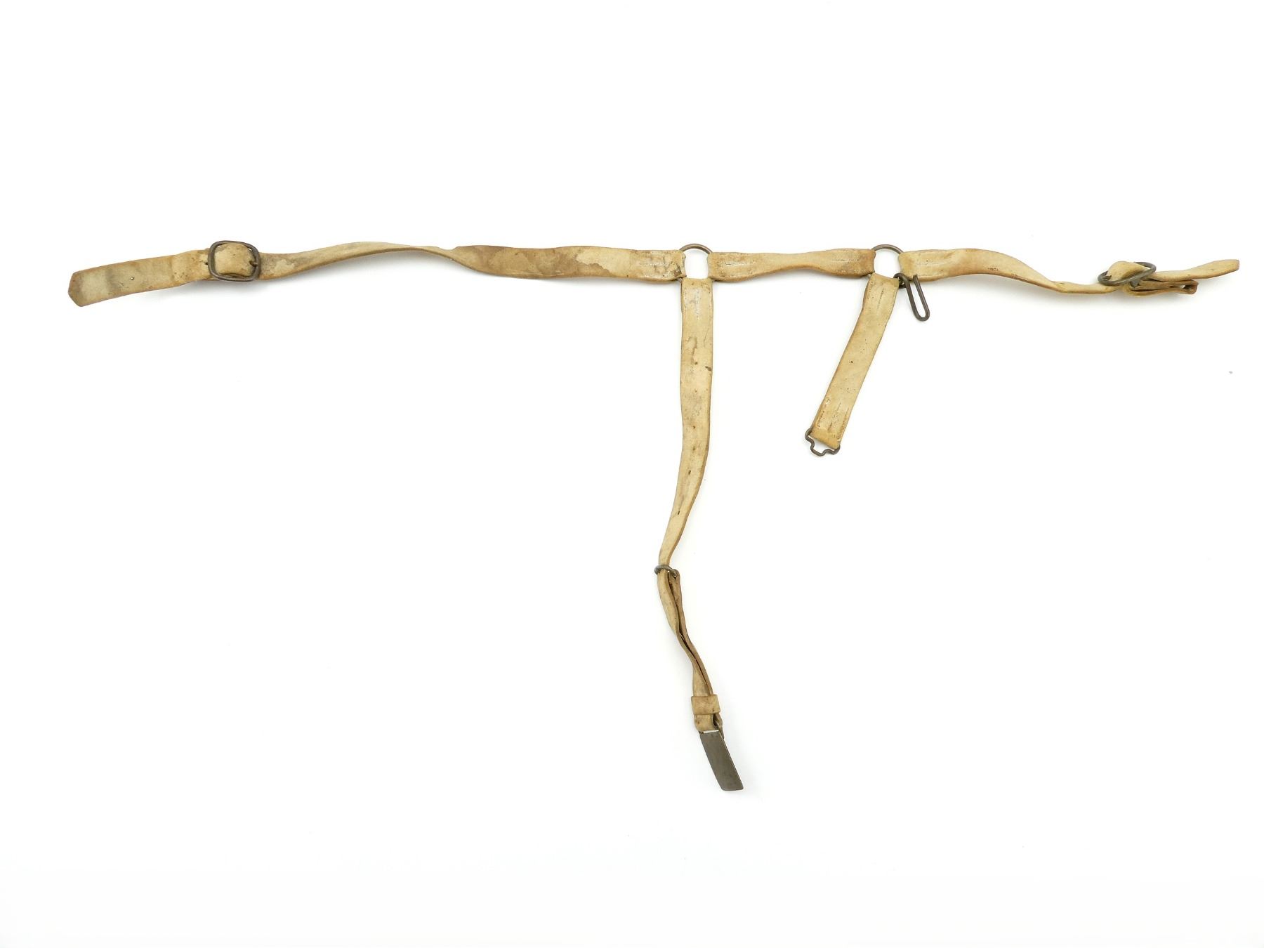 (1) WHITE BUFF LEATHER SWORD BELT WITH STRAPS, BRASS FITTINGS, LEATHER MARKED: BROAD ARROW OVER "?O", SHOWS AGE / WEAR / TEAR, OVERALL LENGTH APPROX. 37", ADJUSTABLE. SEE PHOTOS.