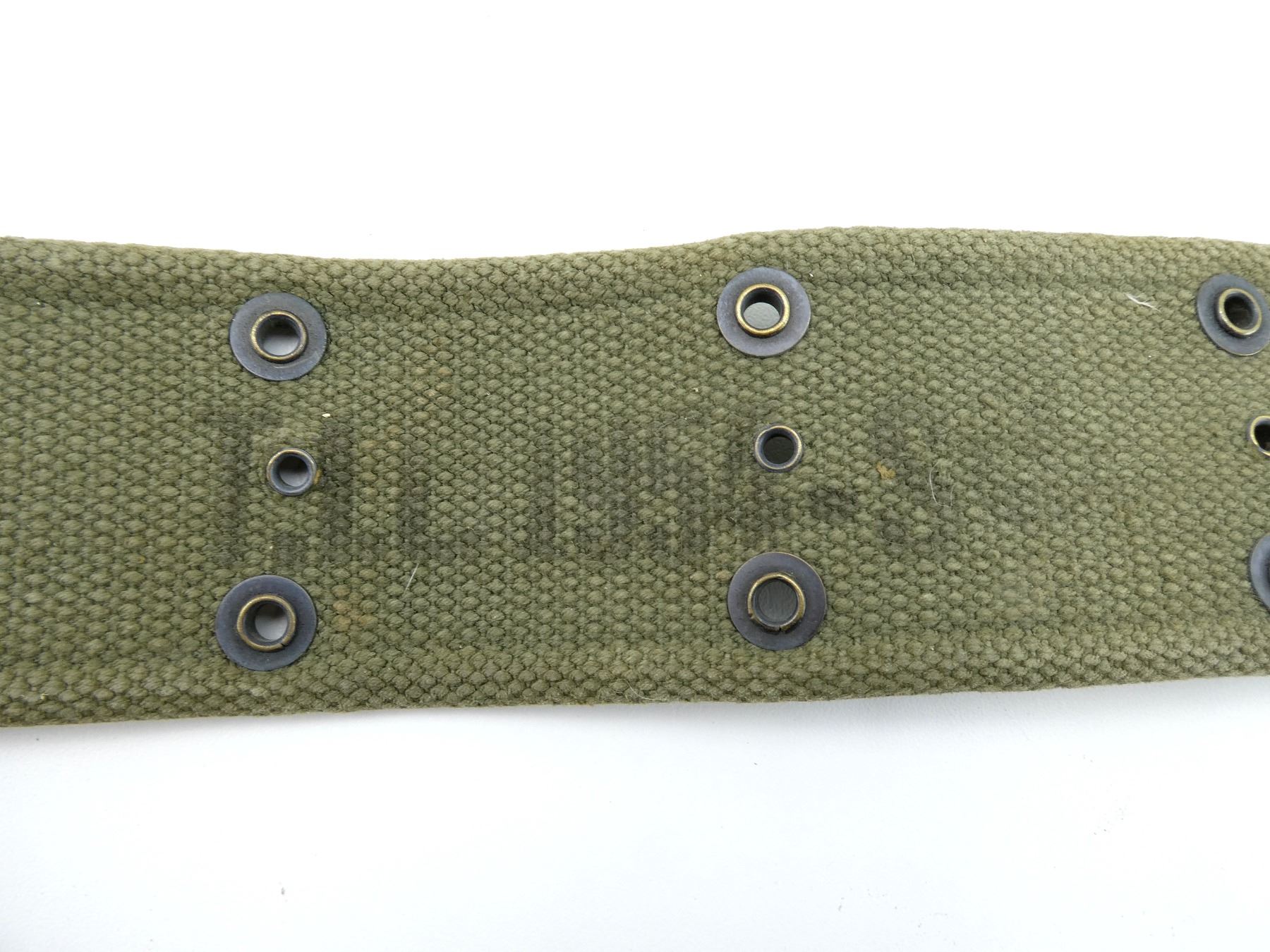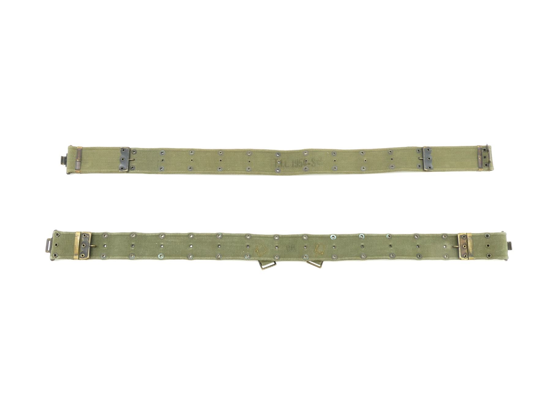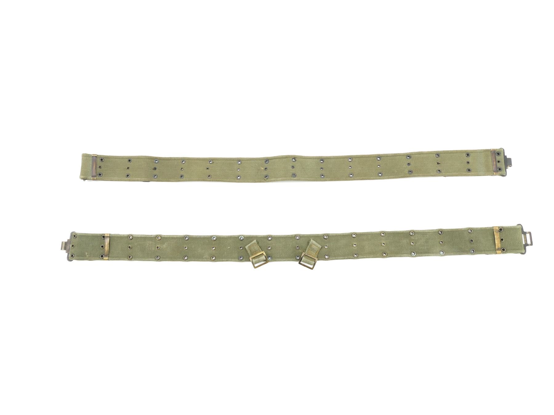 LOT INCLUDES; (1) GREEN CANVAS WEB BELT, BRASS FITTINGS, NO VISIBLE MARKINGS, SHOWS AGE / WEAR, OVERALL LENGTH APPROX. 39.5", ADJUSTABLE & (1) GREEN CANVAS WEB BELT, BRASS FITTINGS, MARKED: "T.I.L. 1954-S?", OVERALL LENGTH APPROX. 38.5", ADJUSTABLE. SEE PHOTOS.