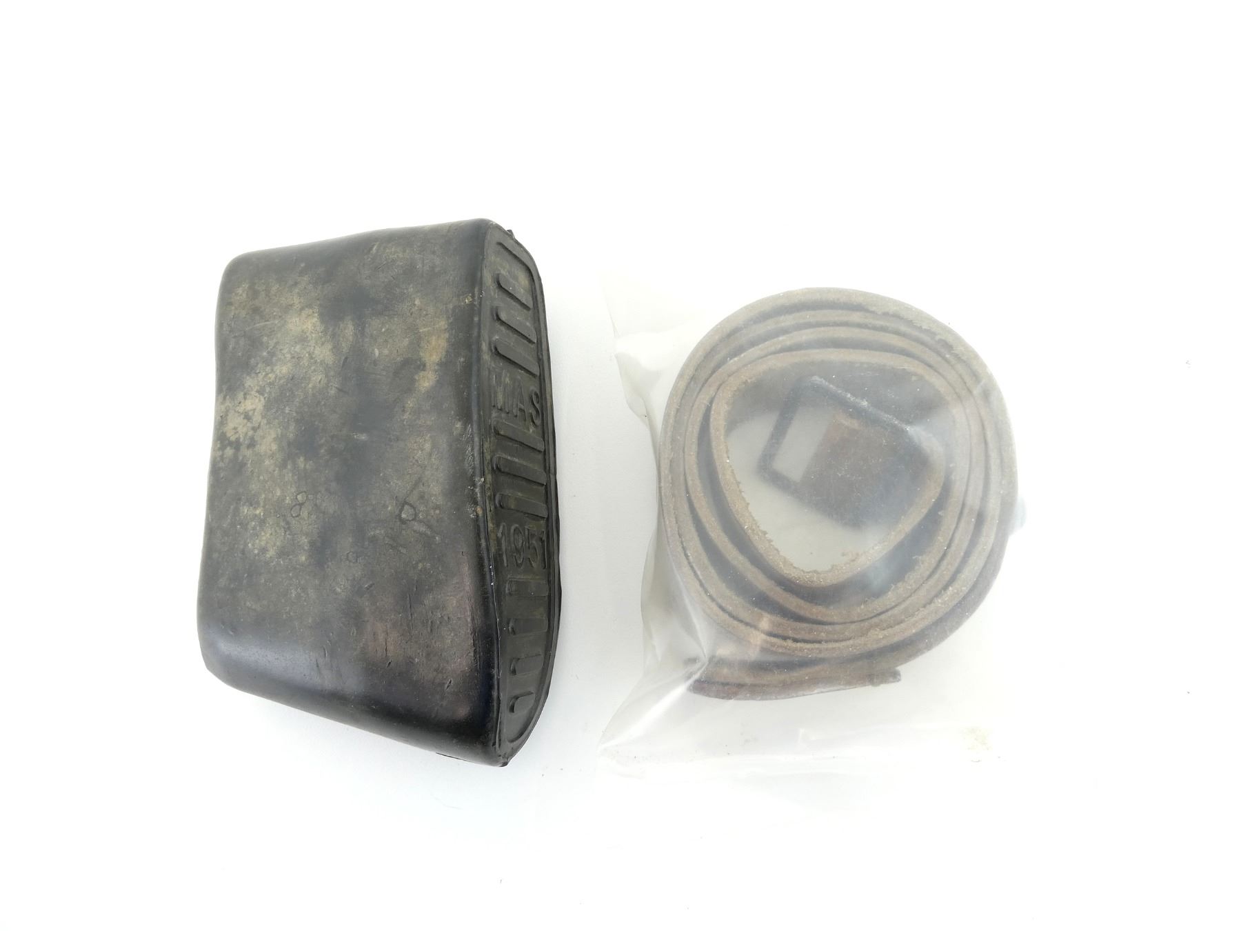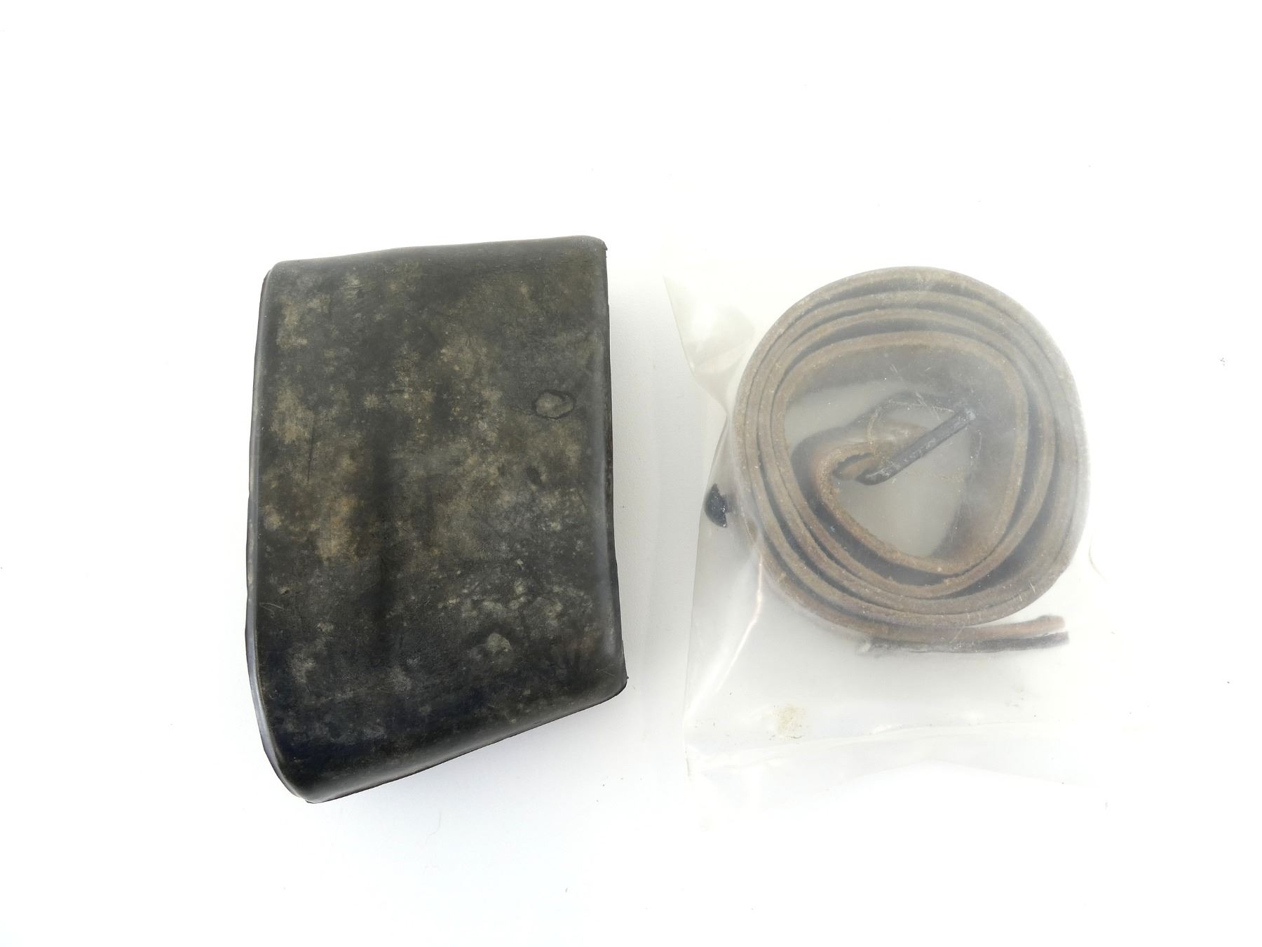 (1) BLACK RUBBER RECOIL PAD, MARKED: "MAS, 1951", SLIP ON STYLE & (1) FRENCH MILITARY STYLE BROWN / TAN SLING, FITS VARIOUS FRENCH RIFLES, NEW OLD STOCK, IN UN-OPENED PACKING. SEE PHOTOS.