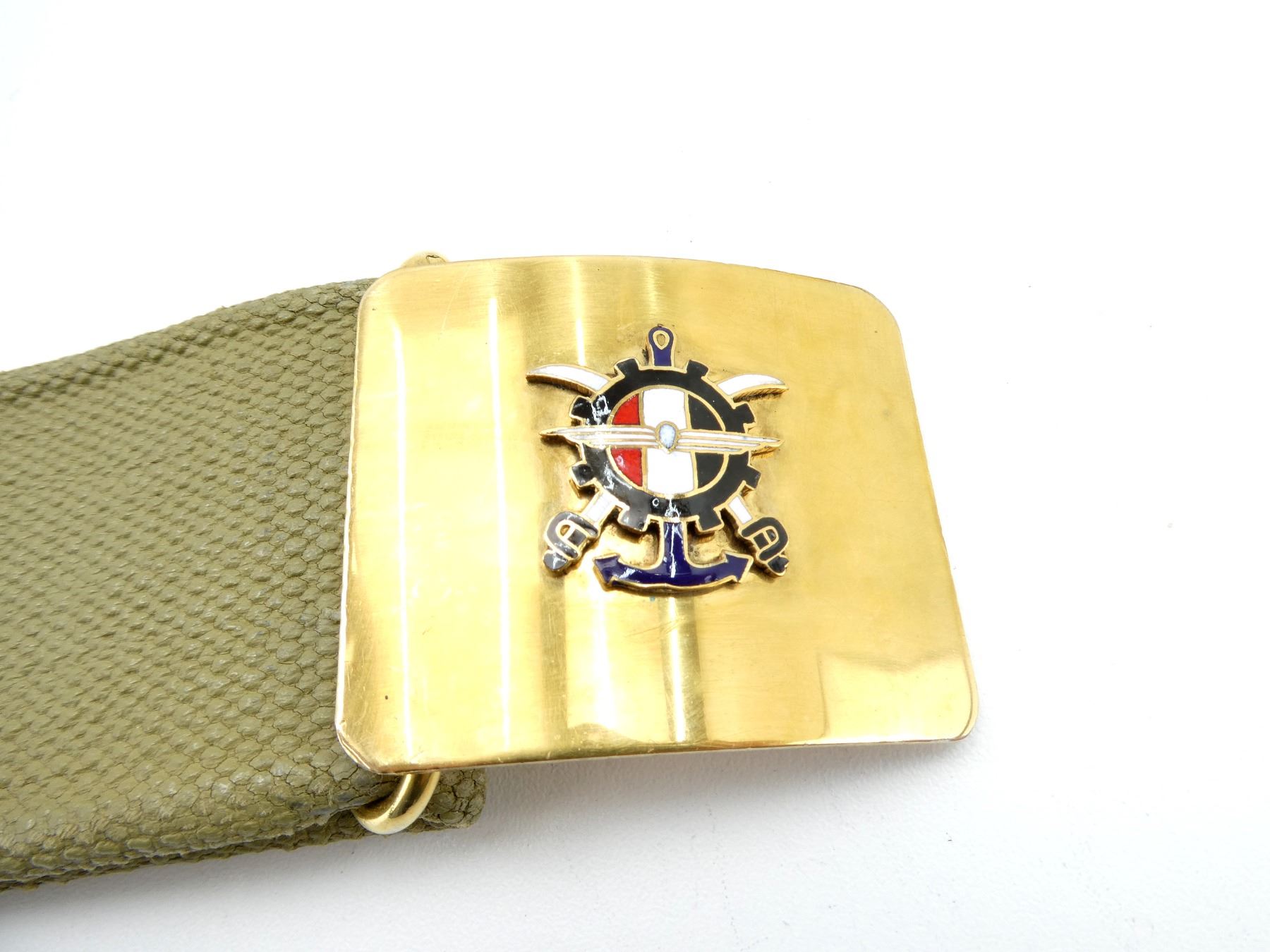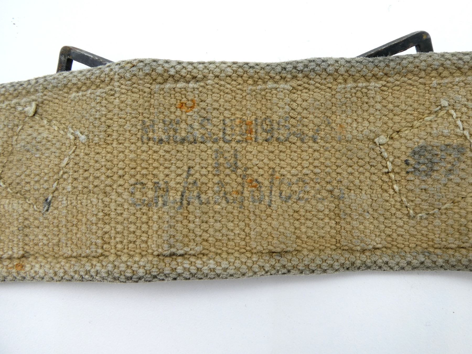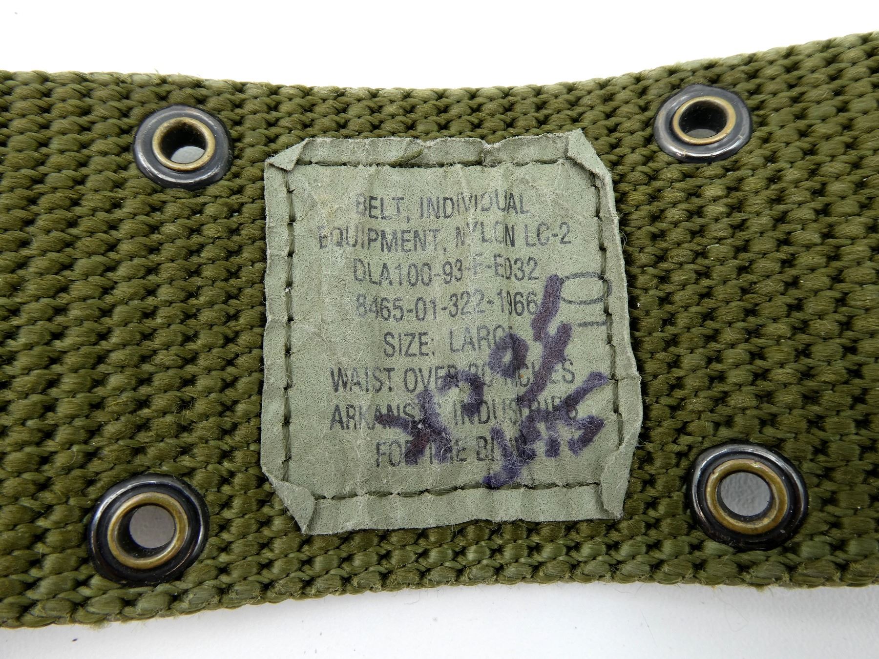 LOT INCLUDES; (1) INDIVIDUAL EQUIPMENT BELT, GREEN NYLON, METAL FITTINGS, PLASTIC BUCKLE, MARKED: "BELT, INDIVIDUAL, EQUIPMENT, NYLON LC-2, DLA100-93-F-ED32" ETC., SIZE LARGE, OVERALL LENGTH APPROX. 45.5", (2) RIGGER BELTS, BLACK / GREY NYLON, VELCRO, BLACK BELT WITH VARIOUS MARKINGS ON BUCKLES, OTHER HAS NO VISIBLE MARKINGS, OALS APPROX. 42.75" & 46", (1) BRITISH MILITARY BLACKENED TAN P37 WEB BELT, FAINTLY MARKED: "M.W.&S. LTD 1954" WITH BROAD ARROW & VARIOUS OTHER FAINT / UN-CLEAR MARKINGS, STEEL FITTINGS, SHOWS AGE / WEAR, OVERALL LENGTH APPROX. 35.5", ADJUSTABLE, (1) EGYPTIAN NAVY WEB BELT WITH NAVAL BELT BUCKLE, GREEN PAINTED BELT, BACK OF BUCKLE HAS EGYPTIAN WRITING, OVERALL LENGTH APPROX. 45" & (1) WWII BRITISH TAN P37 WEB MARK III BASIC POUCH, MARKED: "BAGCRAFT LTD., 1942", "MK III", BROAD ARROW OF "?56", BRASS FITTINGS / BELT HOOKS. SEE PHOTOS.