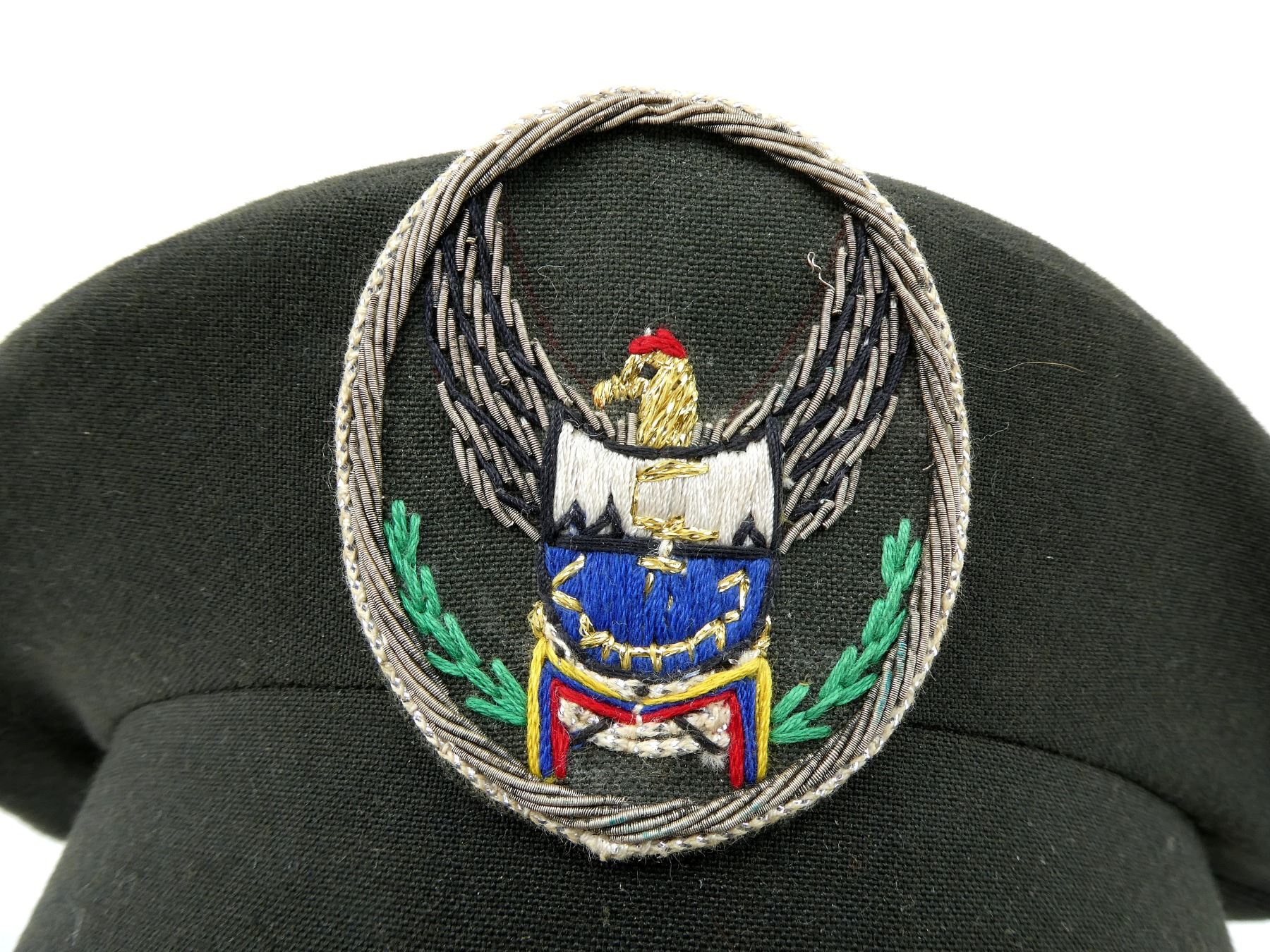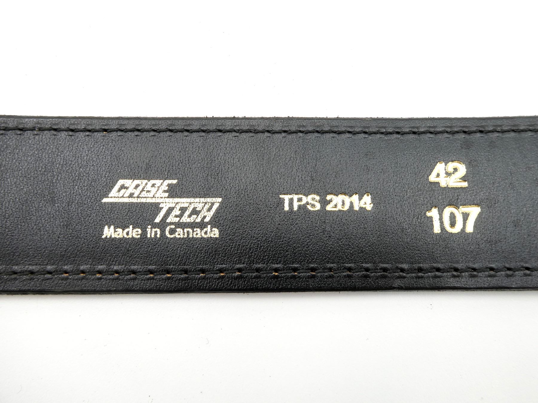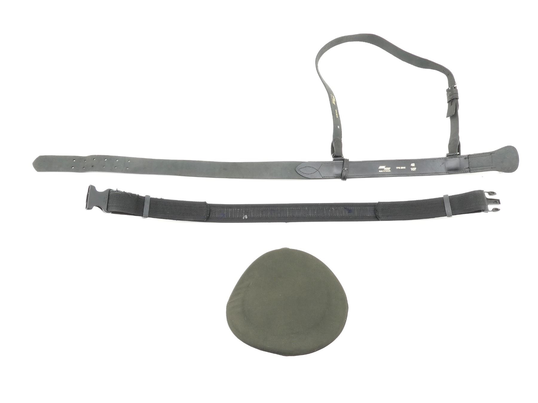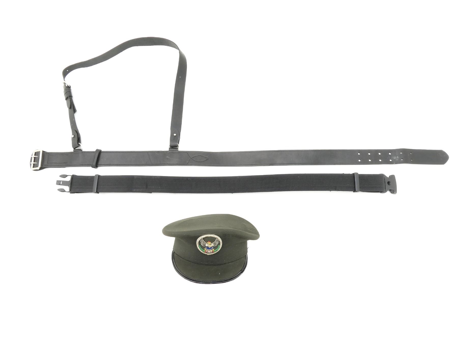 LOT INCLUDES; (1) MILITARY DUTY BELT, BLACK NYLON, LABEL MARKED: "UNCLE MIKE'S SIDEKICK, X-LARGE", PLASTIC FITTINGS, OVERALL LENGTH APPROX. 41.5", ADJUSTABLE, (1) BLACK LEATHER MILITARY DUTY BELT WITH SHOULDER STRAP, BELT MARKED: "CASE TECH, MADE IN CANADA, TPS 2014, 42, 107", STRAP MARKED: "CASE TECH, MADE IN CANADA, TPS 2014, R", METAL FITTINGS, OVERALL LENGTH APPROX. 52", ADJUSTABLE & (1) UNKNOWN MILITARY PEAKED CAP WITH EMBROIDERED WIRE / THREAD CAP BADGE, NO VISIBLE MARKINGS ON CAP, NO CHIN STRAP, SIZE UNKNOWN. SEE PHOTOS.