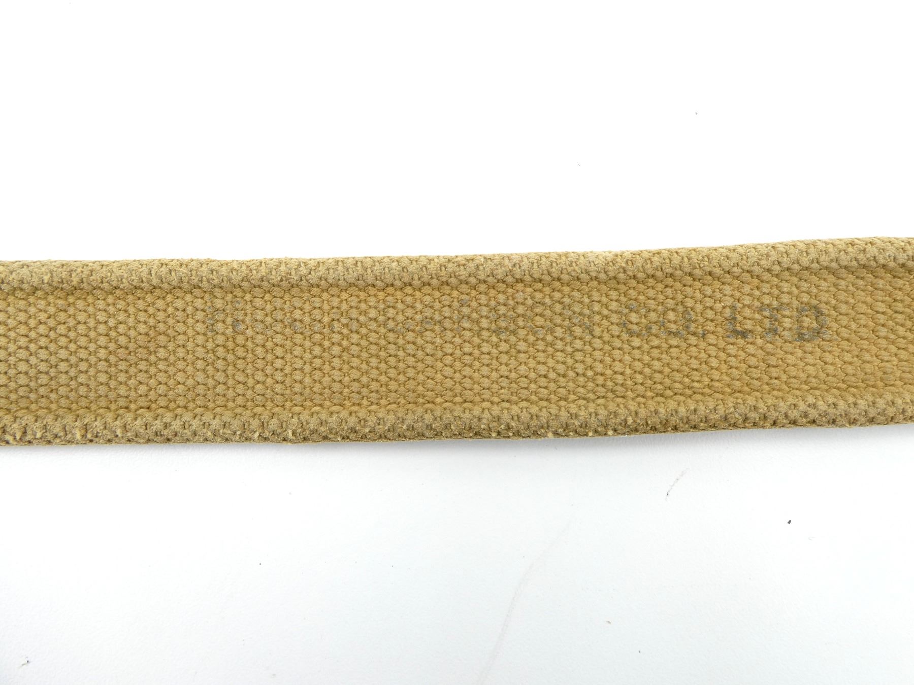 (1) TAN P37 WEB CANVAS SLING WITH FAINT / UN-CLEAR MARKINGS, BRASS FITTINGS & OVERALL LENGTH APPROX. 45.25". SEE PHOTOS.