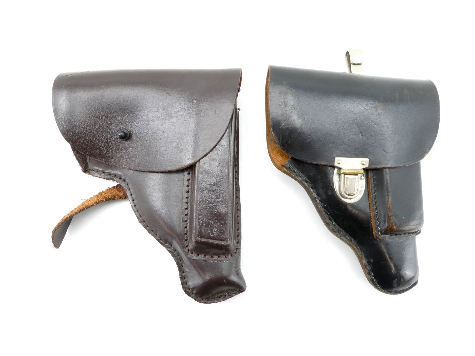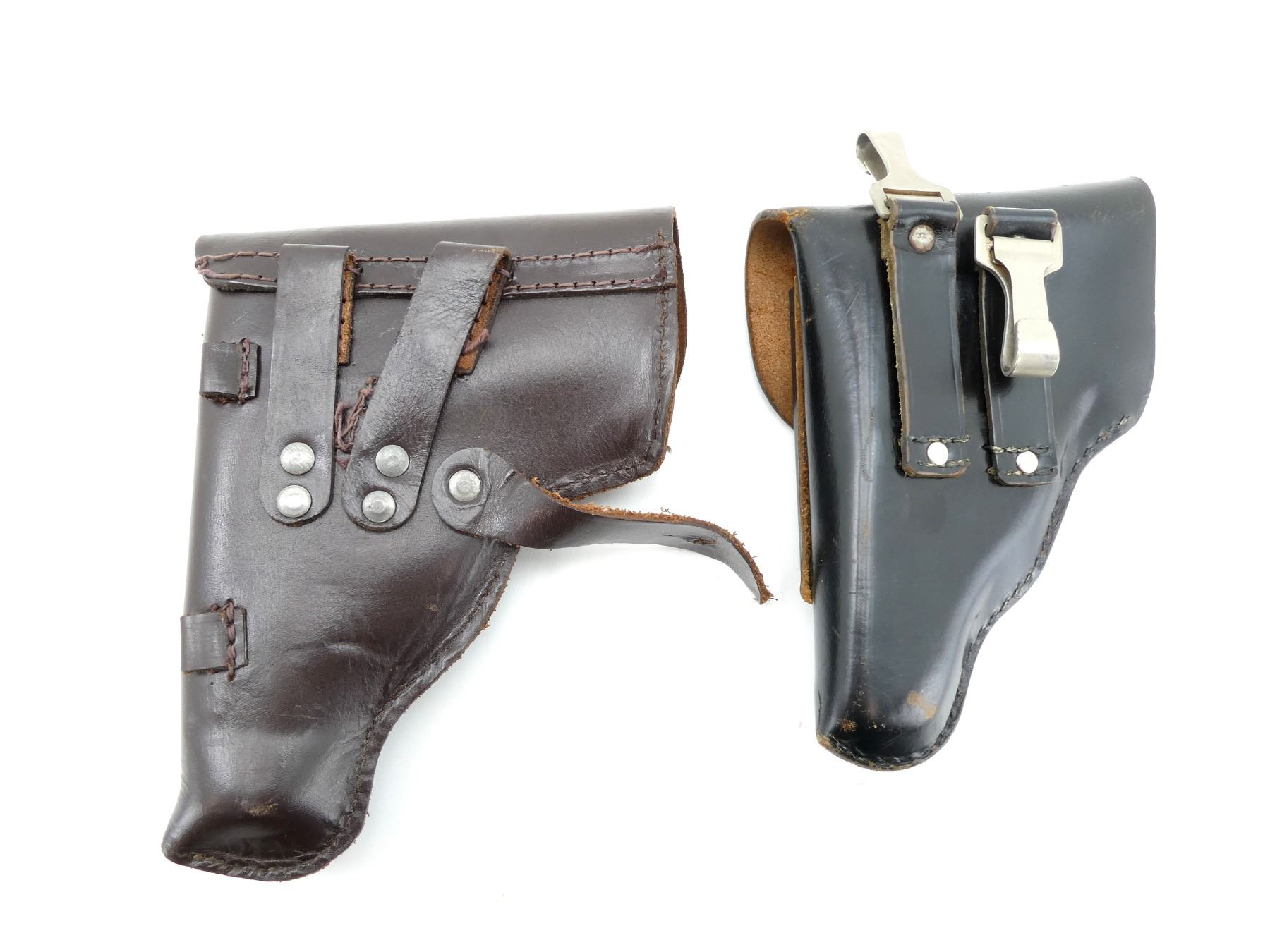 LOT INCLUDES; (1) POSSIBLY GERMAN PP/PPK SEMI-AUTO PISTOL HOLSTER, BLACK LEATHER WITH MAG SLEEVE, VARIOUS FAINT / UN-CLEAR MARKINGS ON FLAP, VARIOUS HAND-WRITTEN MARKINGS ON FLAP, METAL FITTINGS, TWO BELT LOOPS / HOOKS & (1) COMBLOC POSSIBLY MAKAROV 9MM PISTOL HOLSTER, BROWN LEATHER WITH MAG SLEEVE, LOOPS FOR CLEANING ROD (NO ROD), VARIOUS FAINT / UN-CLEAR INK STAMP MARKINGS ON FLAP, METAL FITTINGS, TWO BELT LOOPS. SEE PHOTOS.