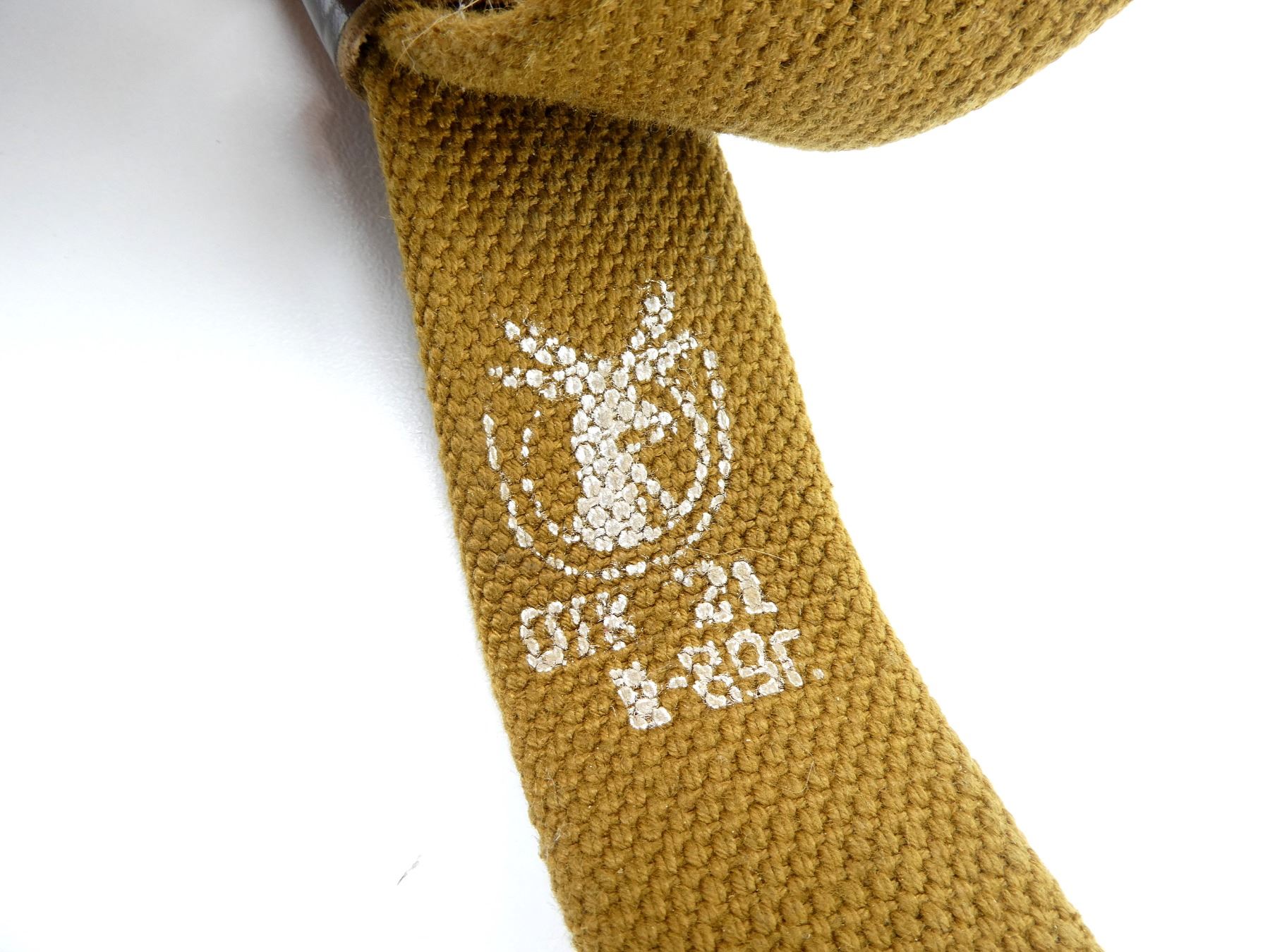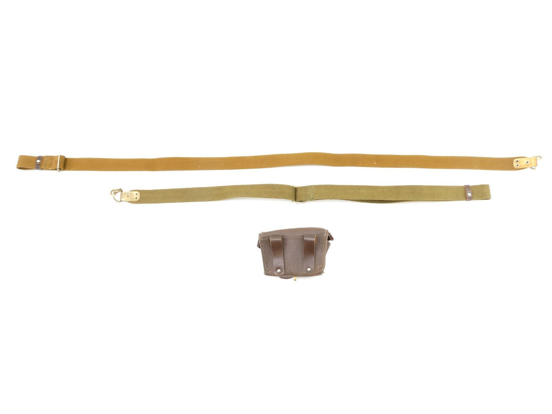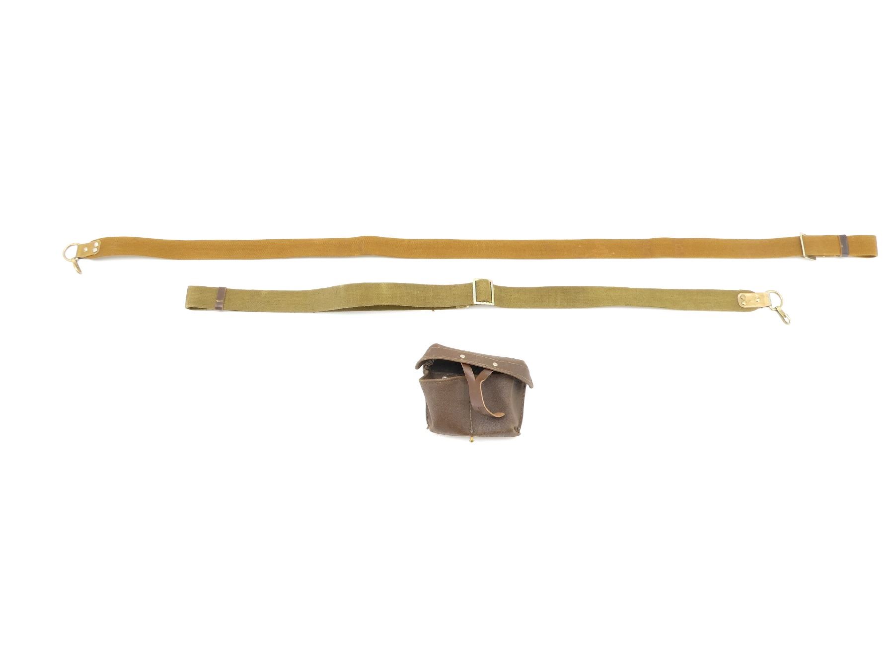 LOT INCLUDES; (2) GREEN / TAN CANVAS SKS / AK47 / AKM SLINGS, VARIOUS INK STAMP MARKINGS, STEEL FITTINGS, STEEL HOOK, OALS APPROX. 39.5" / 54.5", ADJUSTABLE & (1) SKS BROWN LEATHER AMMO POUCH, 2-POCKETS, VARIOUS INK STAMP MARKINGS, METAL / BRASS FITTINGS, TWO LEATHER BELT LOOPS. SEE PHOTOS.
