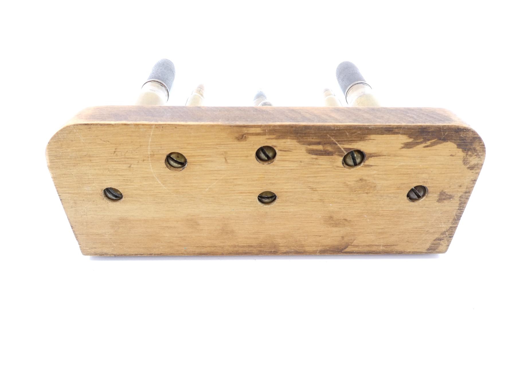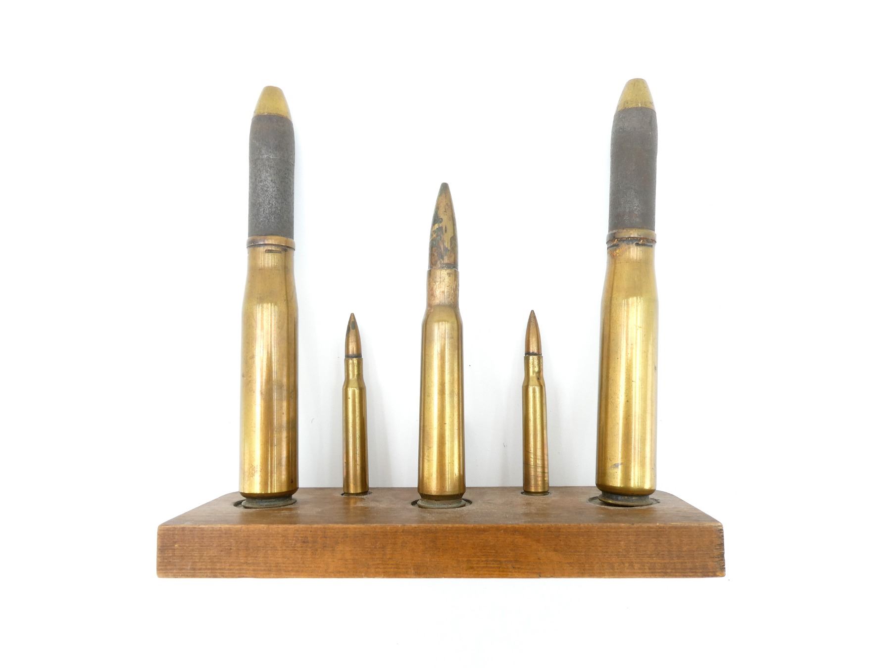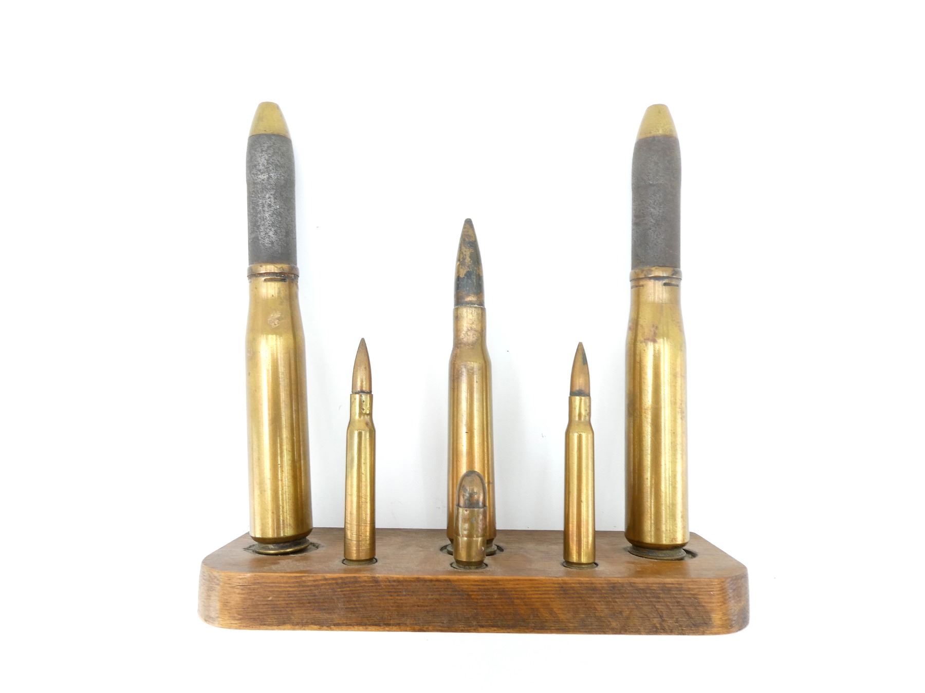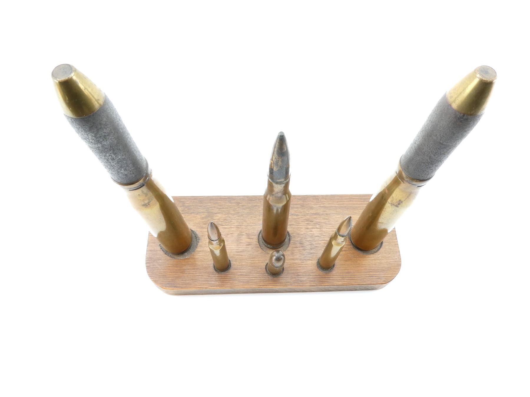 LOT INCLUDES; (2) 20MM MKII ROUNDS, (1) .5" VICKERS ROUND, (2) .303 ENFIELD ROUNDS & (1) .455 PISTOL ROUND ALL AFFIXED TO WOODEN BASE, VARIOUS MARKINGS ON BOTTOM OF ROUNDS, NO PRIMERS, ALL WITH PROJECTILES, BRASS NOSES OF 20MM MKII ROUNDS WITH VARIOUS MARKINGS, APPROX. 8" X 3 1/8" X 8 1/8". SEE PHOTOS.