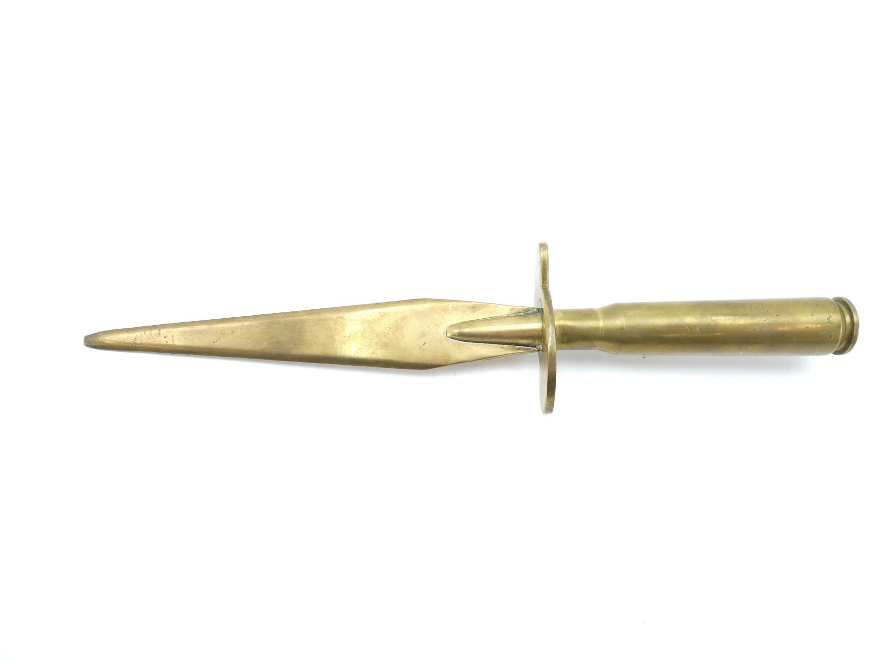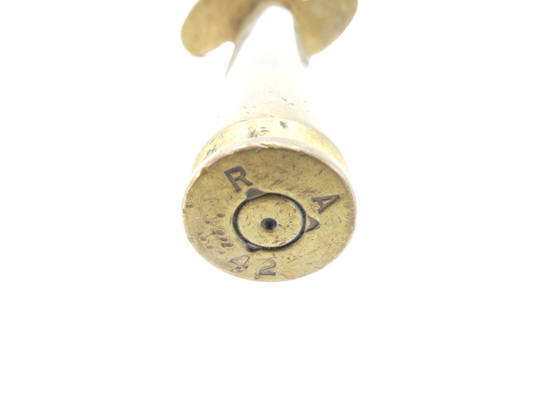 (1) .50 M2 CARTRIDGE TRENCH ART LETTER OPENER, FIRED PRIMER, BOTTOM MARKED: "RA 42", ALL BRASS CONSTRUCTION, NO OTHER VISIBLE MARKINGS, BLADE APPROX. 6.25" & OVERALL LENGTH APPROX. 10.25". SEE PHOTOS.