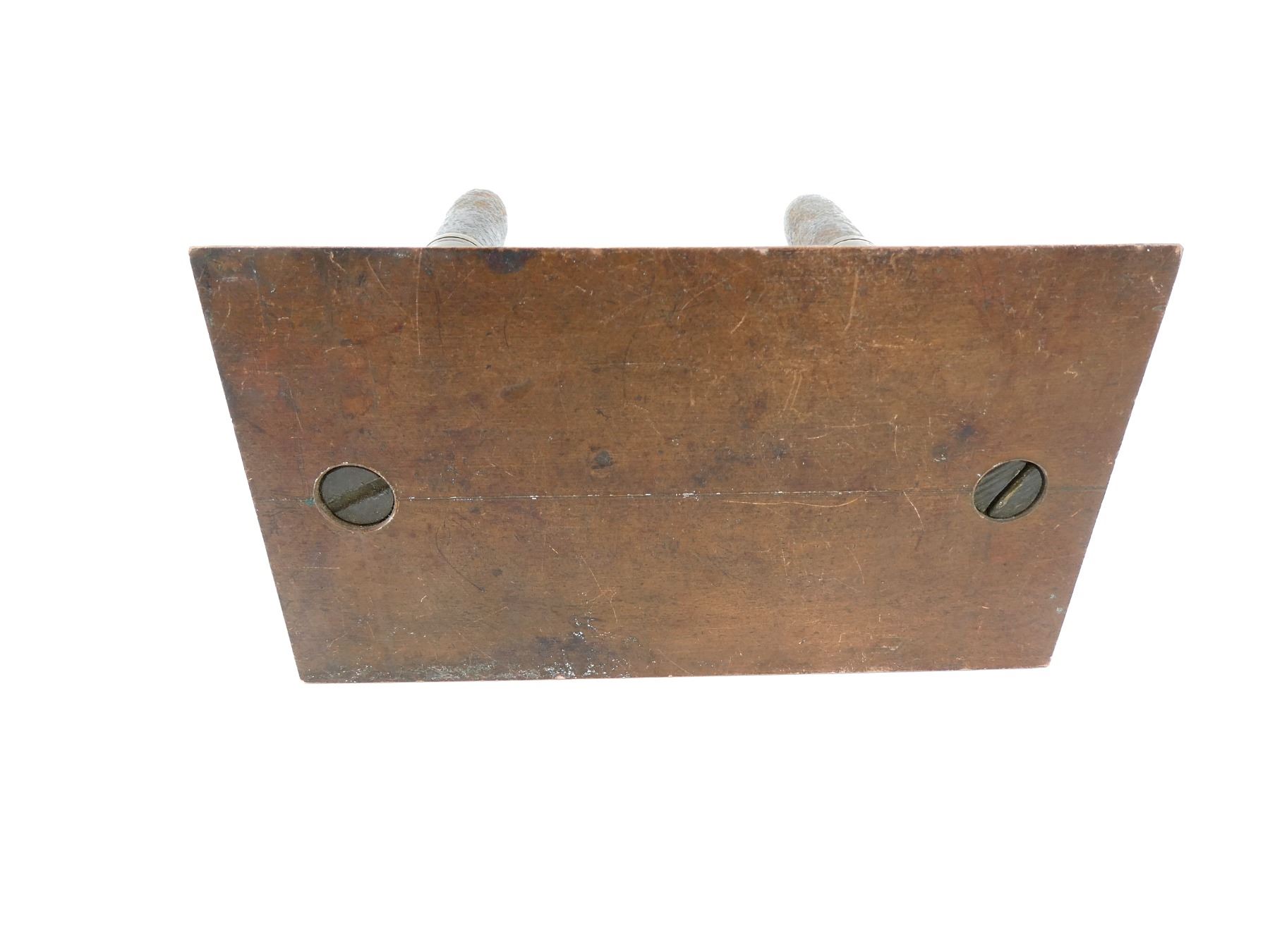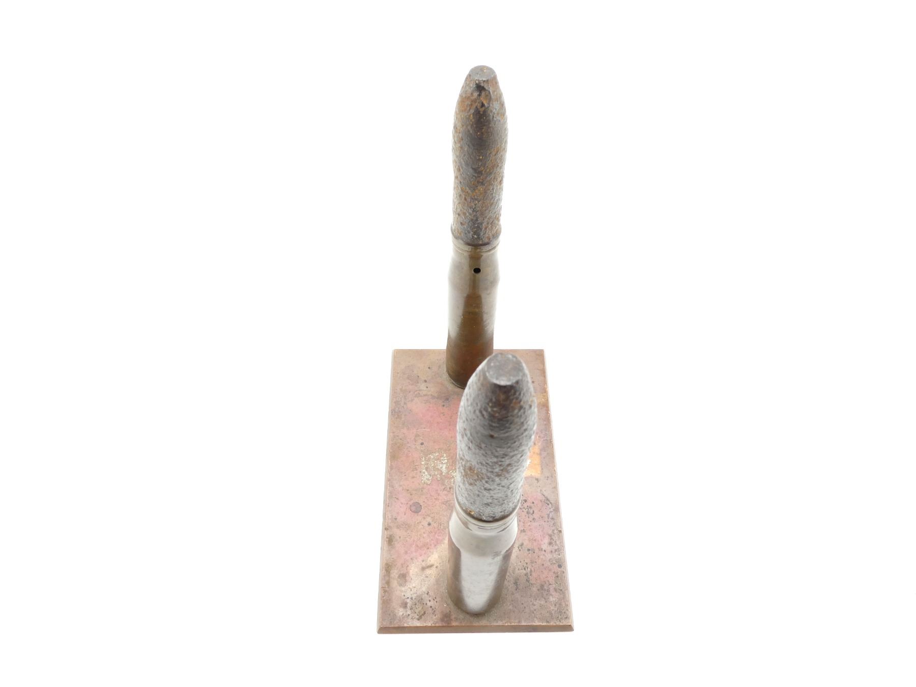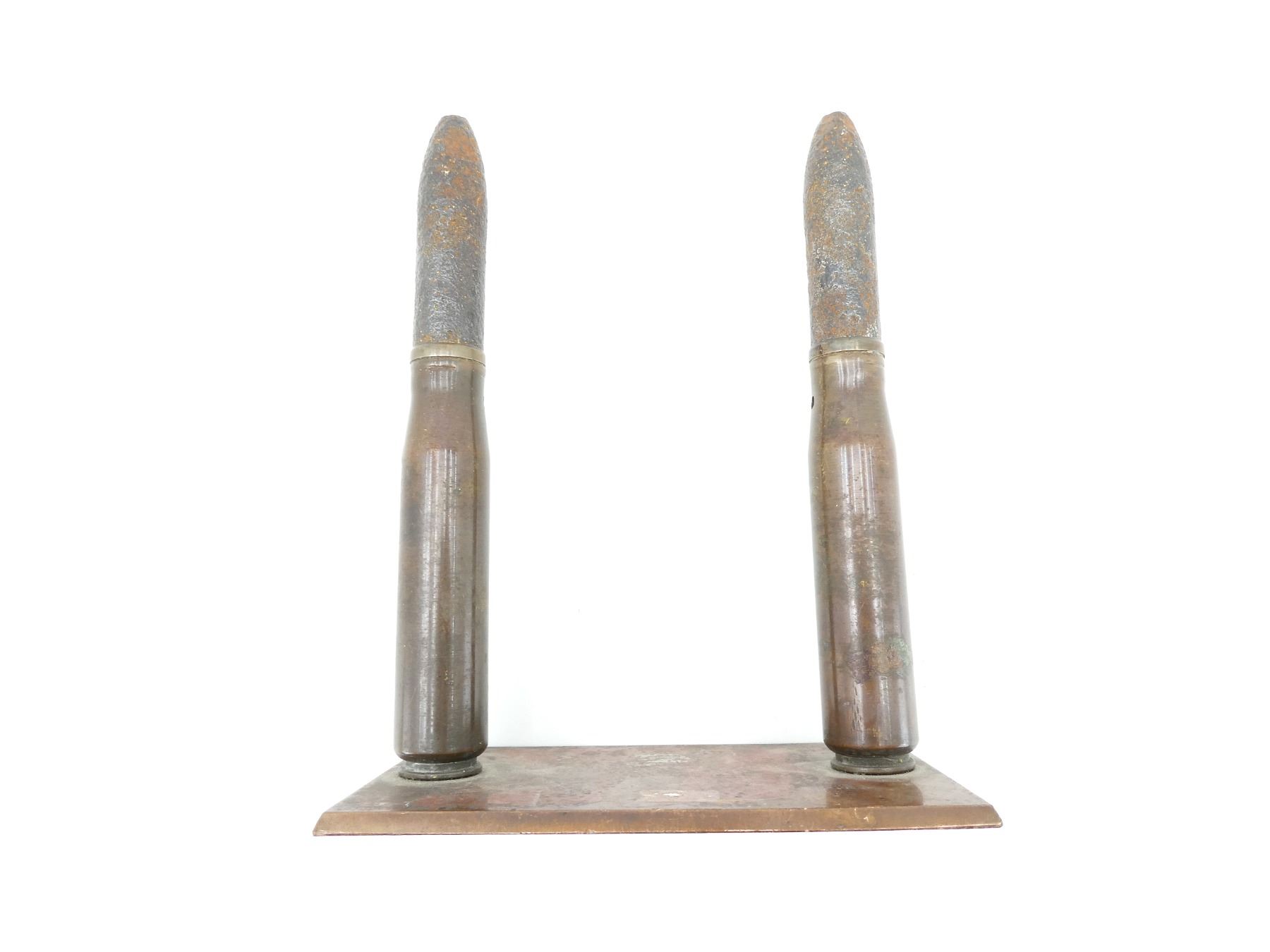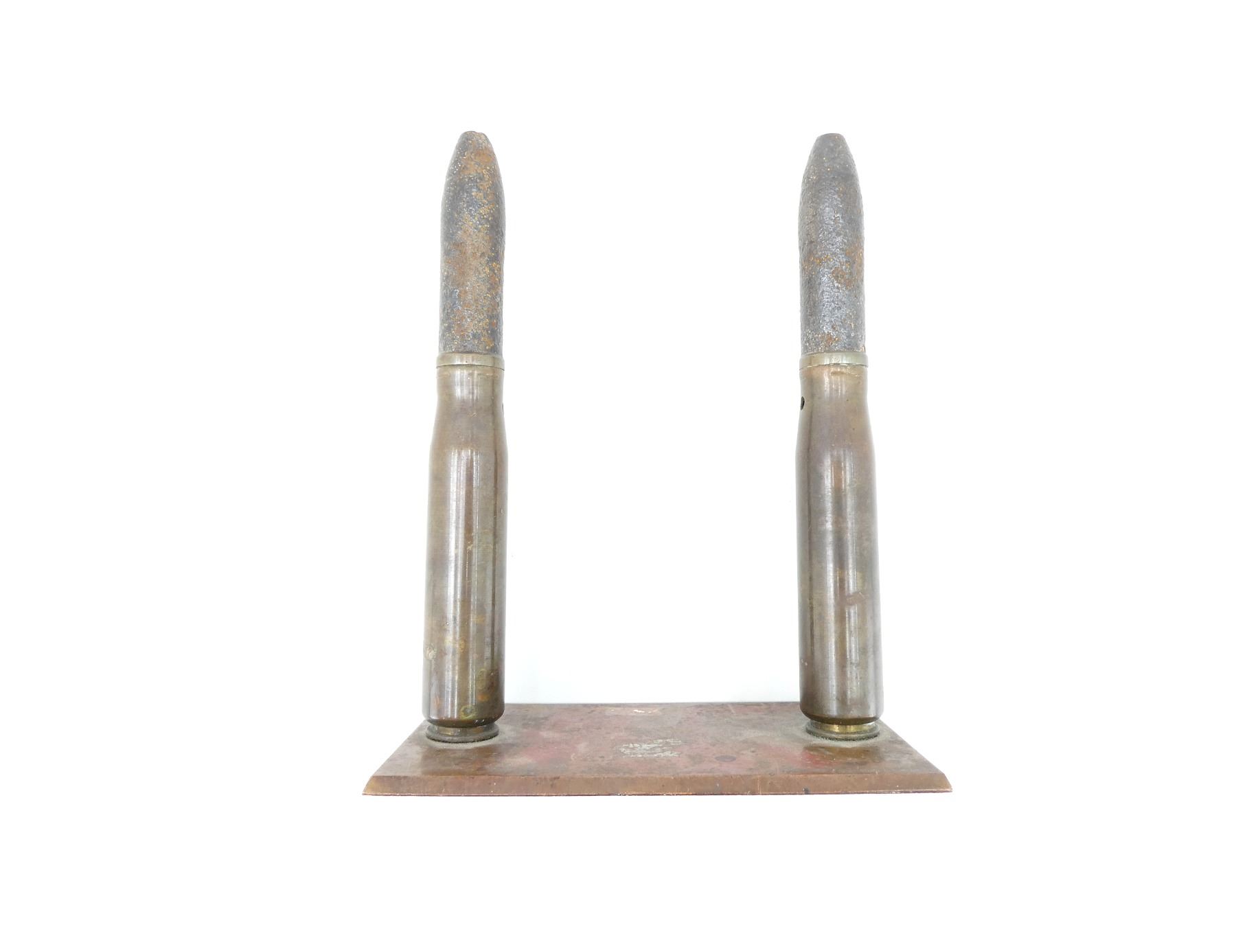 (1) 20MMX110MM CANNON ROUND TRENCH ART, TWO CANNON ROUNDS AFFIXED TO BASE, BRASS CASINGS WITH STEEL PROJECTILES ATTACHED, NO VISIBLE MARKINGS ON ROUNDS / BASE, COPPER BASE, APPROX. 5 7/8" X 3.5" X 7 5/8". SEE PHOTOS.