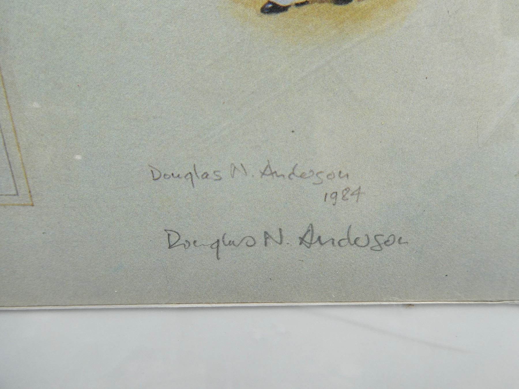 (1) BY DOUGLAS N. ANDERSON, SIGNED BY ARTIST, UNDER PLASTIC, GOLD COLOURED PLASTIC FRAME, APPROX. 24.25" X 18.25". SEE PHOTOS.