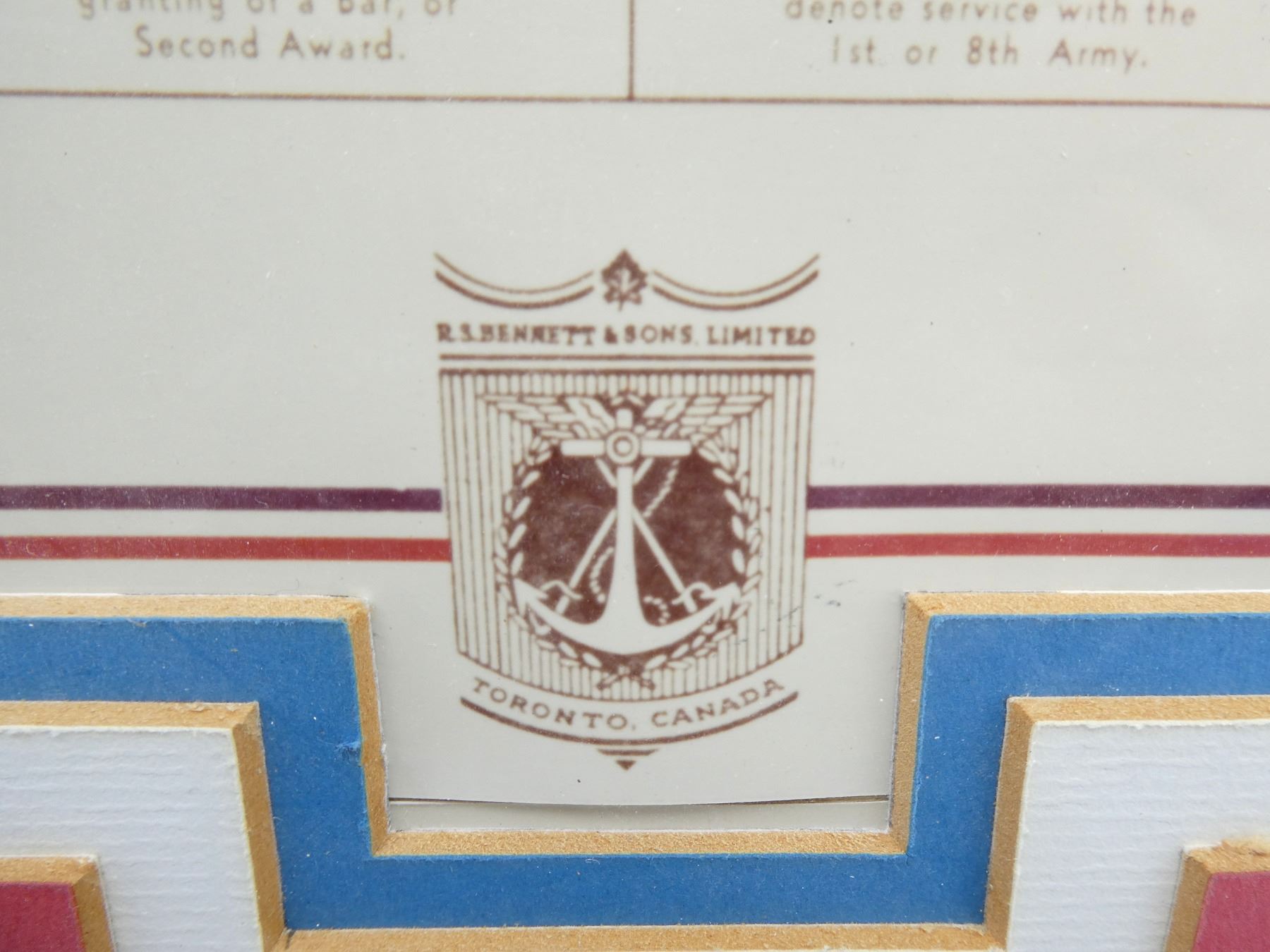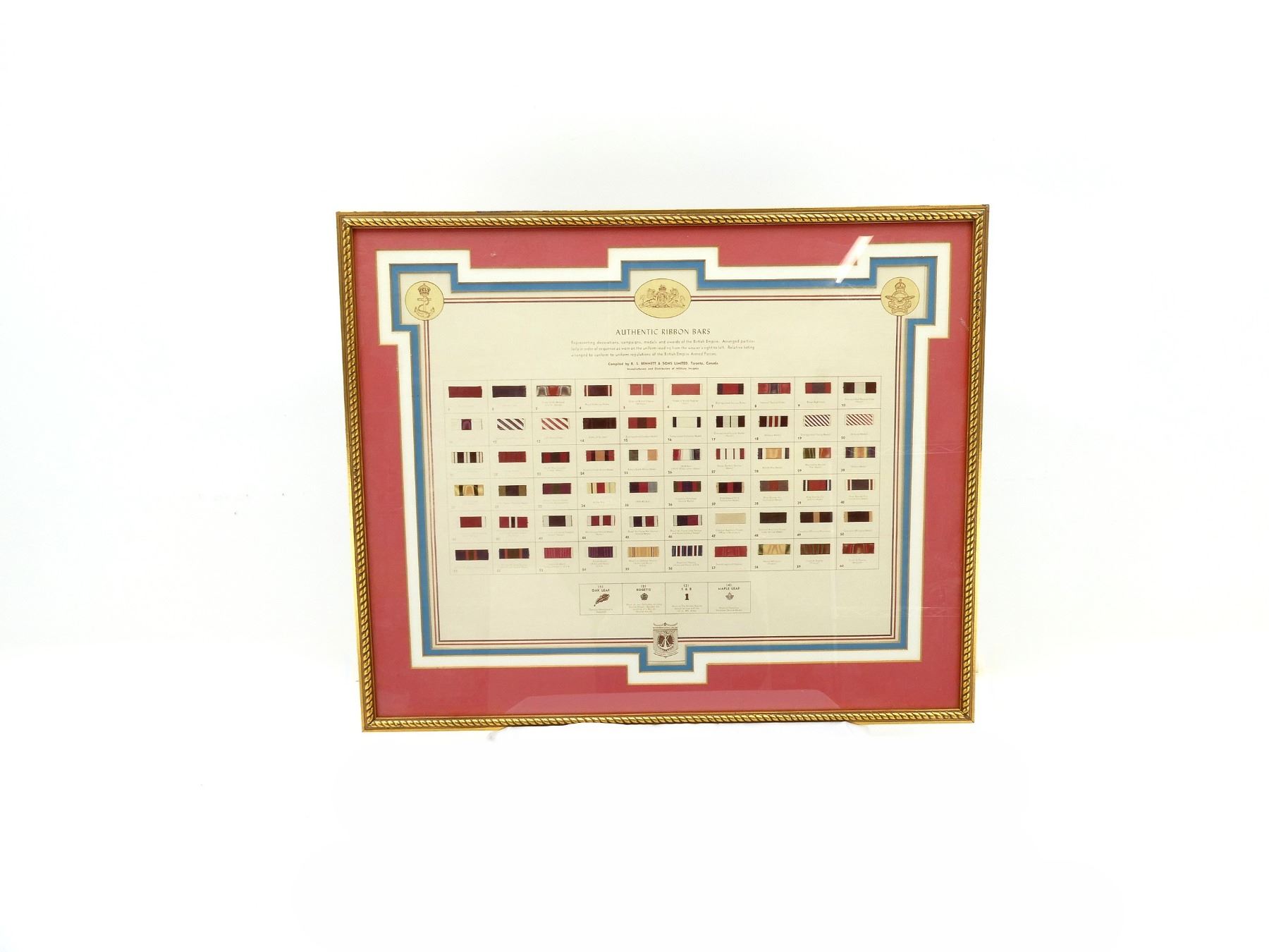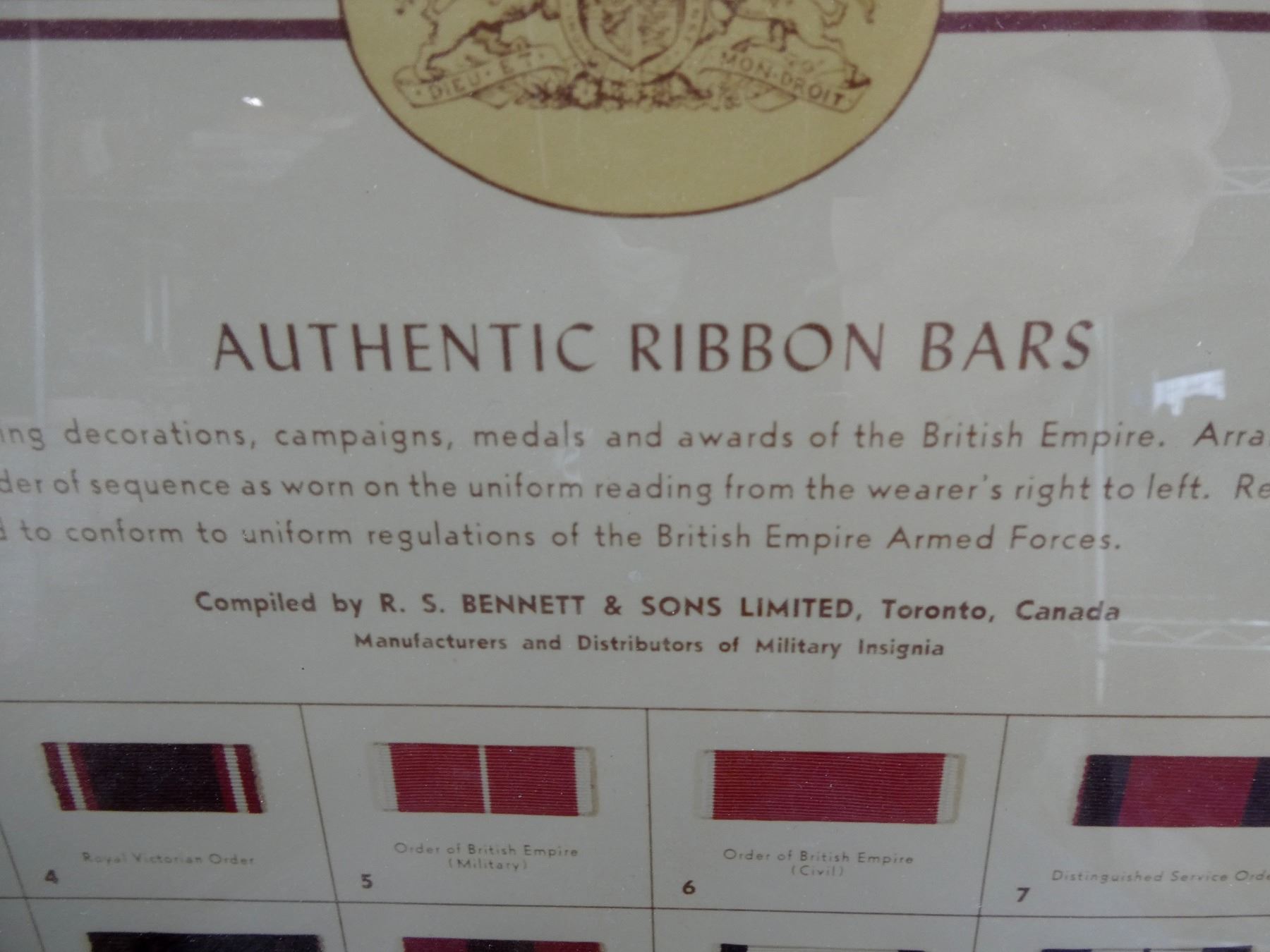 (1) COMPILED BY R. S. BENNET & SONS LIMITED, TORONTO, CANADA, MARKED: "AUTHENTIC RIBBON BARS, REPRESENTING DECORATIONS, CAMPAIGNS, MEDALS AND AWARDS OF THE BRITISH EMPIRE" ETC., GOLD PAINTED WOOD AND/OR PLASTIC FRAME, UNDER GLASS, APPROX. 24.5" X 20.25". SEE PHOTOS. *NO GUARANTEE ON GLASS FOR SHIPPING*