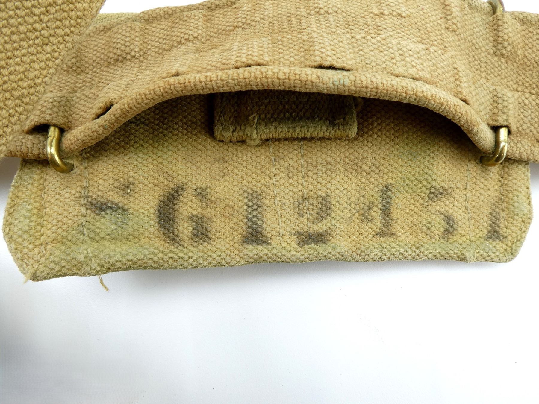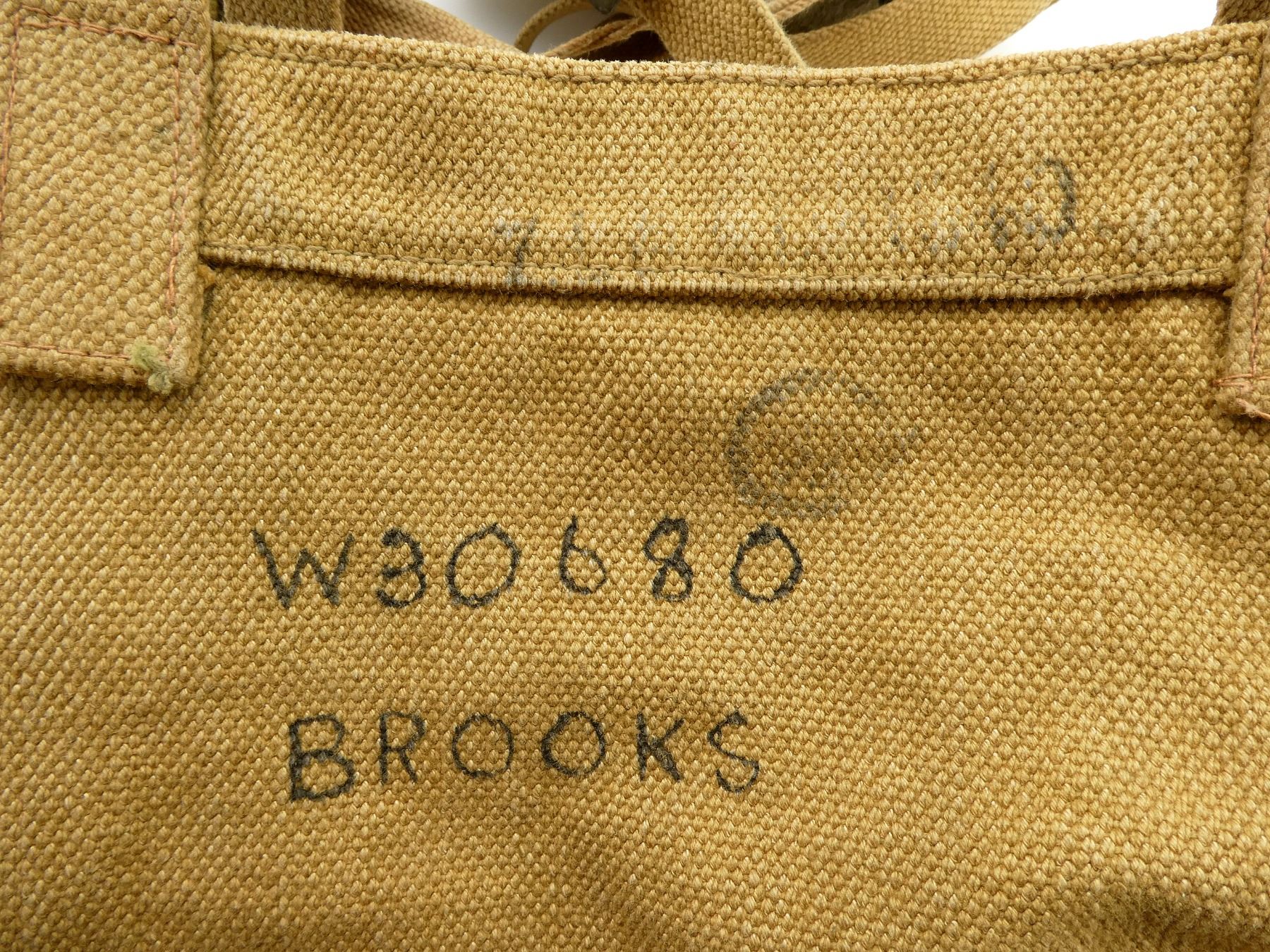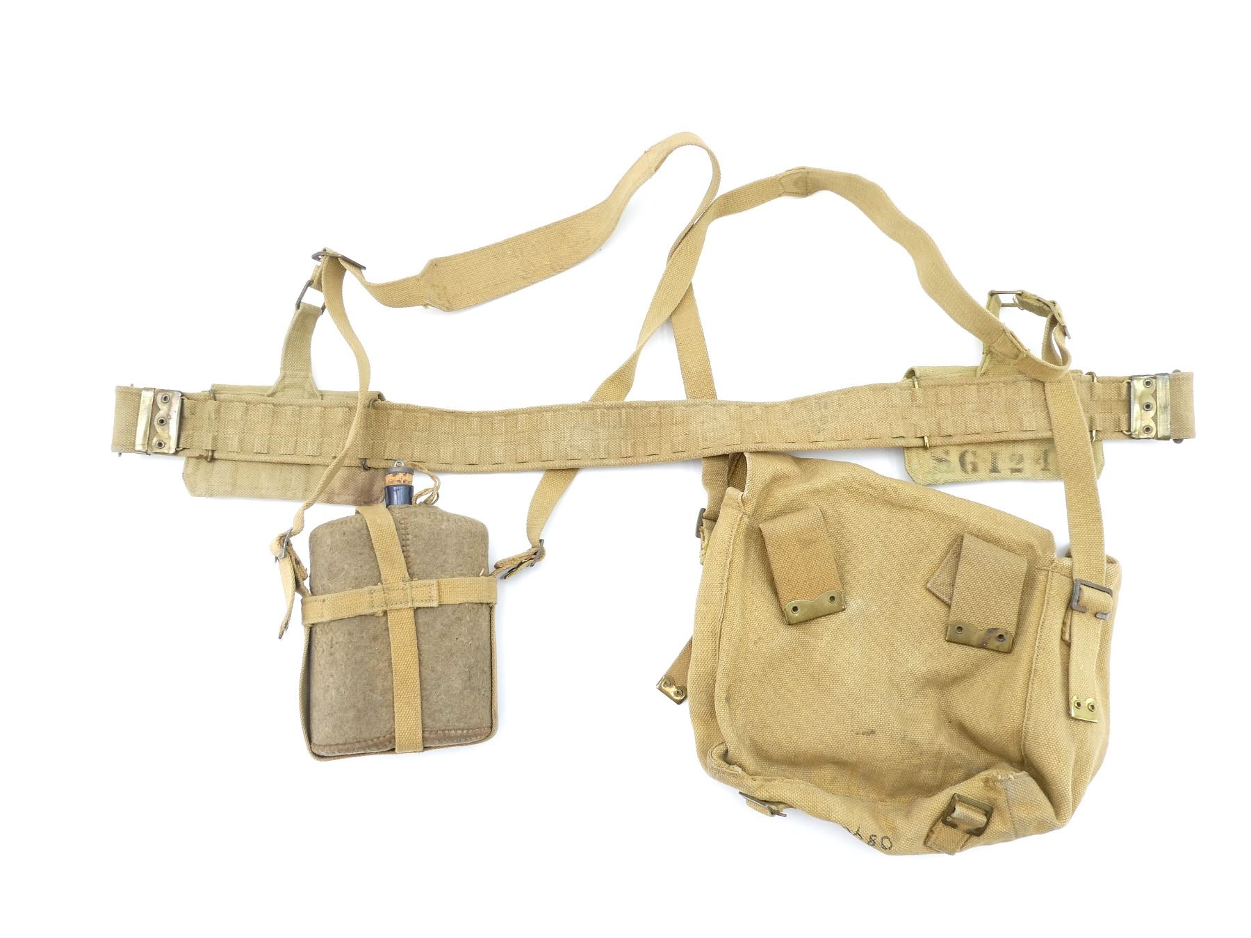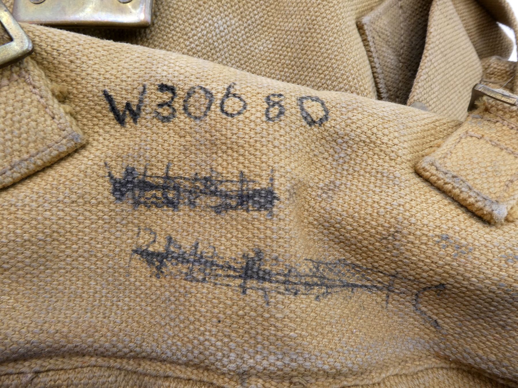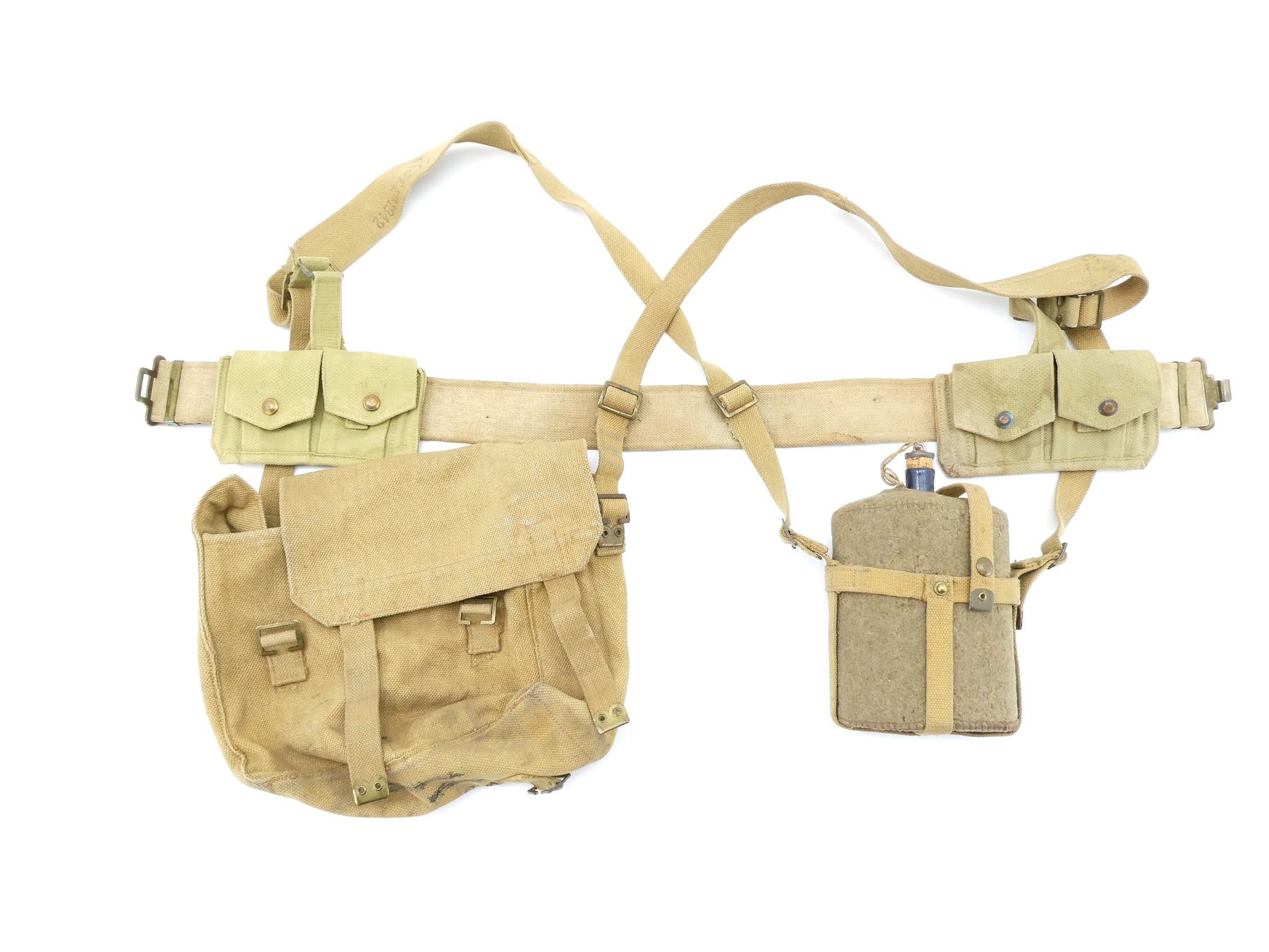 LOT INCLUDES; (1) TAN P37 WEB BELT WITH FAINT / UN-CLEAR MARKINGS, OVERALL LENGTH APPROX. 39", ADJUSTABLE, (2) TAN P37 WEB SHOULDER STRAPS, ONE MARKED: "Z.L.&T.LTD 1942, L" WITH C-BROAD ARROW, OTHER MARKED WITH FAINT C-BROAD ARROW, (1) TAN P37 WEB FIELD PACK, FAINTLY MARKED: "Z.L.&T.LTD 1940" WITH C-BROAD ARROW, HAND-WRITTEN MARKING: "W30680, BROOKS", VARIOUS HAND-WRITTEN MARKINGS ON BOTTOM OF PACK, (2) LEE ENFIELD TAN P37 WEB AMMO POUCHES, 2-POCKET WITH METAL BELT HOOKS, ONE MARKED: "SG12451" WITH C-BROAD ARROW, OTHER HAS NO VISIBLE MARKINGS & (1) TAN WOOL / FELT COVERED BLUE ENAMELED METAL CANTEEN WITH CORK / METAL STOP, BOTTOM MARKED WITH C-BROAD ARROW, TAN P37 WEB SKELETON CARRIER MARKED: "2060", "Z.L.&T.LTD" WITH C-BROAD ARROWS, ALL SHOWS AGE / WEAR. SEE PHOTOS.