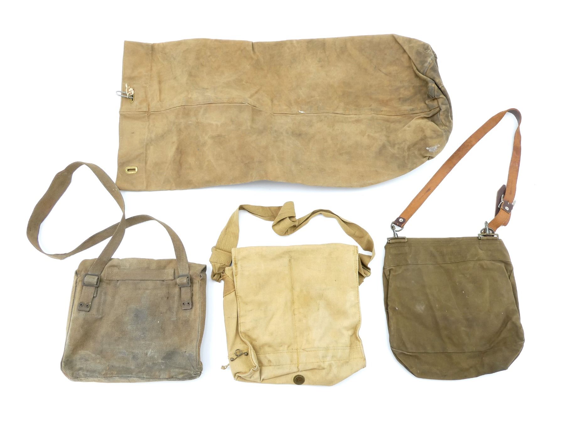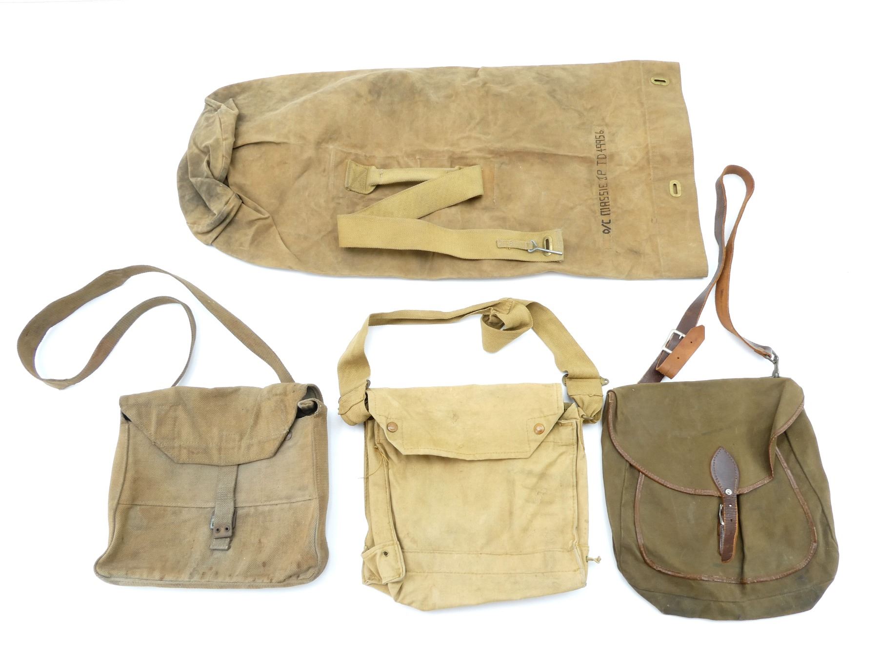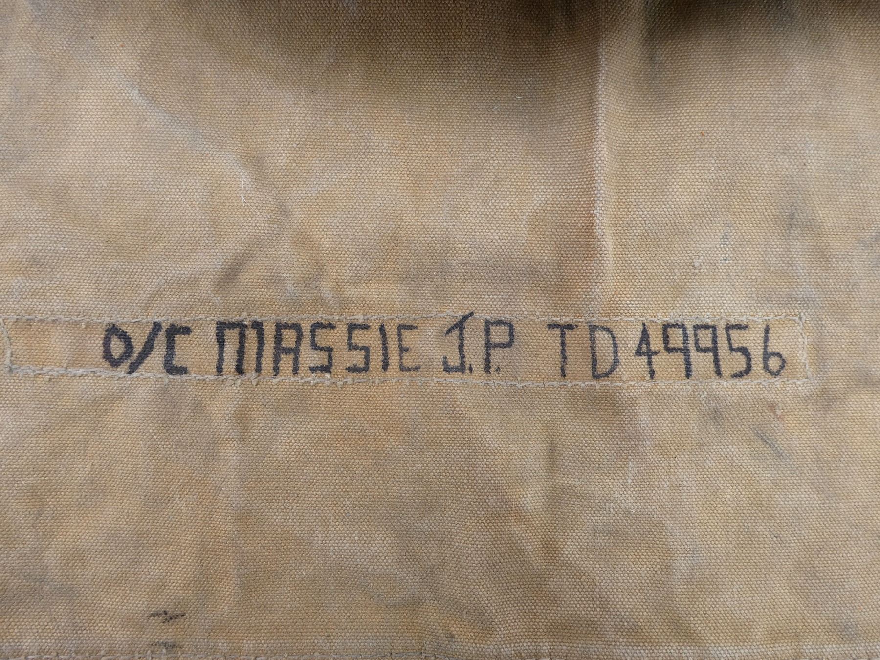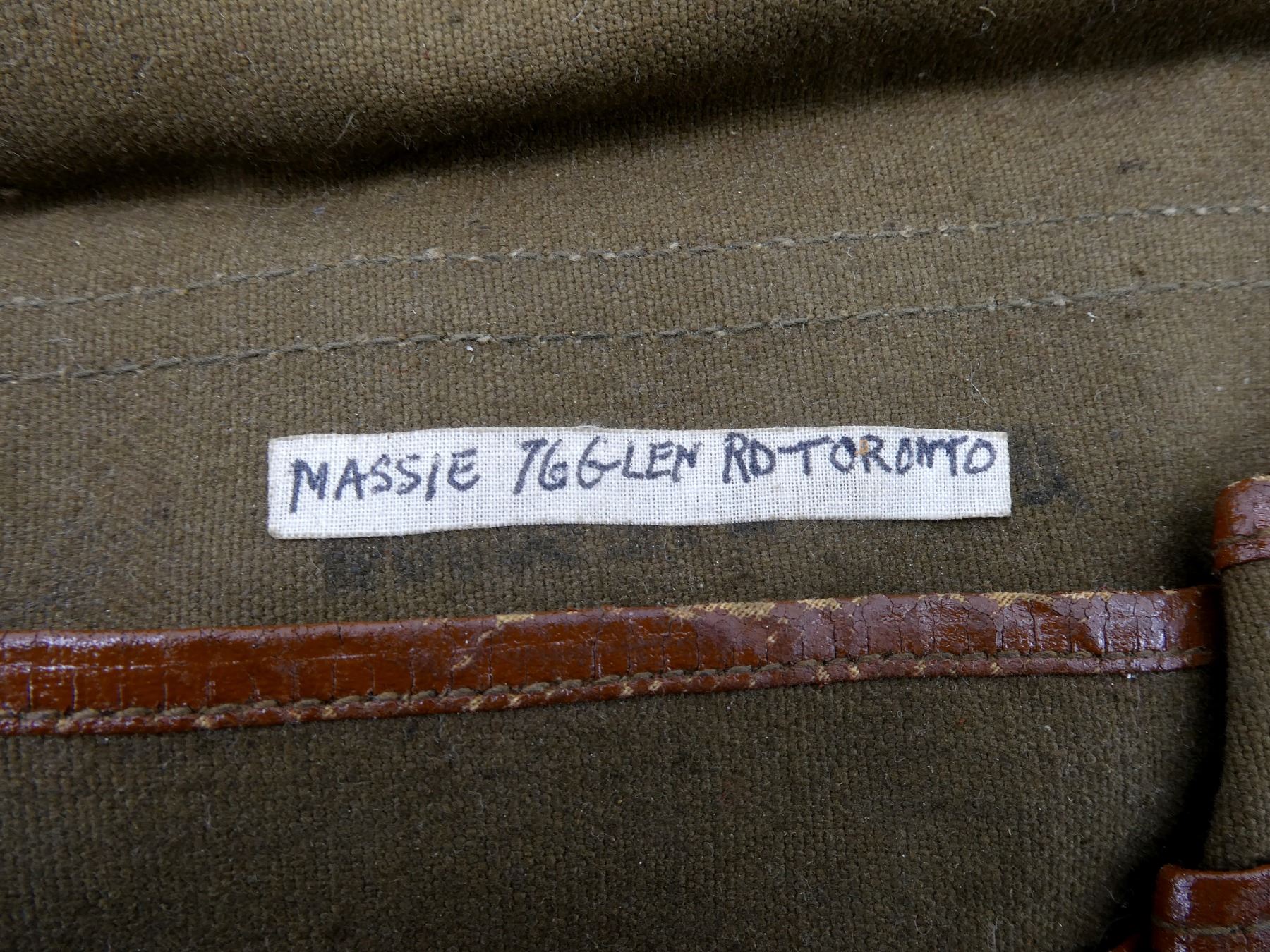 LOT INCLUDES; (1) TAN CANVAS GAS MASK BAG, MARKED: "VII, S.S. HOLDEN LTD., OTT??? ???ADA" WITH C-BROAD ARROW, TAN CANVAS SHOULDER STRAP, BRASS FITTINGS, VARIOUS POCKETS, SHOWS AGE / WEAR, (1) TAN P37 WEB FIELD PACK, MARKED: "Z.L.&T.LTD, 1944" WITH C-BROAD ARROW, WITH P37 WEB SHOULDER STRAP, NO VISIBLE MARKINGS, SHOWS AGE / WEAR, (1) TAN CANVAS DUFFLE BAG, MARKED WITH C-BROAD ARROW OVER "243" INSIDE, HAND-WRITTEN MARKED: "O/C MASSIE J.P. TD49956", P37 WEB SHOULDER STRAP / CARRY HANDLE, SHOWS AGE / WEAR, OVERALL LENGTH APPROX. 33" & (1) BROWN CANVAS / LEATHER SIDE BAG, BAG MARKED: "AMMUNITION" ON BACK, "MALCOLM MASSIE" INK STAMPED IN VARIOUS PLACES, NAME TAG MARKED: "MASSIE TGGLEN RD TORONTO", LEATHER SHOULDER STRAP MARKED: "MALCOLM MASSIE". SEE PHOTOS.