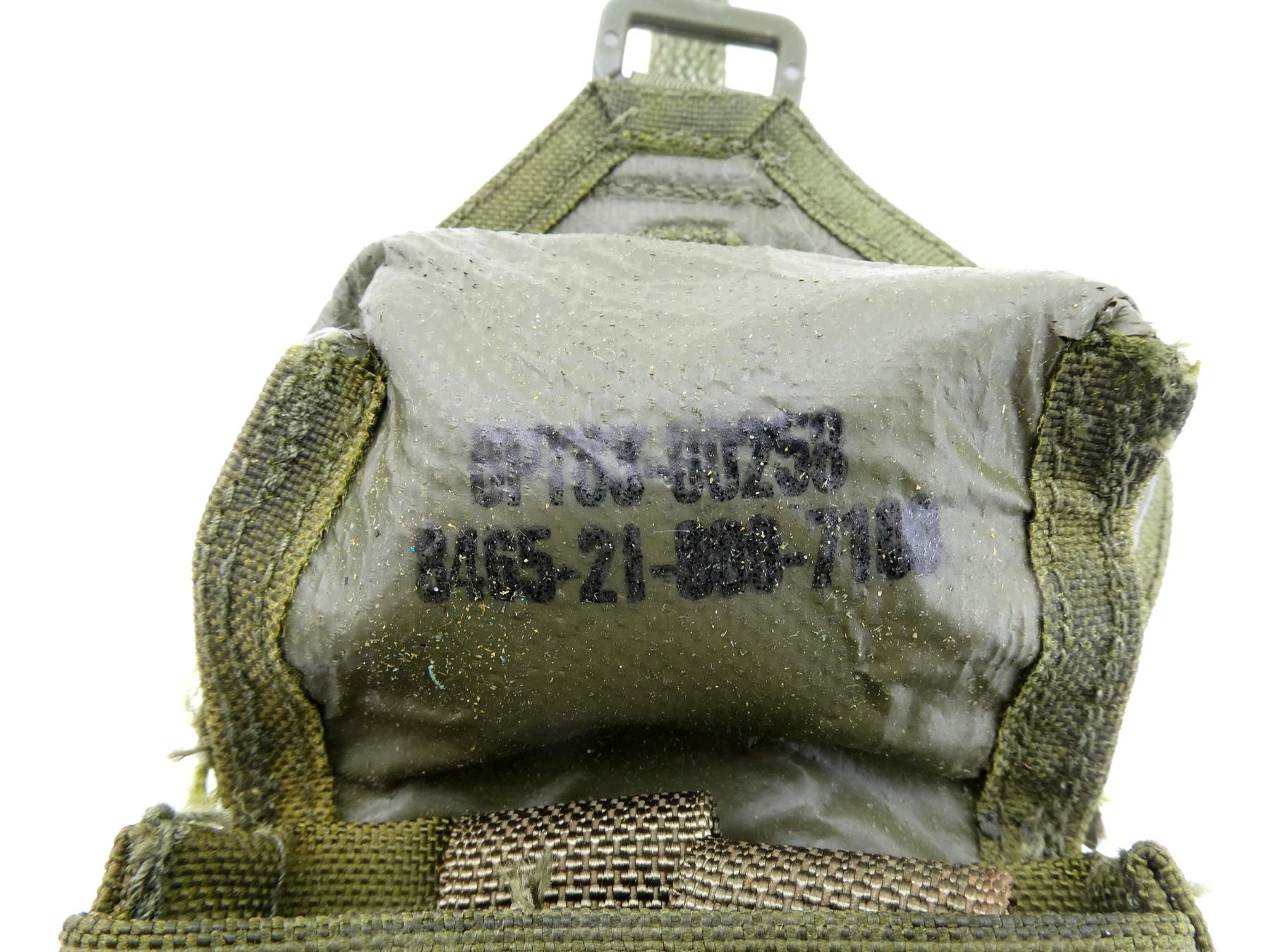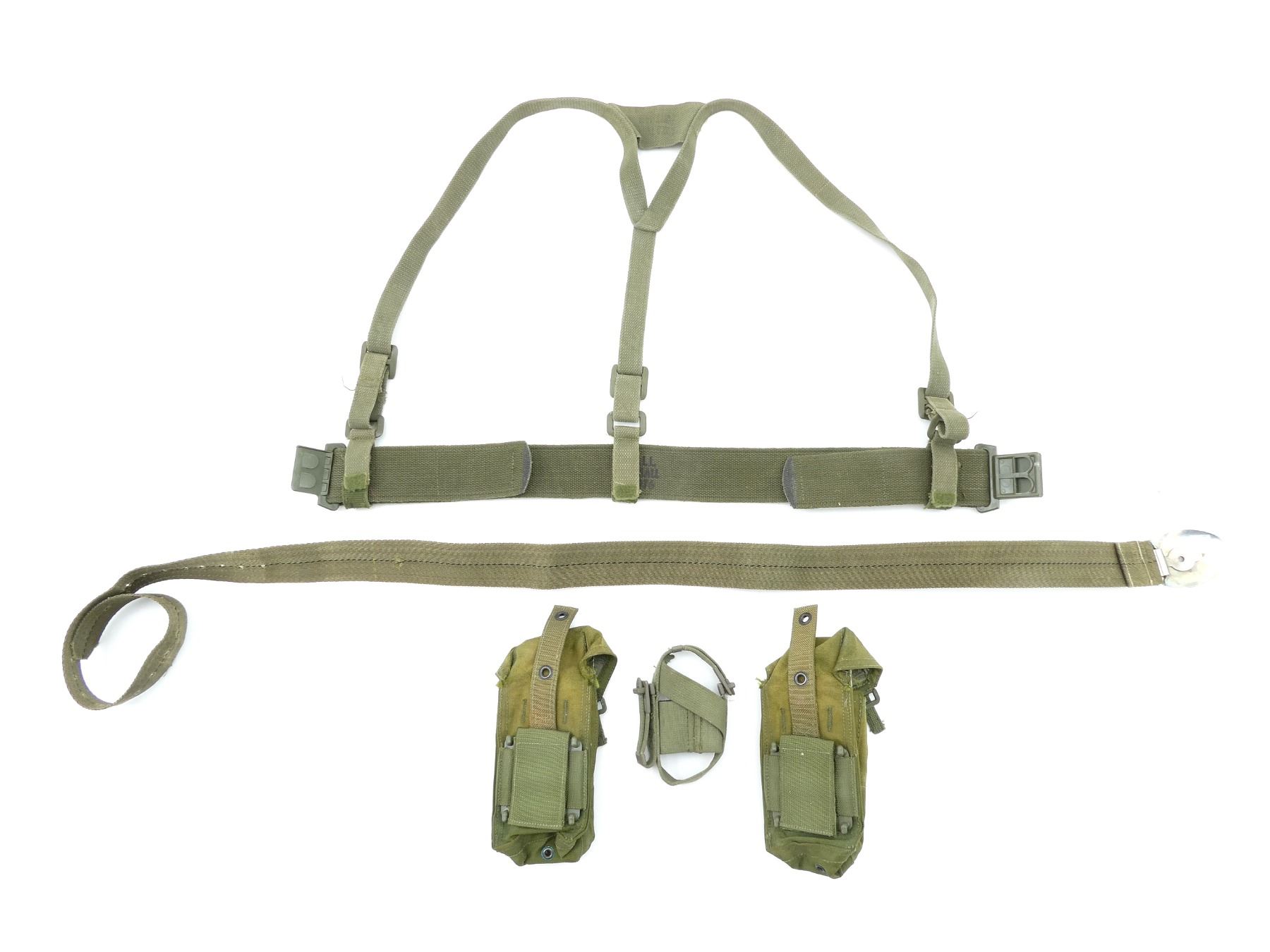 LOT INCLUDES; (2) GREEN NYLON C7 MAG POUCHES, 82 PATTERN, HOLDS 2 MAGS, VARIOUS MARKINGS ON UNDER SIDE OF FLAPS, VELCRO BELT BUCKLES, SHOWS AGE / WEAR, (1) GREEN WEB BELT WITH SHOULDER STRAPS, VELCRO SIDES, BELT MARKED: "T.I.L., SMALL, 1976", VARIOUS FAINT / UN-CLEAR MARKINGS ON STRAPS, OVERALL LENGTH APPROX. 30.25", ADJUSTABLE, (1) GREEN CANVAS GRENADE CARRIER, PLASTIC FITTINGS, NO VISIBLE MARKINGS & (1) GREEN NYLON BELT WITH ROYAL CANADIAN ARMY CADET BELT BUCKLE, NO VISIBLE MARKINGS, OVERALL LENGTH APPROX. 60.75", ADJUSTABLE. SEE PHOTOS.