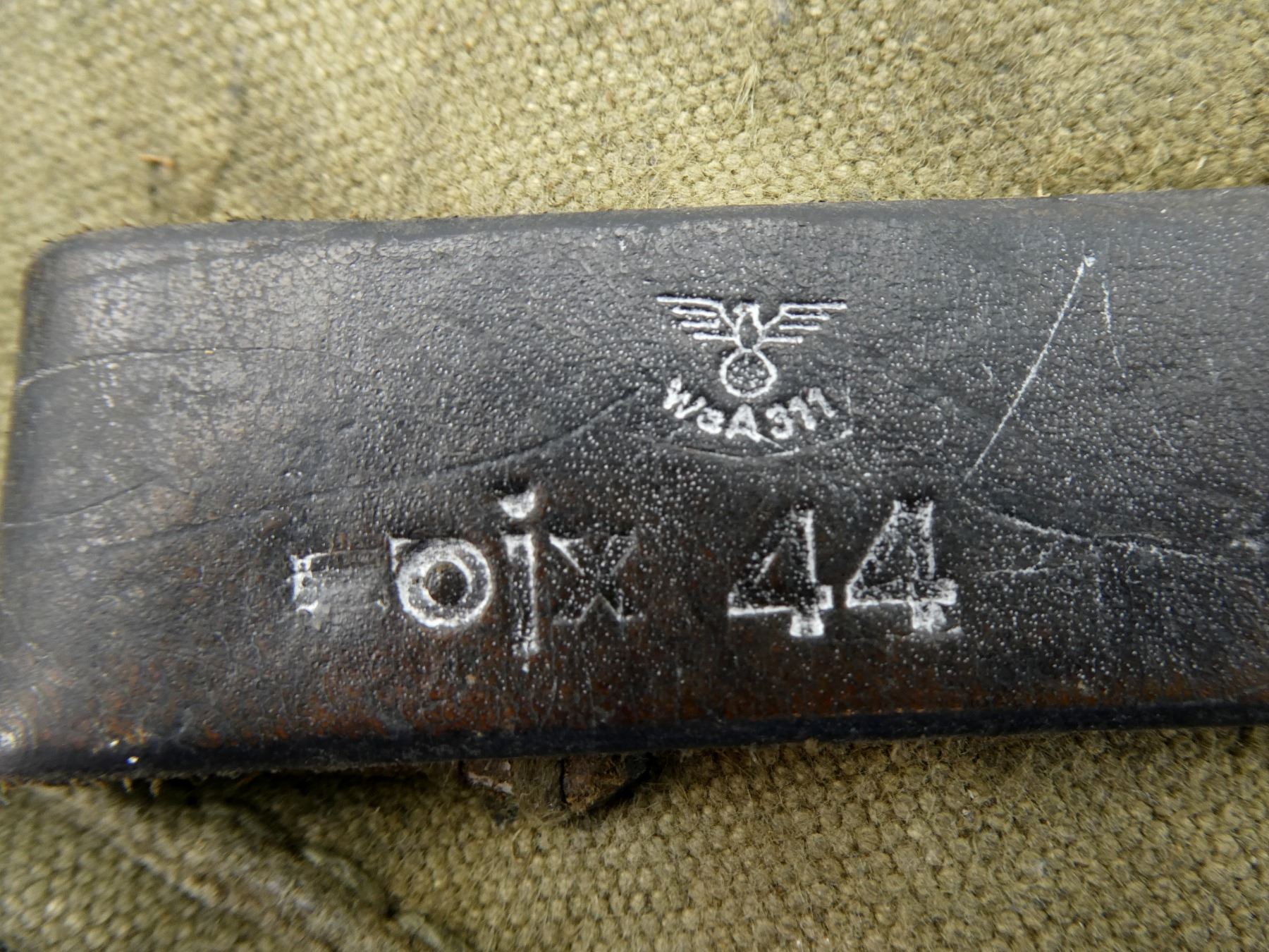 LOT INCLUDES; (2) MP44 MAG POUCHES, FITS 7.92 KURZ / STURMGEWEHR 44 MAGS, LEFT & RIGHT POUCH, 3-POCKETS, GREEN CANVAS / LEATHER, STEEL FITTINGS, BELT LOOPS ON BACK OF ONE MARKED: "STG 44", EAGLE SYMBOL "WAA311", "OIX 44", BELT LOOPS ON BACK OF OTHER POUCH MARKED: "STG 44", EAGLE SYMBOL "WAA???", "OIX 44", SHOWS AGE / WEAR. SEE PHOTOS.